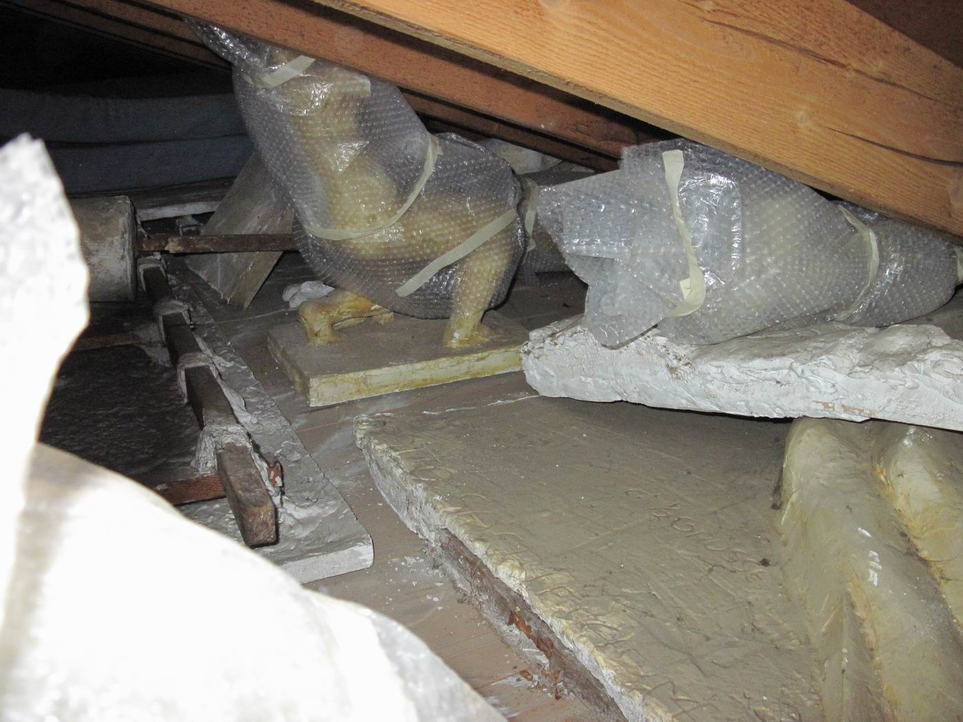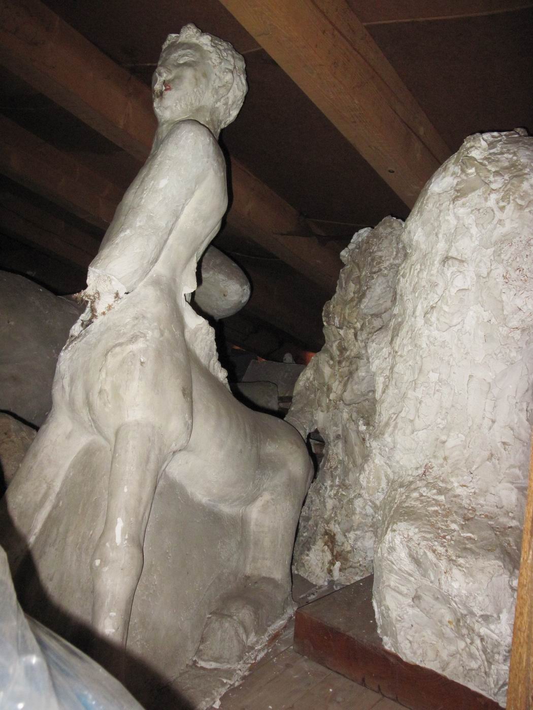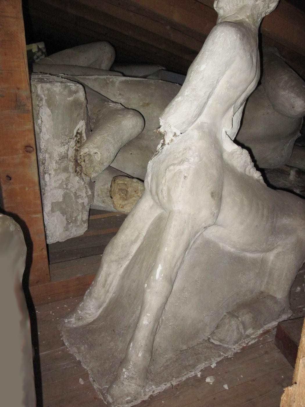 | Nach Aussage eines Mitarbeiters der Betreiberorganisation des Depots mussten die kopflosen Figuren im Auftrage des für die Einlagerung verantwortlichen Behördenfunktionärs des Einlagerungskantons vom genannten Mitarbeiter geköpft und die Köpfe dem Auftraggeber ausgehändigt werden. Nachforschungen haben ergeben, dass die behördliche Funktion, welche der genannte Funktionär inne zu haben angegeben hatte oder dritte für ihn angegeben hatten, damals gar nicht existiert hat und dass daher die gemachte Vorgabe einer behördlichen Funktion gar nicht Rechtens war. Nach Auskunft einer juristisch gebildeten Person lag hier mutmaßlich so etwas wie "Amtsaneignung" oder "Aneignung einer staatlichen Funktion" vor. Jedenfalls sind die vormals vorhandenen Köpfe der Gips-Modelle (Abguss-Vorlagen) heute abgeschnitten und zusammen mit weiteren Figuren verschwunden. Es ist zu vermuten, dass so etwas in einem Rechtsstaate nicht ohne Konsequenzen möglich gewesen wäre. Ein weiterer Kommentar ist nicht möglich, da der Autor dieses Textes nicht alle notwendigen Informationen erhalten konnte. Jedenfalls kann hier kaum von "fachgerechter Aufbewahrung von Werken eines großen Künstlers geredet werden. (Hinweis: Die gezeigten Fotos sind teilweise nachbearbeitet. Insbesondere sind Firmenaufschriften auf dem Verpackmaterial der mit den Gipsfiguren gelagerten Waren mitsamt den Verpackungen wegretuschiert, um hier keine Werbung für Firmen oder Produkte zu machen und auch um den Gips-Modellen die zentrale Stellung in den Bildern nicht zu entziehen.) | ||
