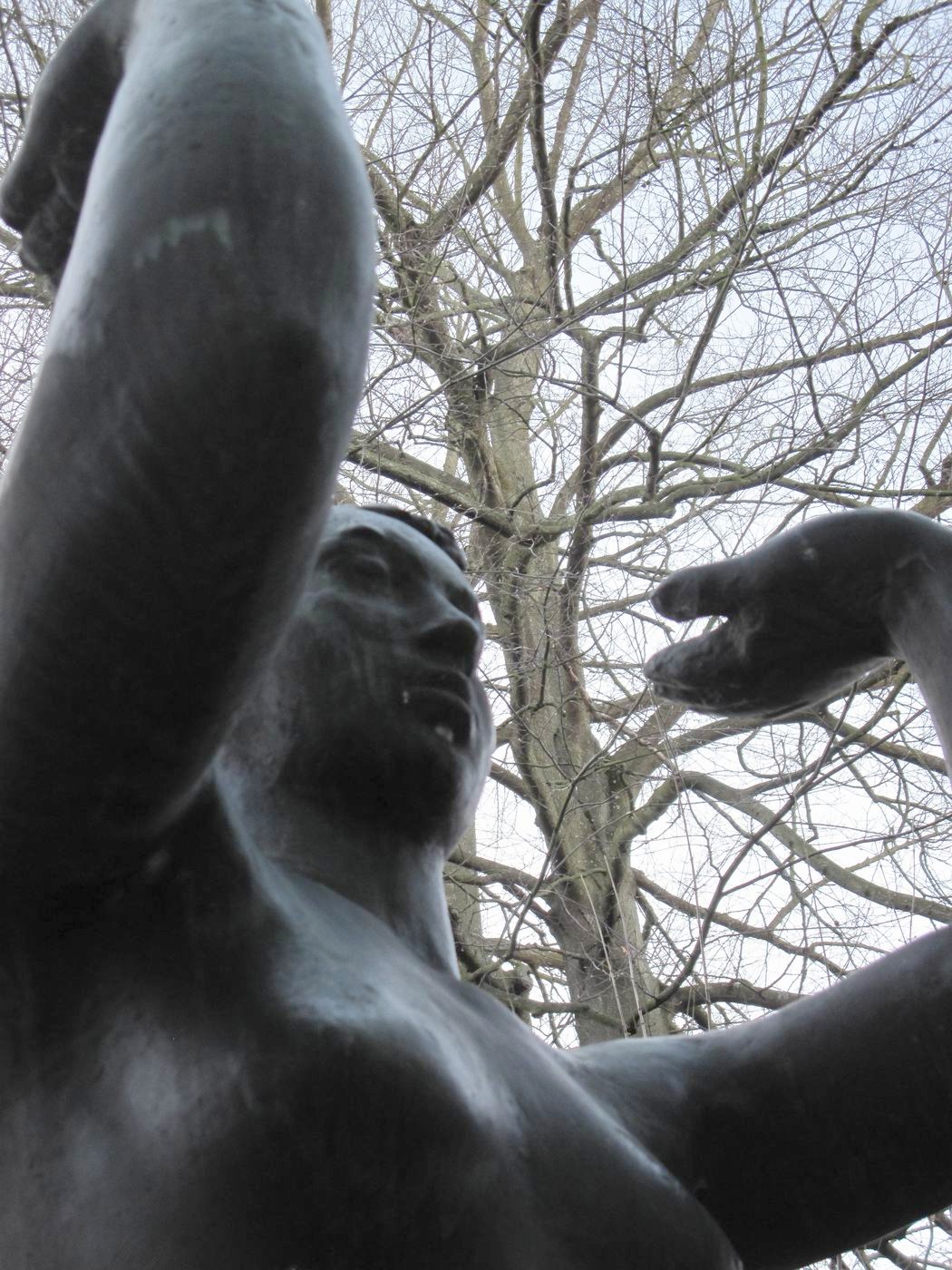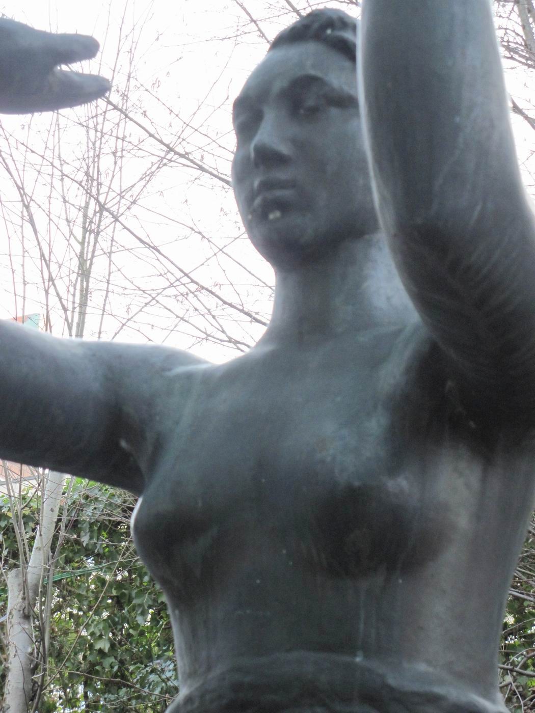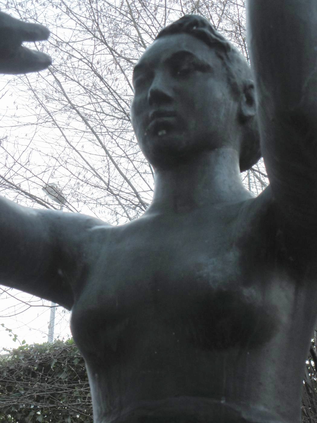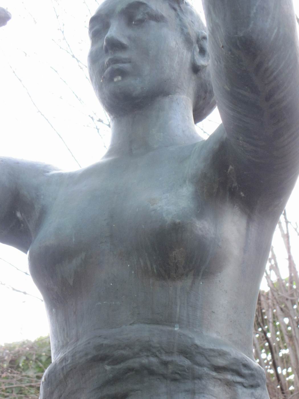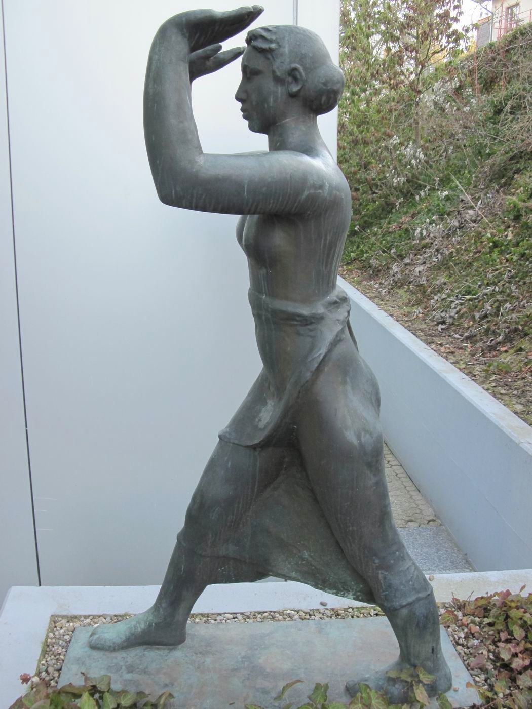 1930: Die erste Plastik einer ganzen Serie von Schreitenden. Man nennt diese Figuren "Landmädchen", "Trägerin", "Bäuerin", "Säerin", "Flora" usw. Vermutlich sind die Namen in dieser Weise gewählt worden, um der ortsansässigen Bevölkerung zu gefallen. Es ist jedoch undenkbar, dass ein Landmädchen oder eine Bäuerin damals so mit nacktem Oberkörper durch die Gegend schreiten konnte. Das hätte zu einem Mob oder einem Aufstand geführt, wie man das heute auch noch in außereuropäischen Kulturen beobachtet und in den heißen Tagesschauneuigkeiten portraitiert. Es handelt sich daher eher um eine Figur aus der Antike, wo eine solche Erscheinung die alltägliche Akzeptanz weitester Kreise genossen hatte. Der Rückfall in die Unfreiheit fand erst später statt. |