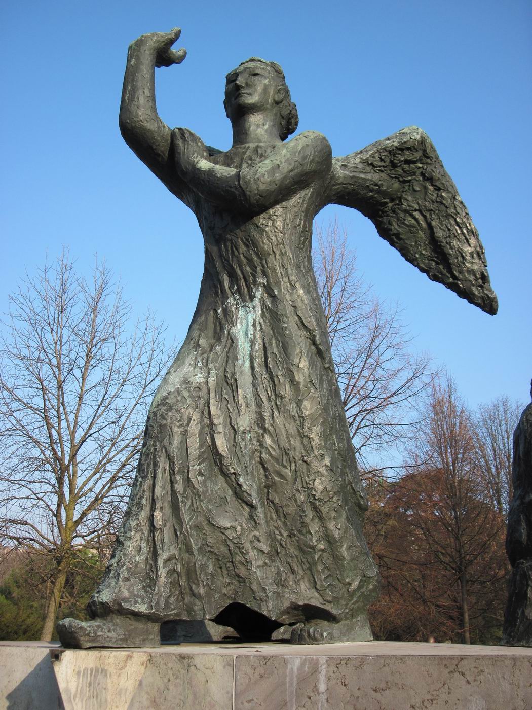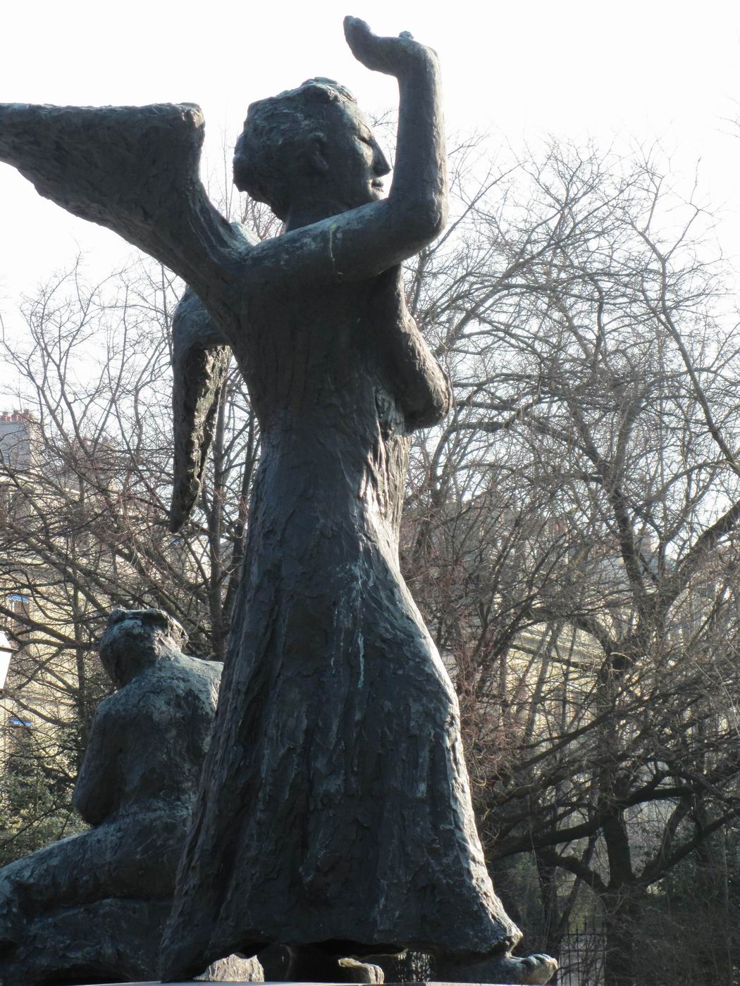 Dreigegliedert in Schutzengel (auch als Erzengel Gabriel beschrieben), Mutter mit Kindern (auch Hungernde) und sterbender Krieger