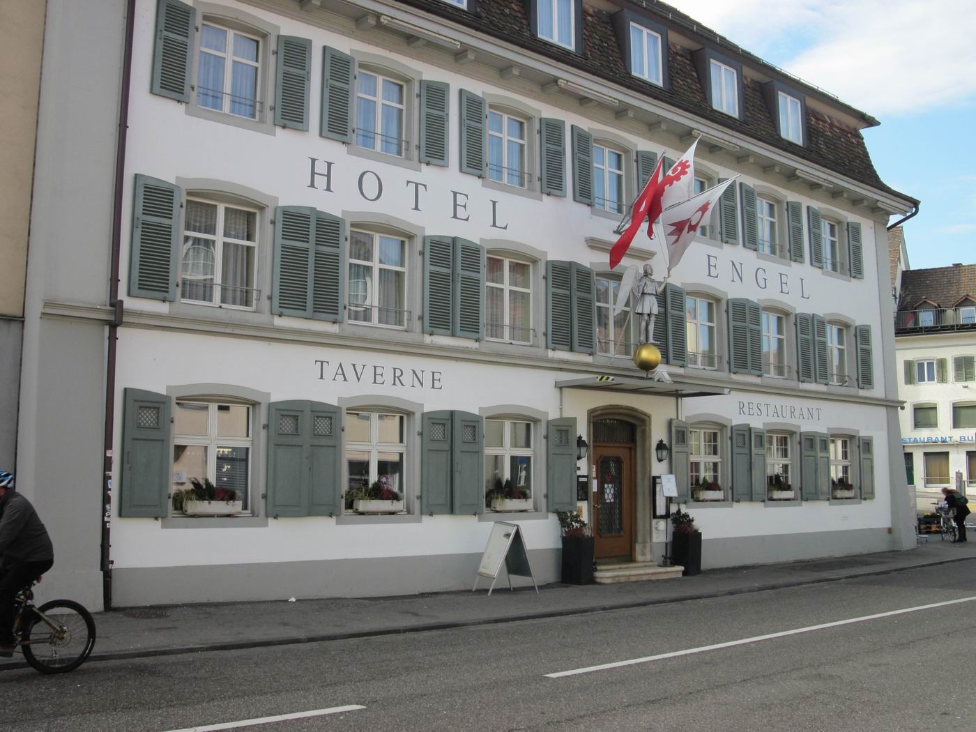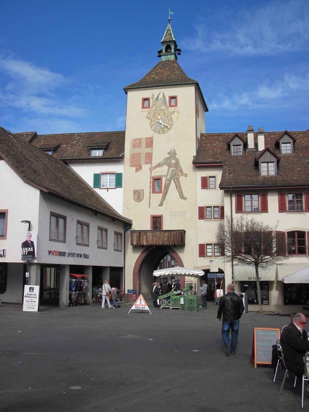 Zweite drei Bilder: Der Engel (Hotel Engel) und schräg gegenüber das Stadttor.