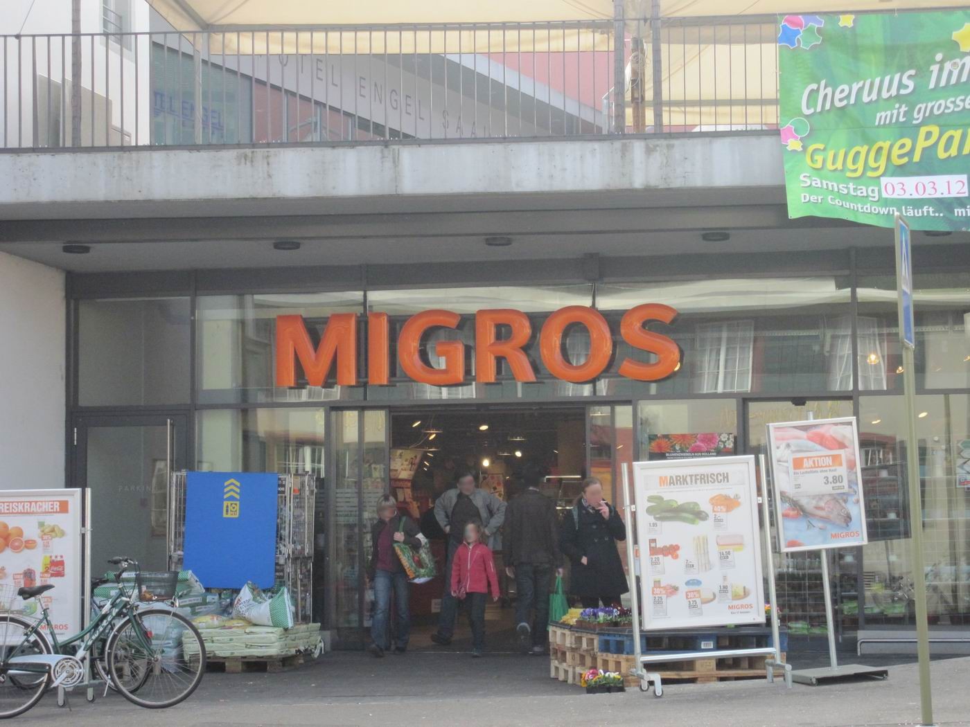 Dritte drei Bilder: Der heutige Migros-Laden am alten Standort des Friedhofs mit dem Bauernkrieg-Obelisken vom Platz vor den Stadttor aus gesehen. Die Migros ist an den Engel angebaut. Dieser befindet sich in Blickrichtung links der Migros. Rechts sieht man die alte Strasse nach Seltisberg.