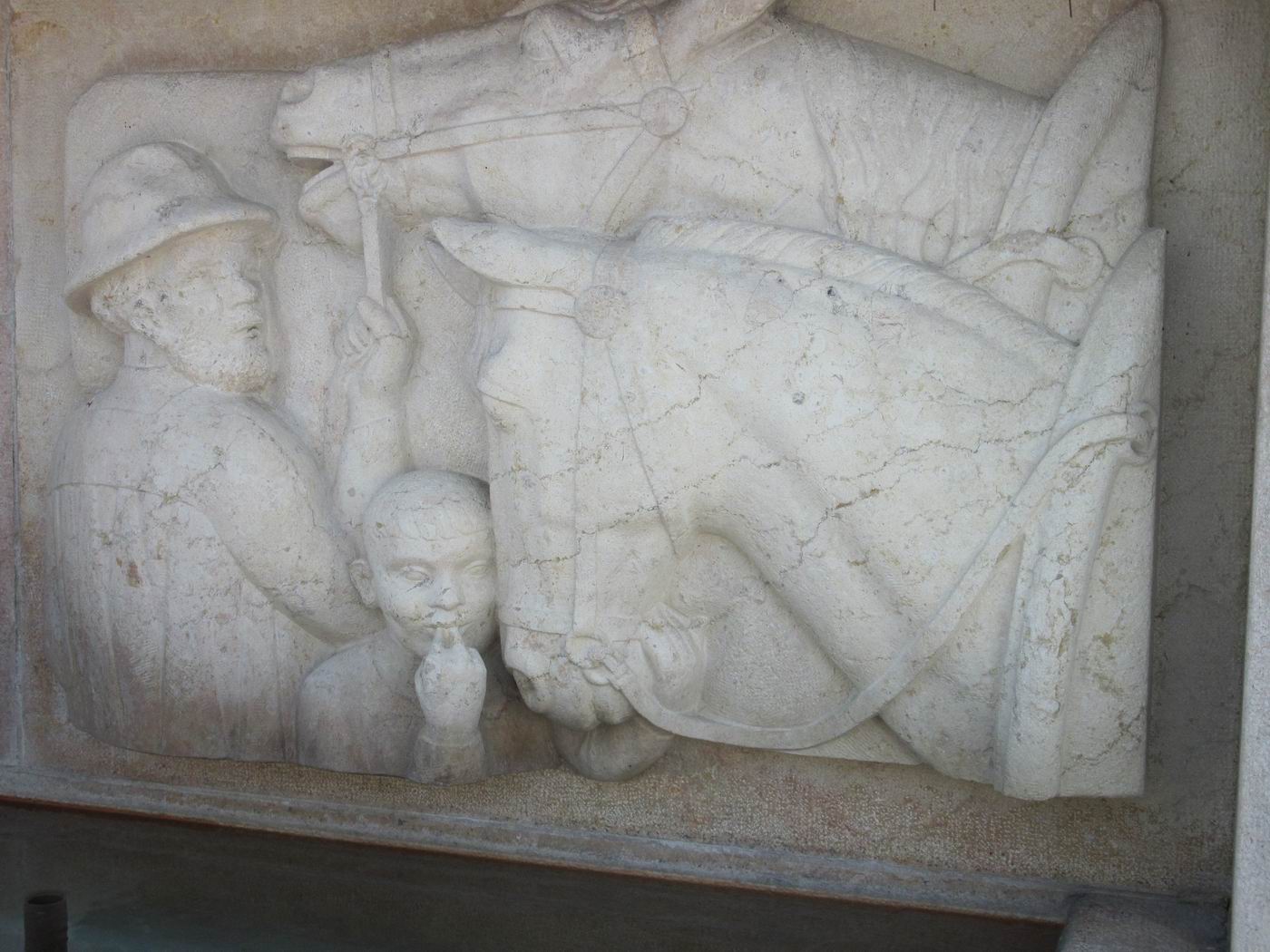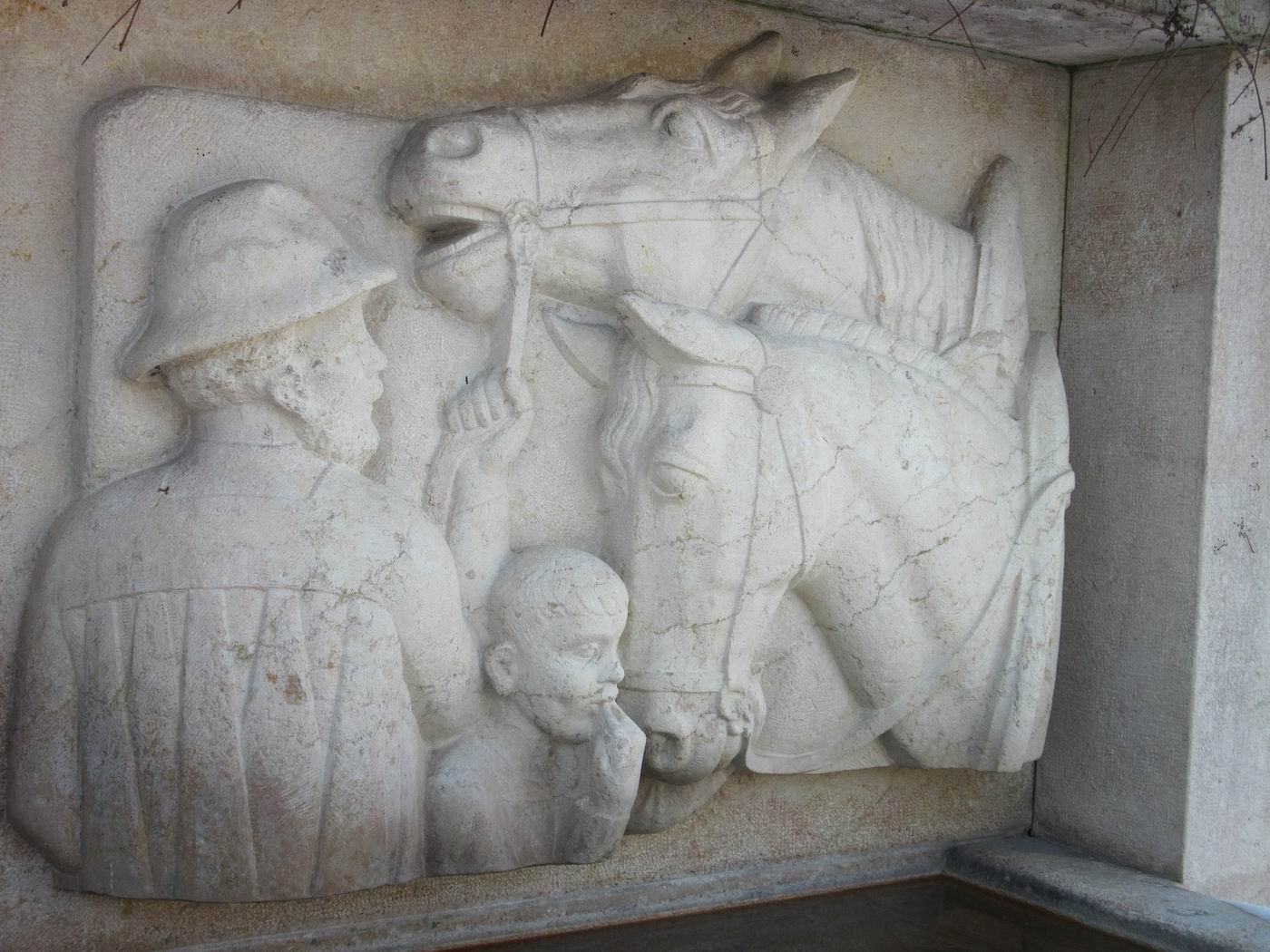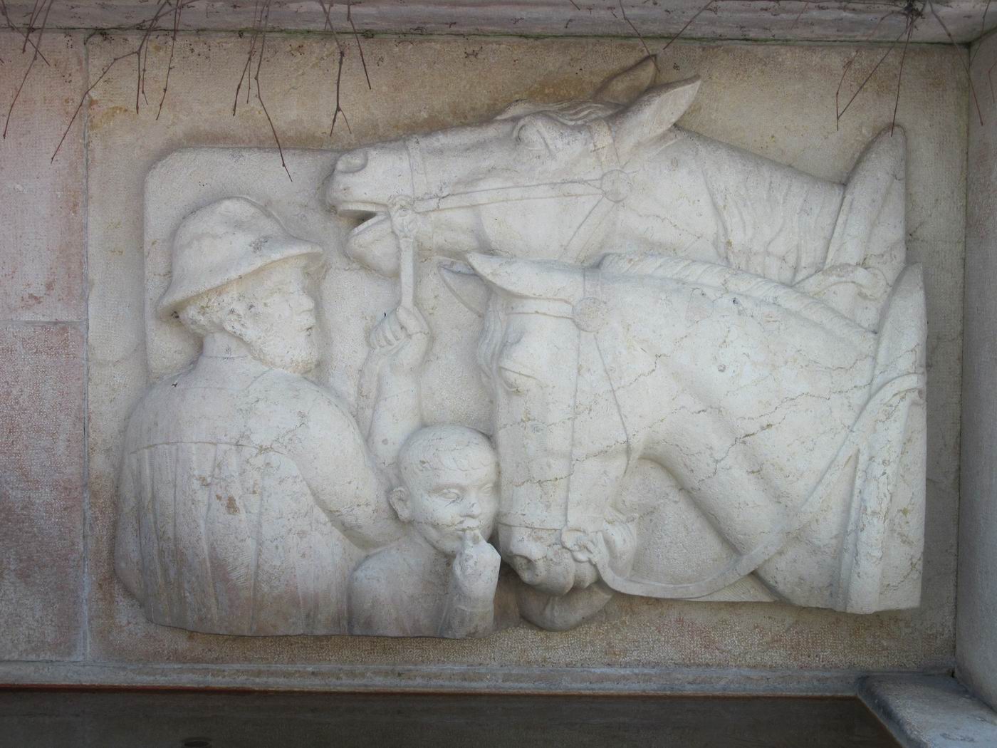 Doch Achtung! Man beachte den geschnittenen Mund des Boten-Gauls, als hätte hier die Maschine statt die Hand gewirkt beim Gestalten. Man fragt sich: Hat ein Pferd vorne ein Scharnier im Maul? Und der vermutete Pfiff des Jungen, wo schallt er auch hin? Hätte Probst so gestaltet? Man könnte es ehemals volksgefälliger Heimatstil nennen. Der Bote formt zwar den Mund nach Probsts Art. Doch wen guckt er an? Wieso nicht das scheuende Pferd? Welche Beziehung haben diese Figuren untereinander? Da gibt es probstische Details, die Komposition will aber gar nicht so recht probstisch sein. Es entstehen wirklich ernsthafte Zweifel, ob hier nicht ein Lehrlingswerk oder auch ein Werk eines Geselle oder gar Meisters aus Probsts Umgebung vorliegt, jedoch um alles in der Welt nicht ein Werk von Probst. (Man kann auch stark vermuten, dass das heute vorhandene Relief nach einem Modell von Probst gehauen worden ist.) Das ruft nach Aufklärung. Hat man etwa zwischen 1935 und 1990 in Liestal einen Brunnen ausgetauscht oder ersetzt, vielleicht weil der alte Brunnen gestohlen worden wäre, und niemand hat das gemerkt, niemand weiß es mehr?