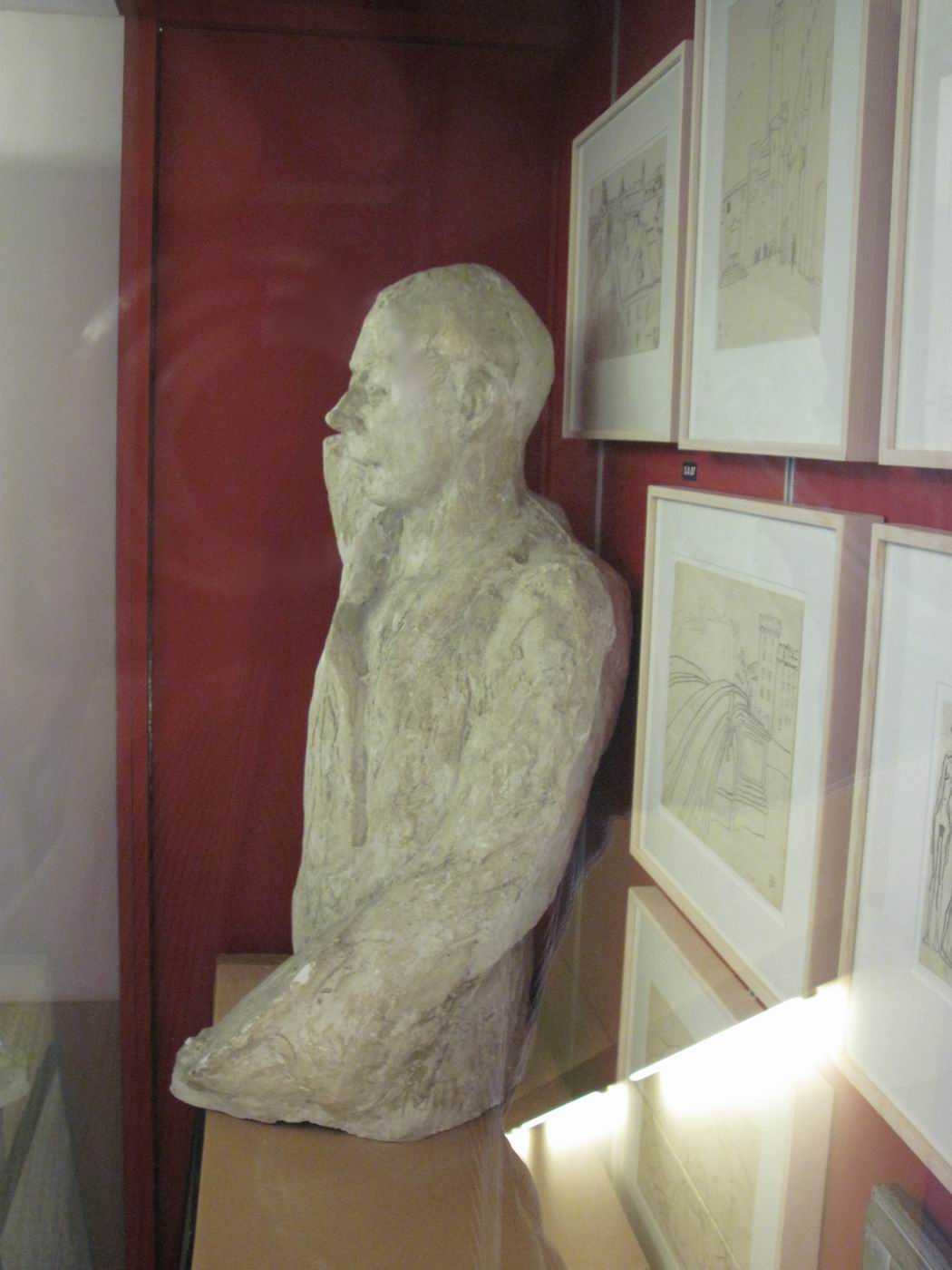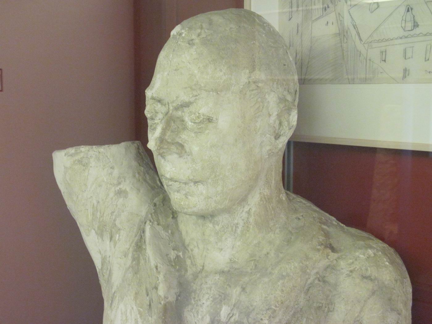 Von der Figur existiert auch eine Terracotta-Version. Die geplante Stein-Version konnte nicht fertig gestellt werden. Ein erster Versuch endete mit einem Benjamin, d.h. der Stein war innen faul. Ein wesentliches Stück hatte sich abgespalten. Siehe Link. Später ist Plattner dann verstorben... (Otto Plattner : * 29. Juni 1886 in Liestal; † 20. Oktober 1951 in Stein am Rhein.) Bei der so genannten "Totenmaske" könnte es sich auch um einen Gesichtsabguss des lebenden Otto Plattner handeln, welche als Arbeitsvorlage gedient haben könnte. Plattner lebte damals vermutlich erst in der Gegend von Liestal, später aber in Stein am Rhein. Probst lebte in der Gegend von Genf: Das scheint schwierig gewesen zu sein für eine Kommunikation zu Formfragen... Otto Plattner hat Probsts Schicksal wesentlich beeinflusst. Auf Plattners Rat hin ist Probst nach Paris gegangen um Architektur zu studieren - und kam als Bildhauer zurück... Bei der unten gezeigten Ausstellungsart handelt es sich angeblich um eine Behelfsversion. Der Betrachter möge das verzeihen. Mit der Schachtel ist es besser als wenn man die Figur gar nicht sehen könnte, weil man sie wegen des fehlenden Sockels hätte für das öffentliche Auge wegschließen müssen... |