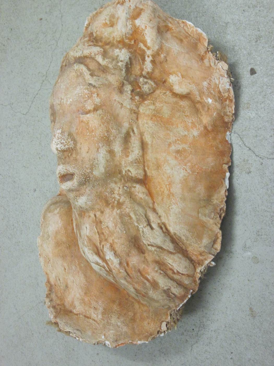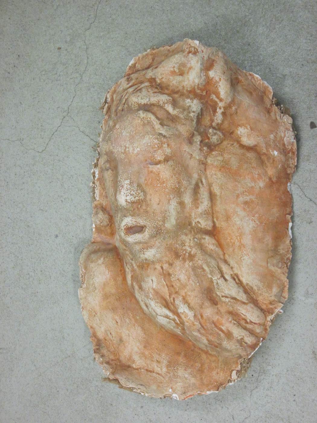 Bei der gezeigten Gips-Maske handelt es sich vermutlich entweder um eine Studie (Modell) oder um einen kleinen Teil eines Abgusses des Kapitells "Vater Rhein" am Kunstmuseum Basel, welcher von Bildhauer Jakob Probst und Architekt Max Tüller zur Ausstellung an der Biennale Venedig 1940 angefertigt worden war. Nach der Ausstellung ist der noch weiße Gips-Abguss von Max Tüller mit einer schützenden Beton-Deckplatte versehen und in einem Garten aufgestellt worden (bezeugt auf vorhandenen Photographien), wo er ca. 30- 40 Jahre verblieben ist, bis er infolge Natureinwirkung zerbrach. Bei der Herstellung des Abgusses hatte man die dünne Gipsschicht mit Jute verstärkt. (Seitlich am Rande der Maske unten ist solche Jute sichtbar.) Nach dem Auseinanderbrechen hat der Architekt Max Schneider den Abguss mit Einwilligung der Besitzer in Stücke zerschnitten und angeblich für die Besitzer im Autobahn-Werkhof Sissach eingelagert. Nun ist das unten gezeigte Stück überraschenderweise vom nichts ahnenden Autor im Archiv des Dichter- und Stadtmuseums Liestal mit einer rötlichen Farbe übertüncht aufgefunden und dokumentiert worden. Die rötliche Farbe aber gehört nach Aussagen der Besitzer eigentlich gar nicht auf den Abguss, falls es sich überhaupt um den genannten Abguss handelt. Vor dem Auseinanderschneiden war die Farbe nicht vorhanden gewesen. Es ist zu vermuten, dass diese später zum Schutz des Werks angebracht worden ist - oder auch zu andern Zwecken, welche hier nicht öffentlich abgehandelt werden sollen - oder es handelt sich tatsächlich um eine Studie und nicht um einen Teil des zerschnittenen und momentan in diesem Falle noch gesuchten Abgusses des Kapitells. In allen Fällen scheint es jedoch zentral zu bemerken, dass das vorhandene Stück sehr wichtig für eine allfällige Restauration des zerfallenen Kapitells ist. |