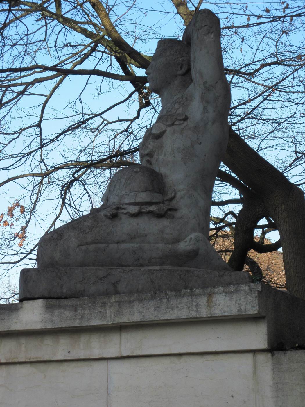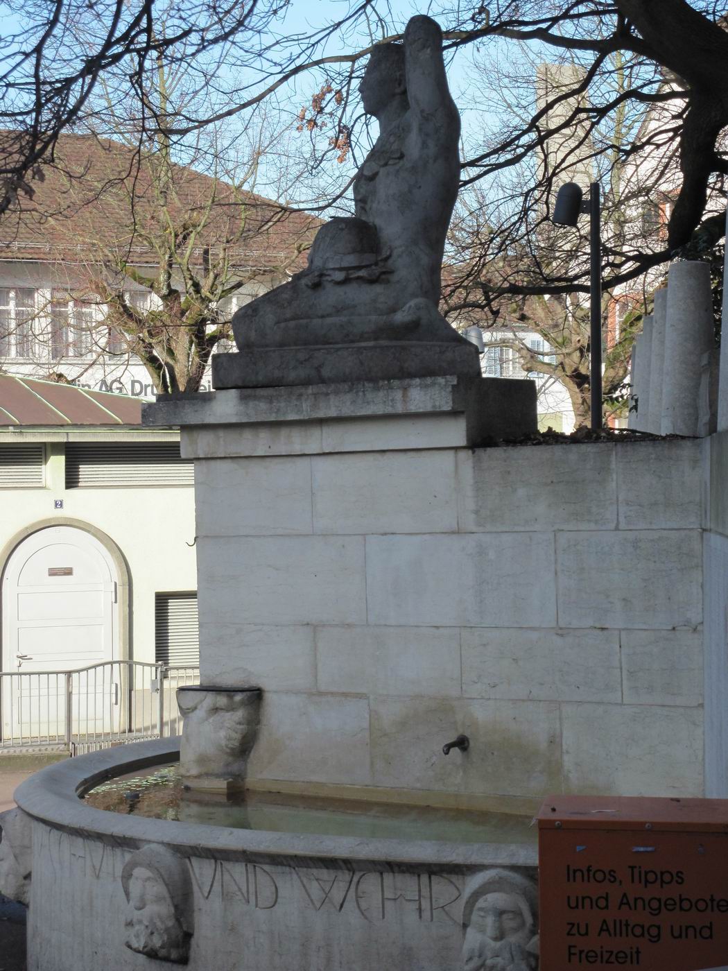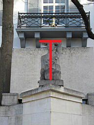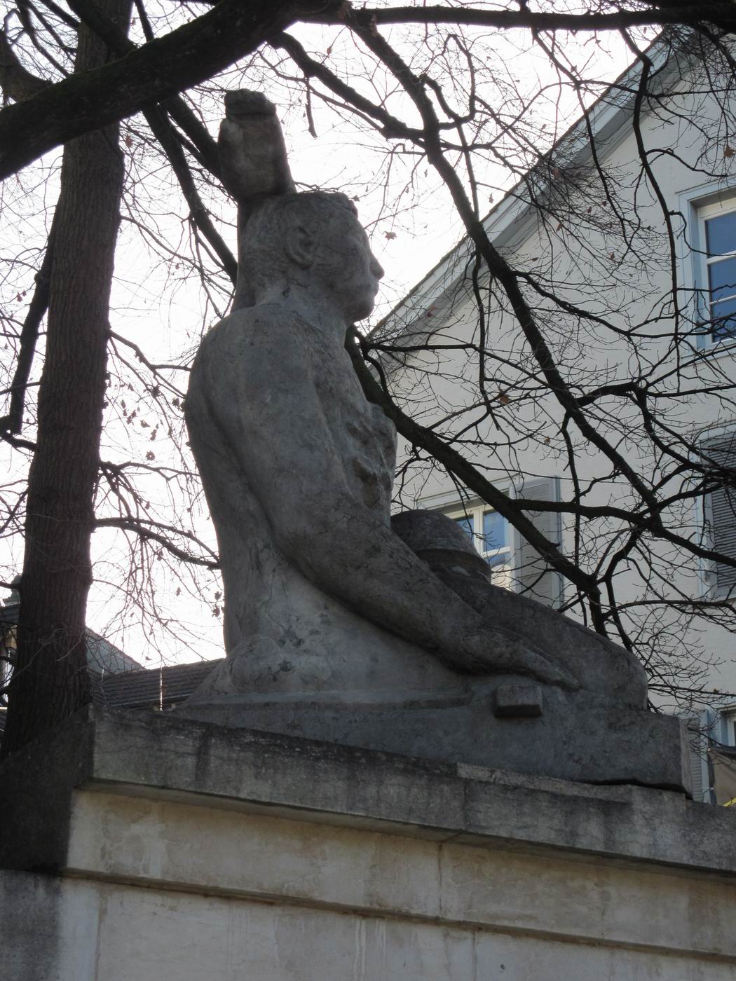 Eine weitere Bemerkung zur Symbolik: Wie auf den Bildern ganz unten auf dieser Seite zu sehen ist, bilden die beiden Hauptlinien der zentralen Figur von vorne gesehen ein lateinisches T oder ein "Antoniuskreuz" (benannt nach dem Mönchsvater Antonius dem Grossen aus Ägypten, um 251–356 / Probst war ja auch in Ägypten...). Dieses Kreuz ist mit grosser Wahrscheinlichkeit das römische Standard-Folterinstrument zur standesrechtlichen qualvollen Hinrichtung, also das ursprüngliche christliche Kreuz. Symbolisch steht es daher für Leiden und Erlösung. Schiebt man den oberen Balken etwas nach unten wie das Kreuz in religiösem Zusammenhang im westen immer wieder dargestellt wird, so kann man seine 4 Enden der 2 sich zeigenden Achsen besser wahrnehmen. Die Enden können auch die 4 Elemente symbolisieren, d.h. die Materie. Früher bestand daher die Idee, dass jemanden Kreuzigen und so töten bedeutet, dass man ihn an die Materie bindet und so mit dem Tod des Körpers auch gleichzeitig geistig tötet, was als besonders schlimm empfunden werden musste. Die beiden Achsen können auch waagrecht Zeit und senkrecht Raum bedeuten oder auch senkrecht das Irdische unten und das Geistige oben. Das Antoniuskreuz hat in Ägypten auch noch einen älteren Ursprung, welcher sich griechisch damals durch den Buchstaben Tau ausgedrückt hat (das grosse griechische Tau ist ähnlich oder sogar gleich dem Buchstaben T, je nach Schriftart). Das Tau war im alten Ägypten das Symbol des Adepten, welcher eine Weihe oder Einweihung empfangen sollte. Das Sau stand für "Leben" und war auch das Zeichen für den Gott Thot, der Götterbote, der im Griechischen dem Hermes und im Römischen dem Merkur entspricht. Thot war dann nach dem Tode auch der Seelenführer. Sein griechischer Name taucht dann wieder auf im Hermes Trismegistos (der dreimal grosse Hermes), dessen 12 Sprüche (Tabula Smaragdina) für die Alchemisten unentbehrlich waren. Der erste Spruch lautet: "Siehe, das Oberste kommt vom Untersten, und das Unterste vom Obersten...". Anders wird oft gesagt: So wie oben, so auch unten, so wie unten, so auch oben. Ja, das Tau zeigt einmal nach oben und einmal nach unten! Wer diese Symbolik verstehen mag, kann nachempfinden, dass in Probst Werk eine Tiefe Symbolik steckt, welche den Übergang vom vom Leben zum Tod und dann die Beziehungen der weiter hier Lebenden zu ihren Toten sowie der Toten zu den Lebenden thematisiert. Um diese Symbolik zu verstärken, hatte er der Figur ein Buch "der Weisheit" auf die Oberschenkel gelegt. Dieses Buch kann die Bibel oder die Tabula Smaragdina oder ein anderes konkretes Weisheitsbuch bedeuten. Dass Probst dann quasi gezwungen wurde, dieses Buch durch das martialische Symbol des Stahlhelms zu ersetzen offenbart, dass hier ein kultureller Mord an einem Symbol durch eine barbarische Mehrheit eines Teils der Bevölkerung geschehen ist, welche sich die Deutungshoheit angemasst hatte. Man sieht es unter auf der folgenden Seite, siehe: Link. Das da sichtbare Relief zeigt die Parzen, die Schicksals-Göttinnen mit dem Faden und der Spindel und den Soldat mit Stahlhelm am hinteren Eingang zum Kunstmuseum Basel. Der Blick der Parzen ist gegen Liestal gereichtet, wo der andere Stahlhelm nun das Buch der Weisheit ersetzt. Und der Stahlhelm bedeckt nun den Kopf eines Menschen und nicht nur die Oberschenkel, denn es ist wieder Krieg, nachdem der andere ja begleitet von dieser Grippenepidemie in Liestal geendet hatte. Ja, Probst war eben doch auch ein Symbolist!