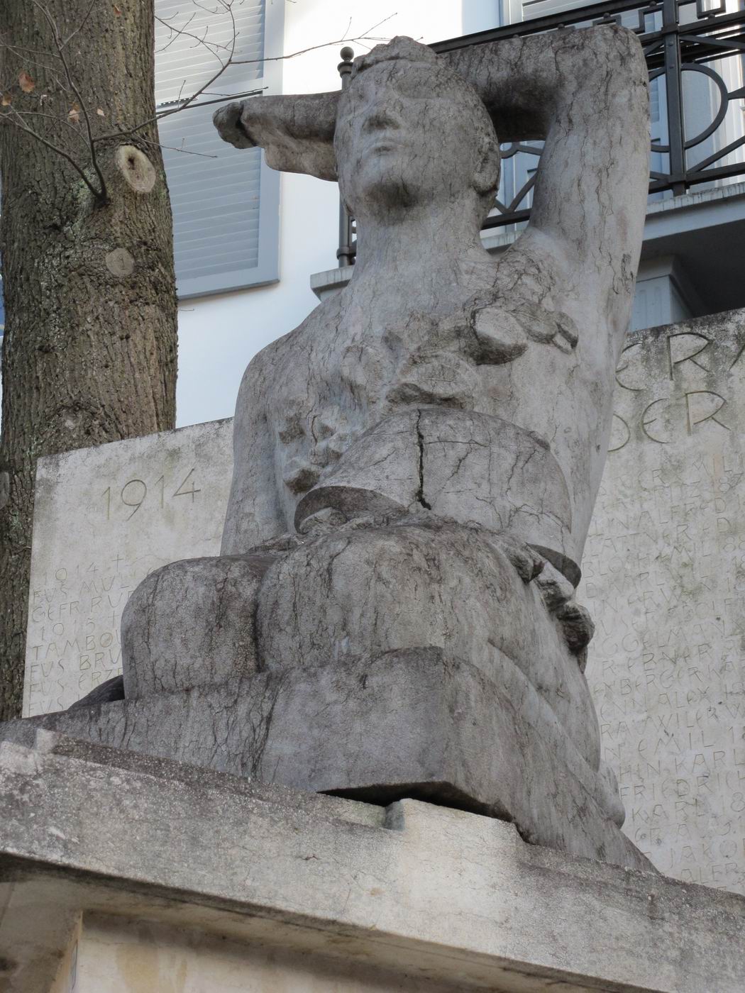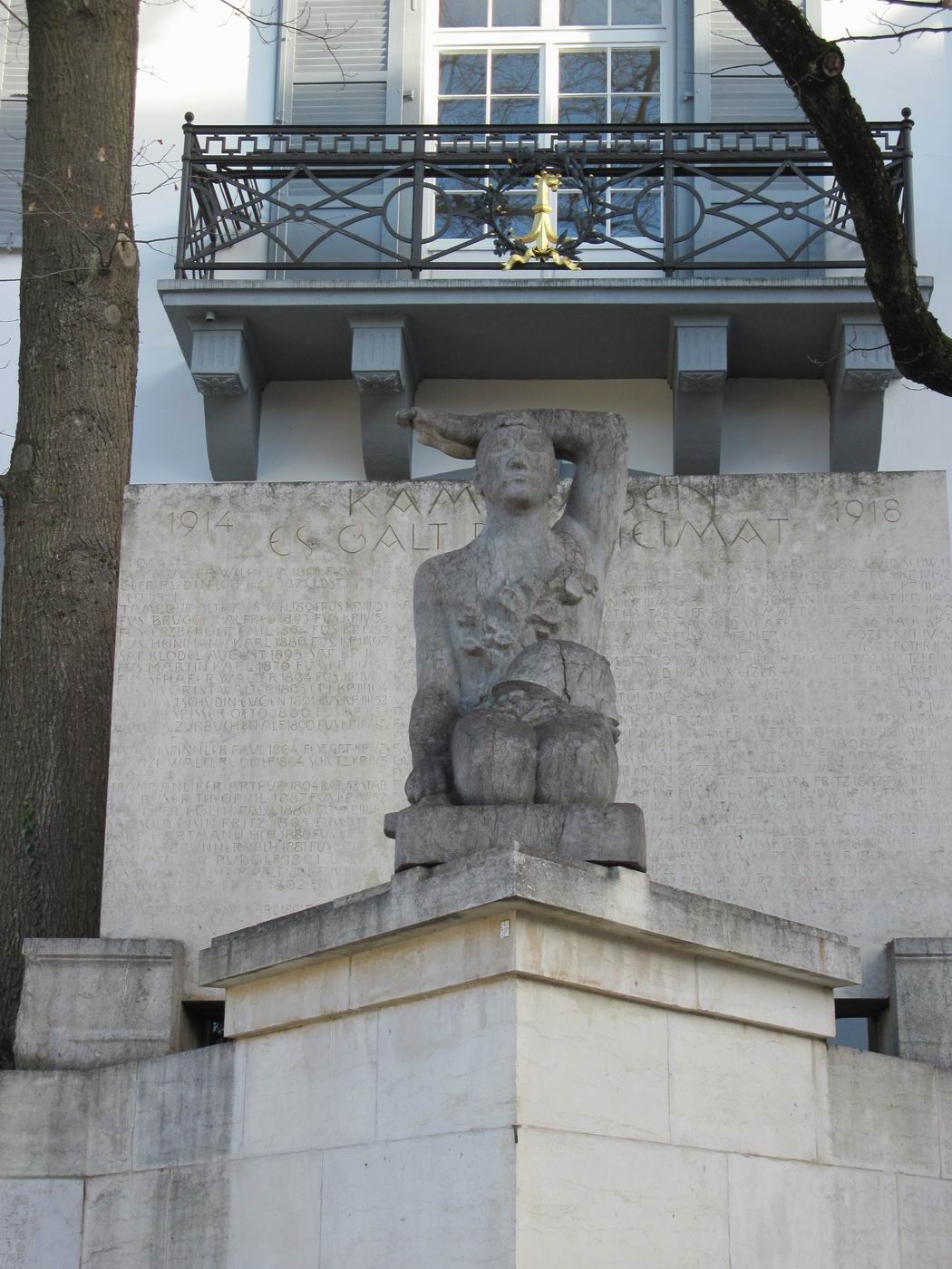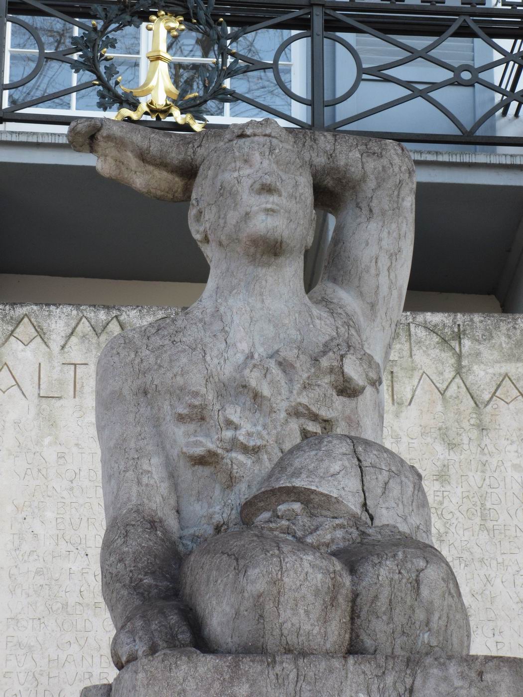 Man hätte das Werk auch anders nenne können, etwa: Kniend gebeugt unter dem höheren Schicksal mit aufrecht gehaltenem Rücken und Kopf, Trost findend im ins Bewusstsein steigenden Wort aus dem Buch. Doch so lang geartete Sätze brauchen einen großen Geist um sie zu fassen. Dies wäre eine zu starke Forderung gewesen. 1934 musste das Denkmal überarbeitet werden. Auf das Buch auf den Oberschenkeln des jungen Schweizers ist dabei ein volksgefälliger Stahlhelm betoniert worden. Damit war die Symbolik des Werks zerstört. Aus dem Jahre