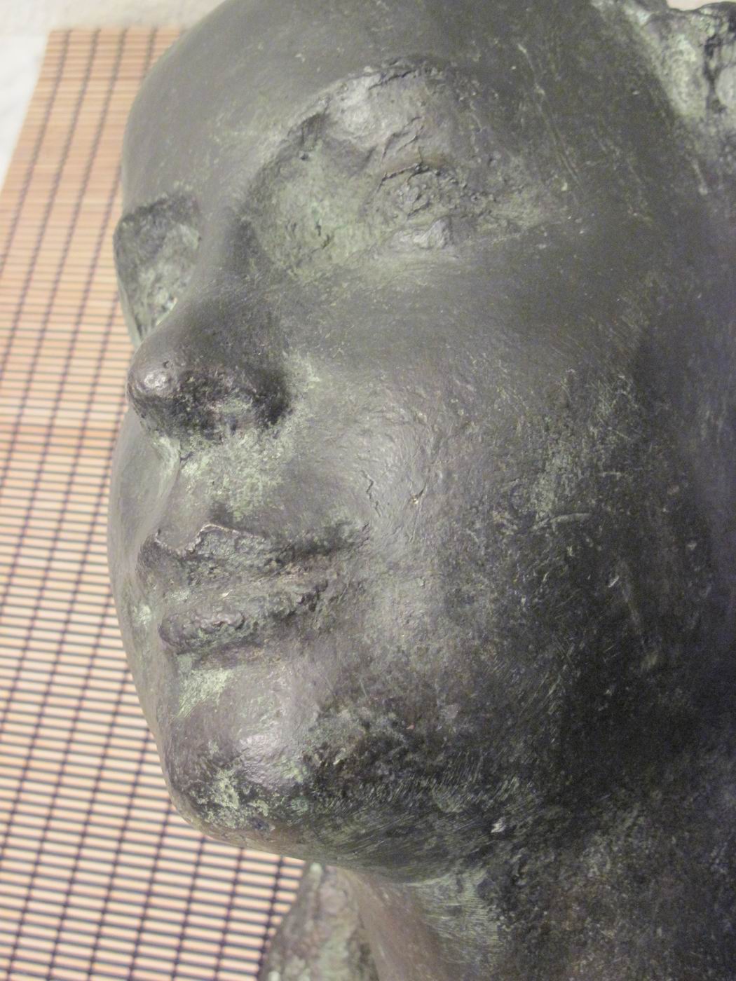 Nach den Angaben, welche dem Besitzer vom Verkäufer vorliegen "Bettina" von Probst. Entweder eine Version des von Max Tüller dokumentierten Mädchenkopfs aus Terracotta (1936) oder ein privates Bild vom Jakob Probsts Adoptivtochter Bettina um 1945, vielleicht eben der Studienkopf zur Erwachenden oder der vielleicht eventuell "abgetrennte" Kopf der keinen Erwachenden oder kleinen Liegenden von 1946. Die exakte Zuordnung konnte bis jetzt aus Zeitgründen nicht untersucht werden, was nichts an der Schönheit des Kopfs ändert. Ein schriftlicher Hinweis auf der gegossenen Figur konnten nicht entdeckt werden. Link |