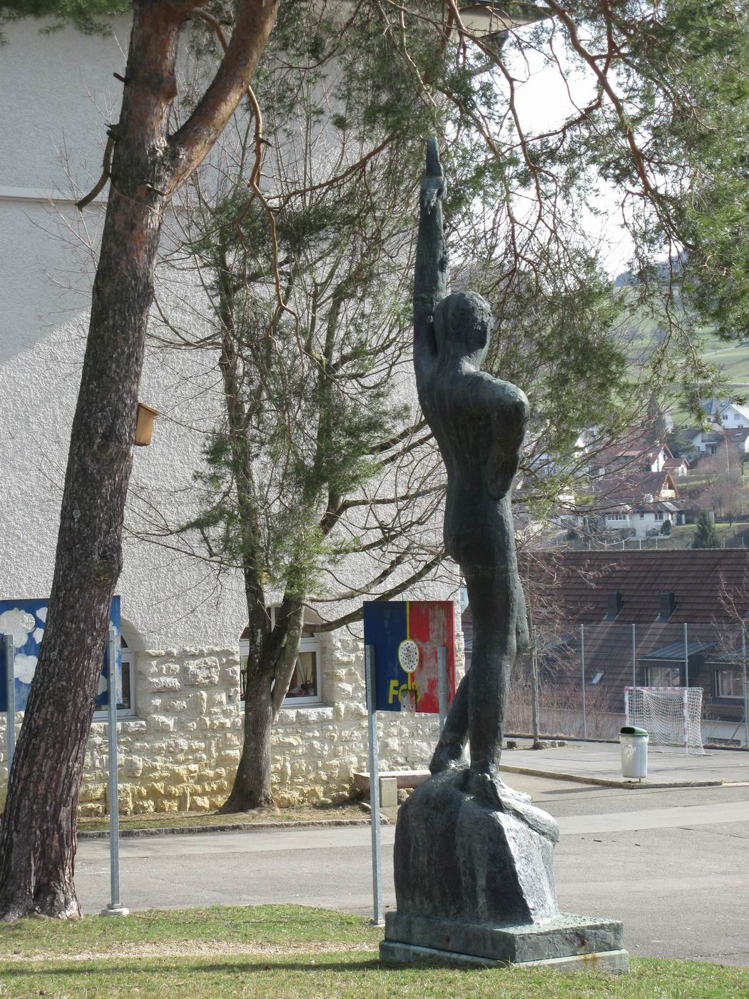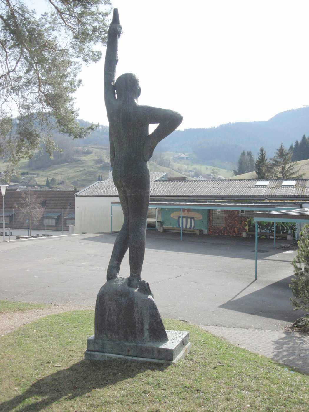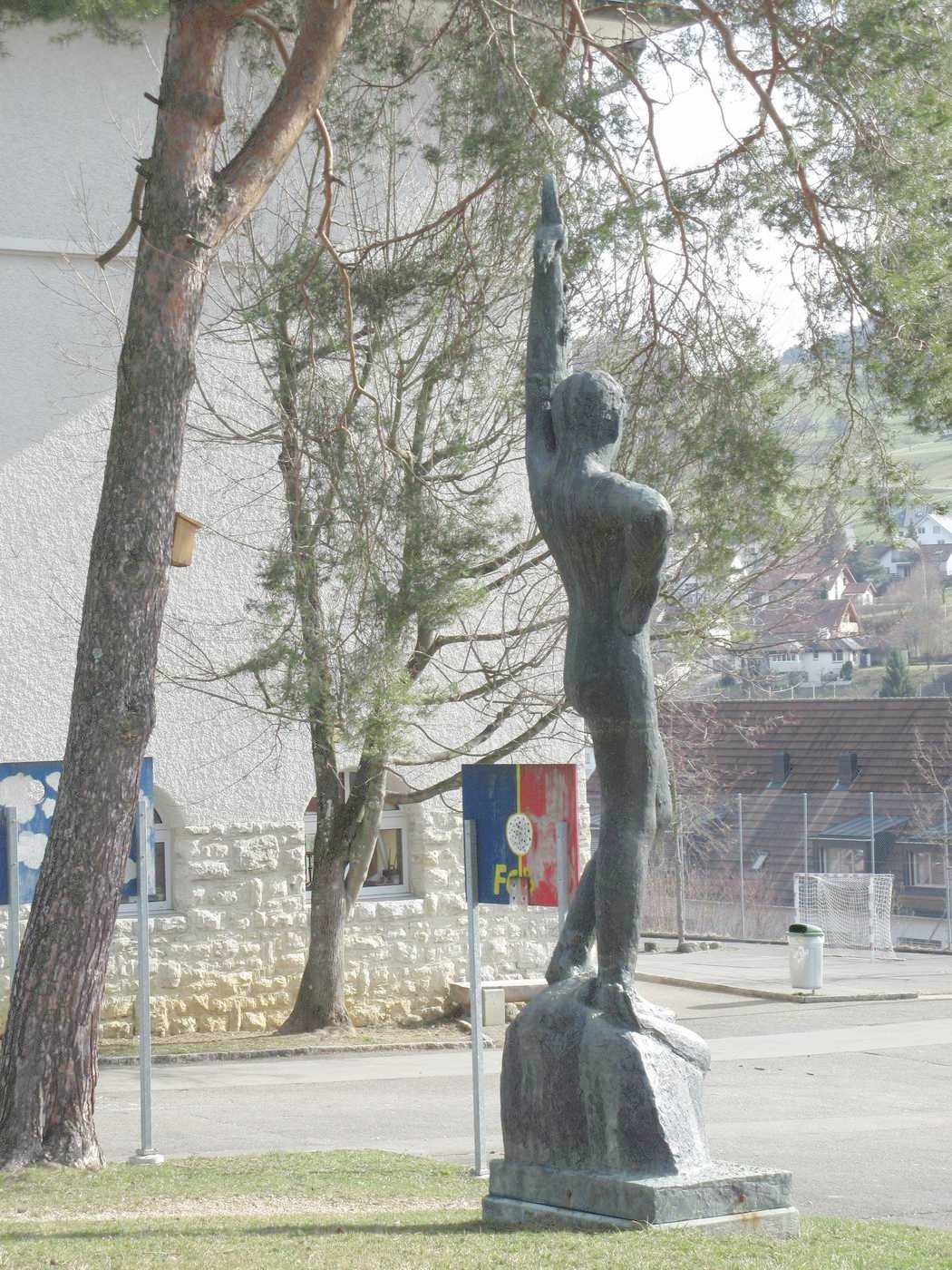 David hält sein Schwert mit der linken Hand. Seltsam - unüblich in der europäischen Kunst... Nach der Verleihung der Ehrenbürgerschaft der Gemeinde Reigoldswil (Basel-Land) an Jakob Probst wurde der David anlässlich der Fertigstellung des Sekundarschulhauses in dessen Grünanlage aufgestellt (momentan am 2. Standort). Nach Angaben der Gemeinde Reigoldswil handelt es sich um ein Geschenk des kantonalen Kunstkredits Basellands. Andere Quellen haben auch schon von einem Geschenk Probsts geredet. Die Zeit hat das Problem nun geklärt: Der damals von der Seite der Schule involvierte Vertreter der Sache hat dem Autor bekannt gegeben, dass der Kanton Basel-Landschaft anlässlich der Fertigstellung wichtiger, großer, im Auftrage der öffentlichen Hand erstellter Bauwerke jeweils einen Kunstkredit vergibt resp. hier vergeben hat. Damit wurde die Probst-Plastik finanziert und auch die Eule bei der Treppe zum Eingang in das Sekundarschulhaus. Offensichtlich hat die Öffentlichkeit nicht genügend Notiz von dieser Regelung genommen. In einem solchen Falle springt jeweils rasch die Phantasie in die entstandene Informationslücke. Eigeninitiative heißt auch in diesem Falle das Mittel gegen die Gleichgültigkeit. |