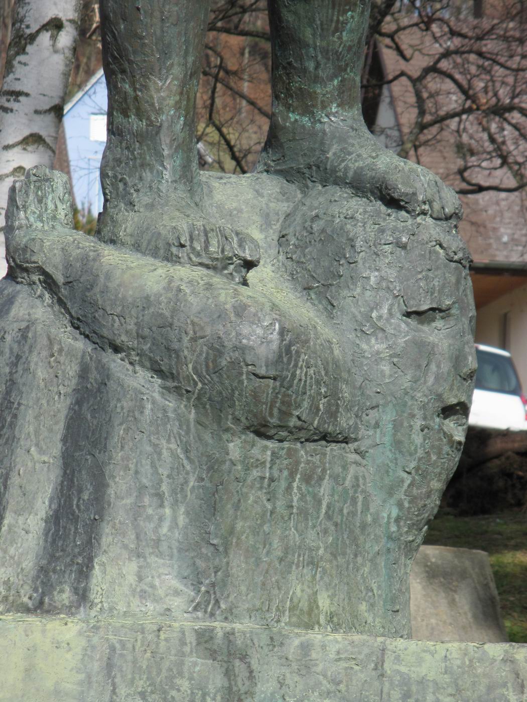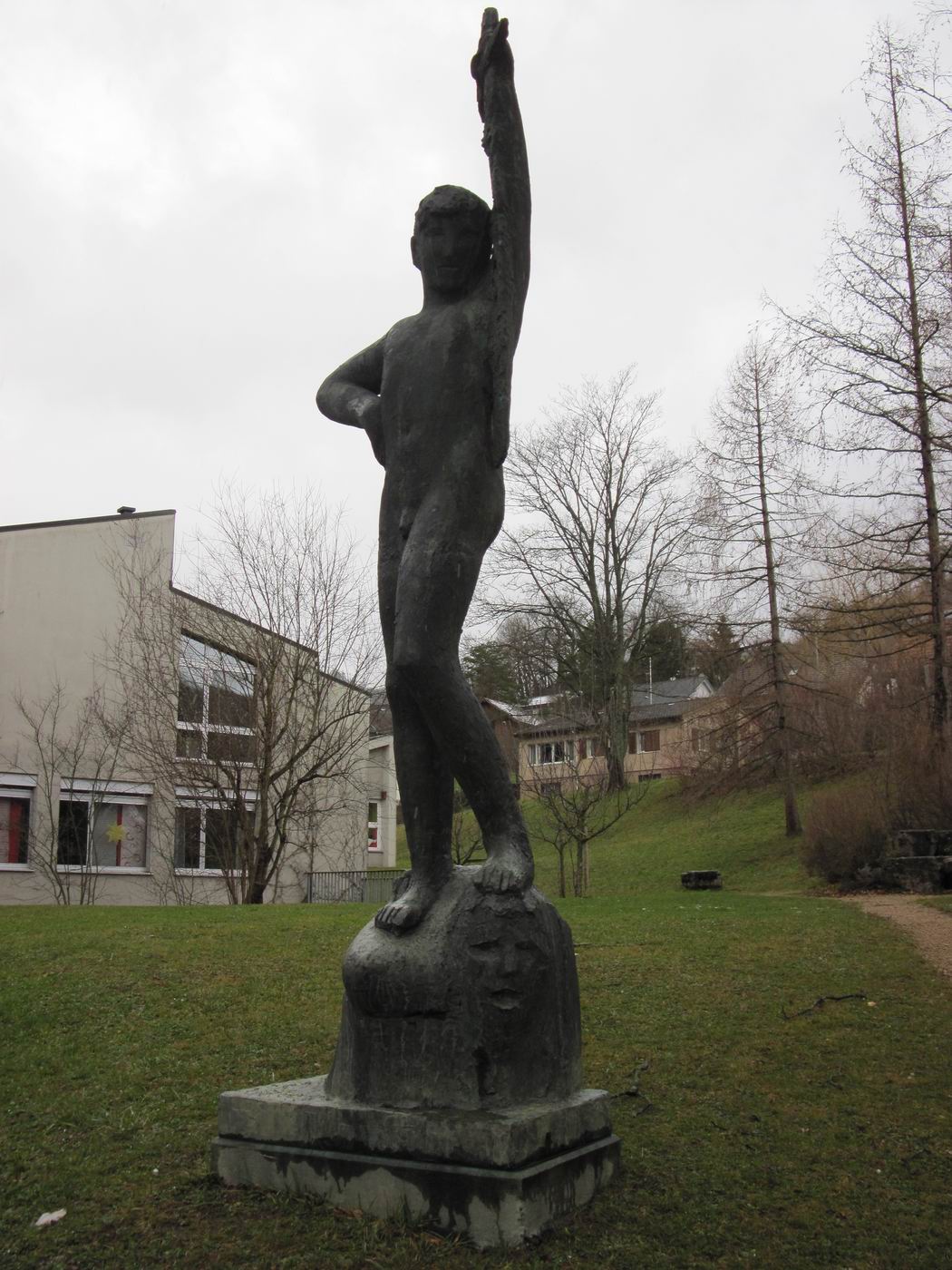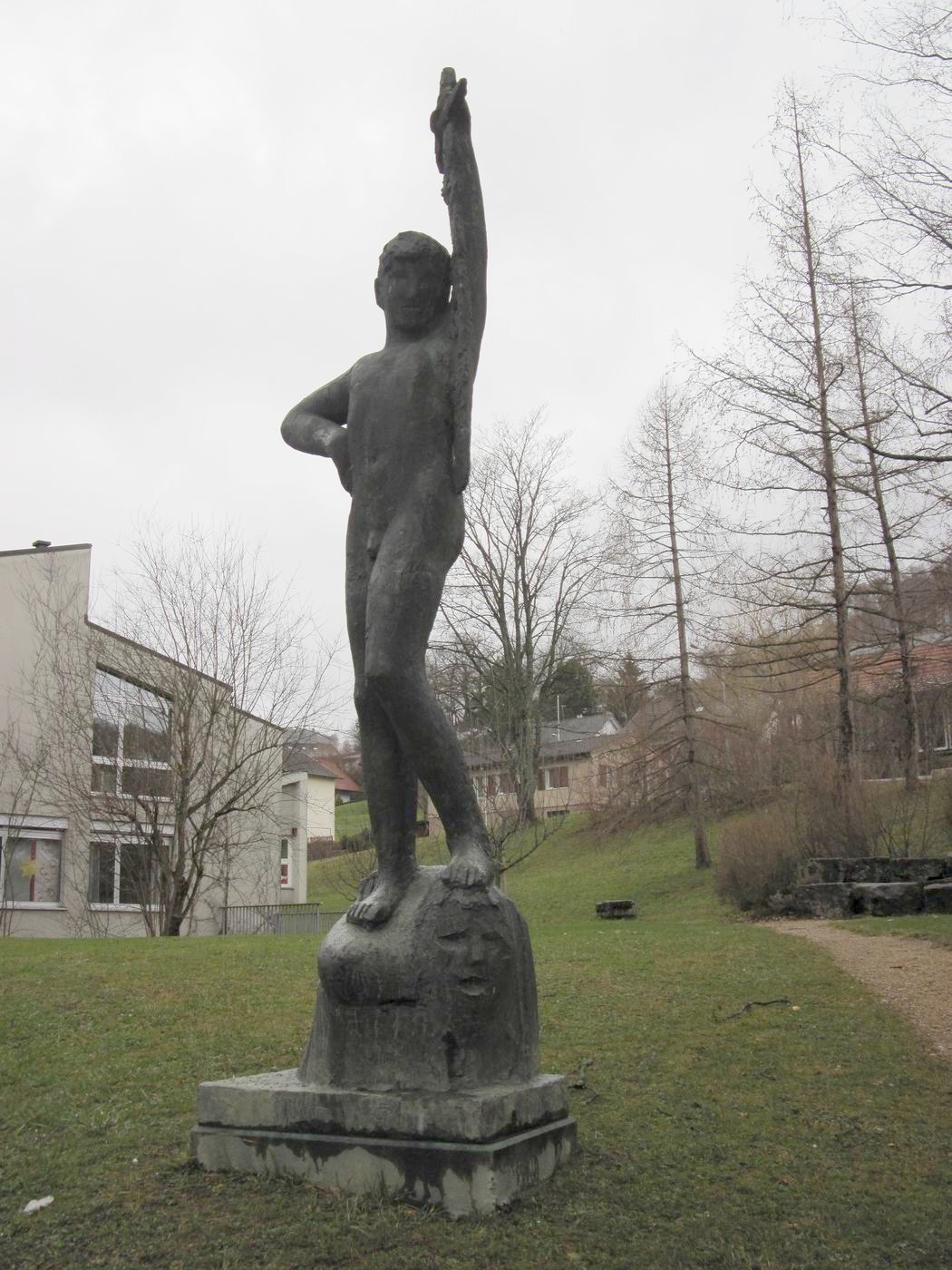 David hält sein Schwert mit der linken Hand. Seltsam - unüblich in der europäischen Kunst... Nach der Verleihung der Ehrenbürgerschaft der Gemeinde Reigoldswil (Basel-Land) an Jakob Probst wurde der David anlässlich der Fertigstellung des Sekundarschulhauses in dessen Grünanlage aufgestellt (momentan am 2. Standort). Nach Angaben der Gemeinde Reigoldswil handelt es sich um ein Geschenk des kantonalen Kunstkredits Basellands. Andere Quellen haben auch schon von einem Geschenk Probsts geredet. Die Zeit hat das Problem nun geklärt: Der damals von der Seite der Schule involvierte Vertreter der Sache hat dem Autor bekannt gegeben, dass der Kanton Basel-Landschaft anlässlich der Fertigstellung wichtiger, großer, im Auftrage der öffentlichen Hand erstellter Bauwerke jeweils einen Kunstkredit vergibt resp. hier vergeben hat. Damit wurde die Probst-Plastik finanziert und auch die Eule bei der Treppe zum Eingang in das Sekundarschulhaus. Offensichtlich hat die Öffentlichkeit nicht genügend Notiz von dieser Regelung genommen. In einem solchen Falle springt jeweils rasch die Phantasie in die entstandene Informationslücke. Eigeninitiative heißt auch in diesem Falle das Mittel gegen die Gleichgültigkeit. |