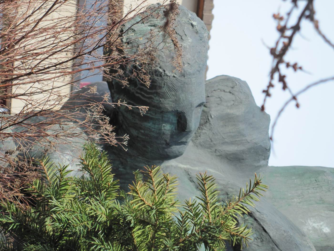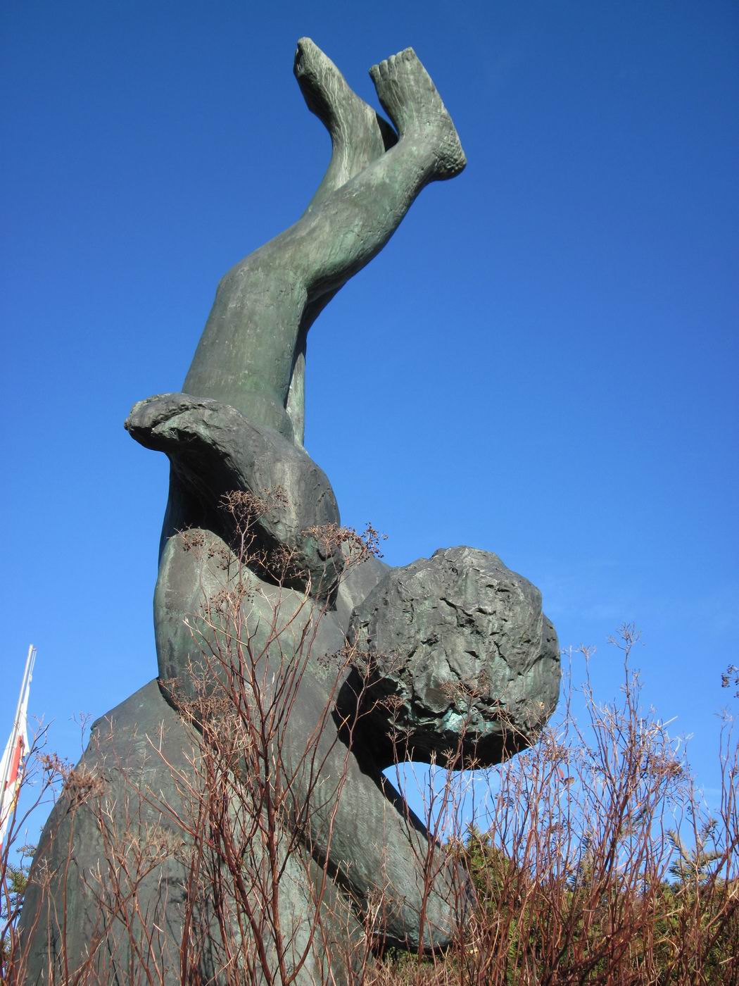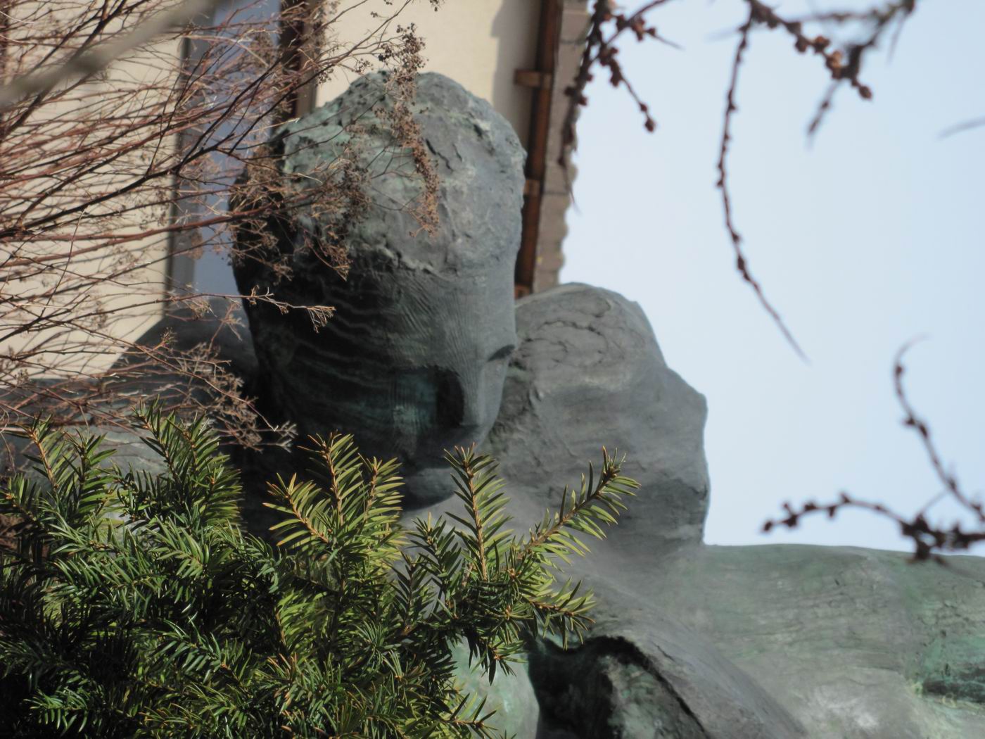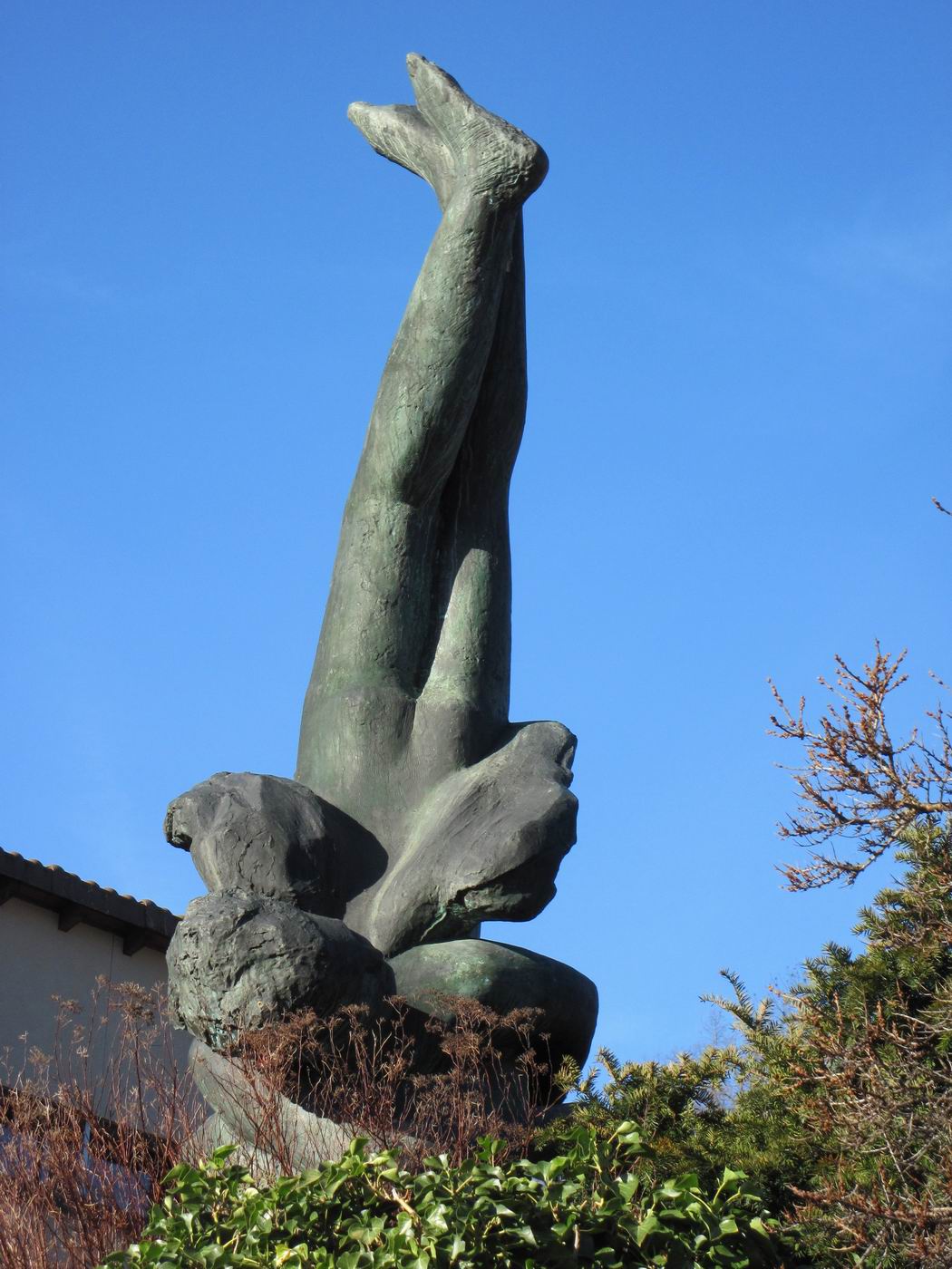 Die Ironie des letzten Bildes: "Ikarus Sturz in den Blumentopf" Da stürzt also Ikarus - und wohin? - Ins Gebüsch im großen Blumentopf? - Zentral wichtig für ein Kunstwerk dieser Art wäre es doch, wenn man seine Hauptsache sehen könnte. Hier zur Hauptsache gehört der Gesichtsausdruck des Stürzenden unten beim Aufprall. Und genau diesen kann man nicht sehen, einmal wegen dem Gebüsch. Dann wenn das Gebüsch geschnitten ist weiter wegen der Lage: Man müsste eine Klettertour wagen um das Gesicht zu Gesicht zu gekommen. - Viel zu gefährlich für die Kunstfreunde der älteren Generation. Also müsste eine Rampe gebaut werden, die einfach zu besteigen sein sollte, auch mit dem Rollstuhl... Jakob Probst selbst hatte angeblich die Platzierung der Skulptur auf einer Säule gewünscht. Schade, dass man diesen für die Skulptur gerechten Wunsch trotz seiner geringen Kostenfolgen nicht realisieren wollte oder konnte. Das Hindernis, der Einwand, welcher auf Gefahren gründet, ist eben ein besonderer Einwand, der eine bessere Lösung fordert. So steckt Ikarus, von der Strasse her weithin sichtbar, im Gebüsch. Gibt es nun keine würdigere, bessere Lösung? (Angeblich habe man von der Seite der Behörden keine Säule gewollt, weil eine solche die "Autofahrer auf der Durchgangsstrasse hinter dem nächsten Haus hätte ablenken können...") |