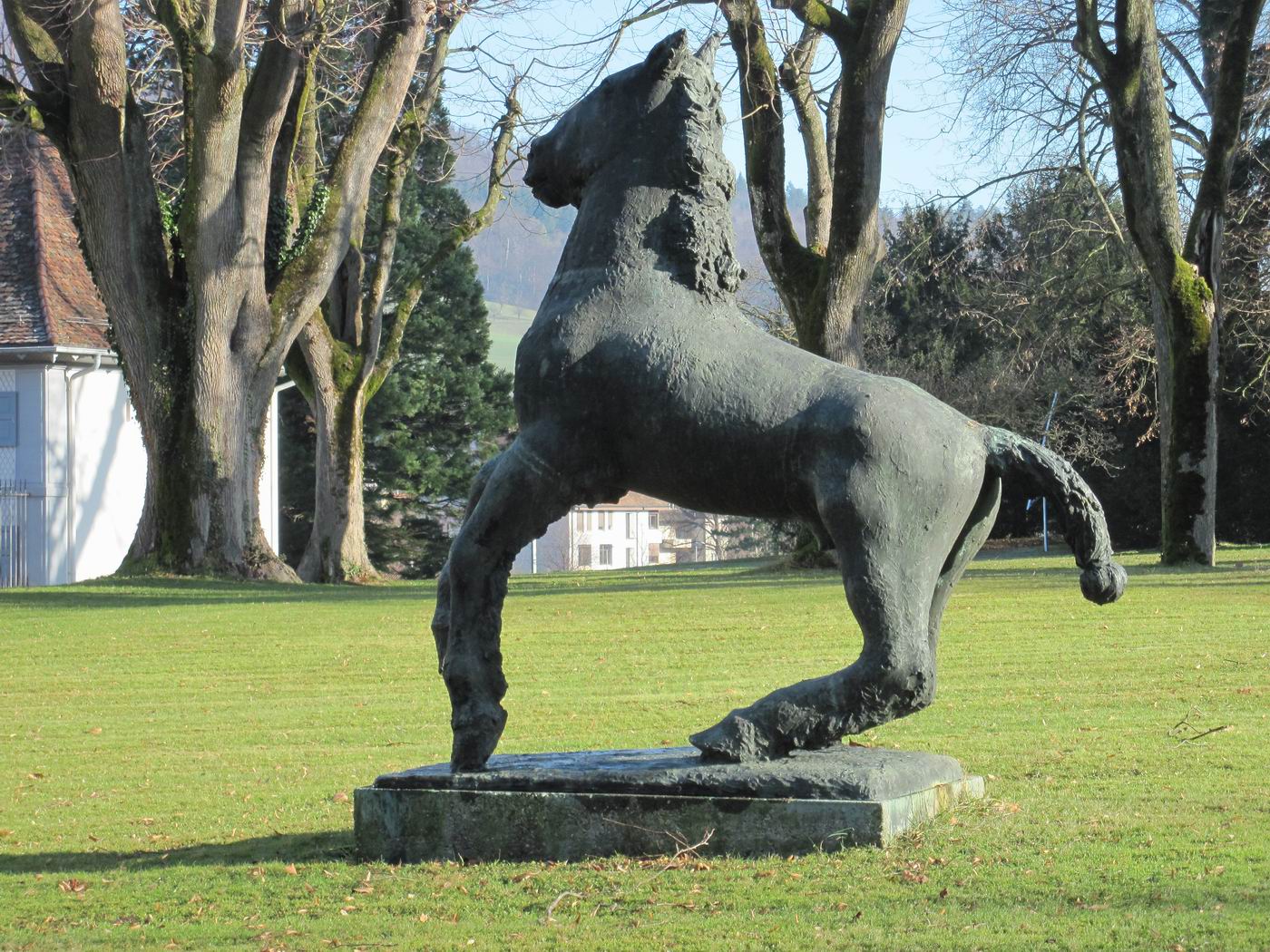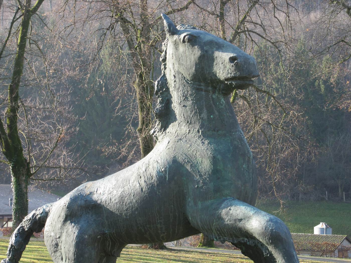 1965: Der Kanton Baselland beschließt am 13.9.1965 eine Ehrenausstellung im Schloss Ebenrain (Sissach) zu Ehren des am 17.8. 1965 nun 85 Jahre alt gewordenen Bildhauers Jakob Probst durchzuführen. Zum Anlass dieser Ehrung sprach der Kanton einen Kredit von damals sFr. 60'000.- für den Ankauf des Puledro (überlebensgroßer jungen Hengst, Bronze, gegossen in Mendrisio) zur längst fälligen Ausschmückung des Kantonsspitals. Das Geld wurde gesprochen für den künstlerischen Wert, den Guss des Werkes, den Transport nach Liestal, die Aufstellung (Anm.: damals) in der genannten Anlage. Damals konnte man sich für diese Summe auf dem Lande ein Einfamilienhaus kaufen. |