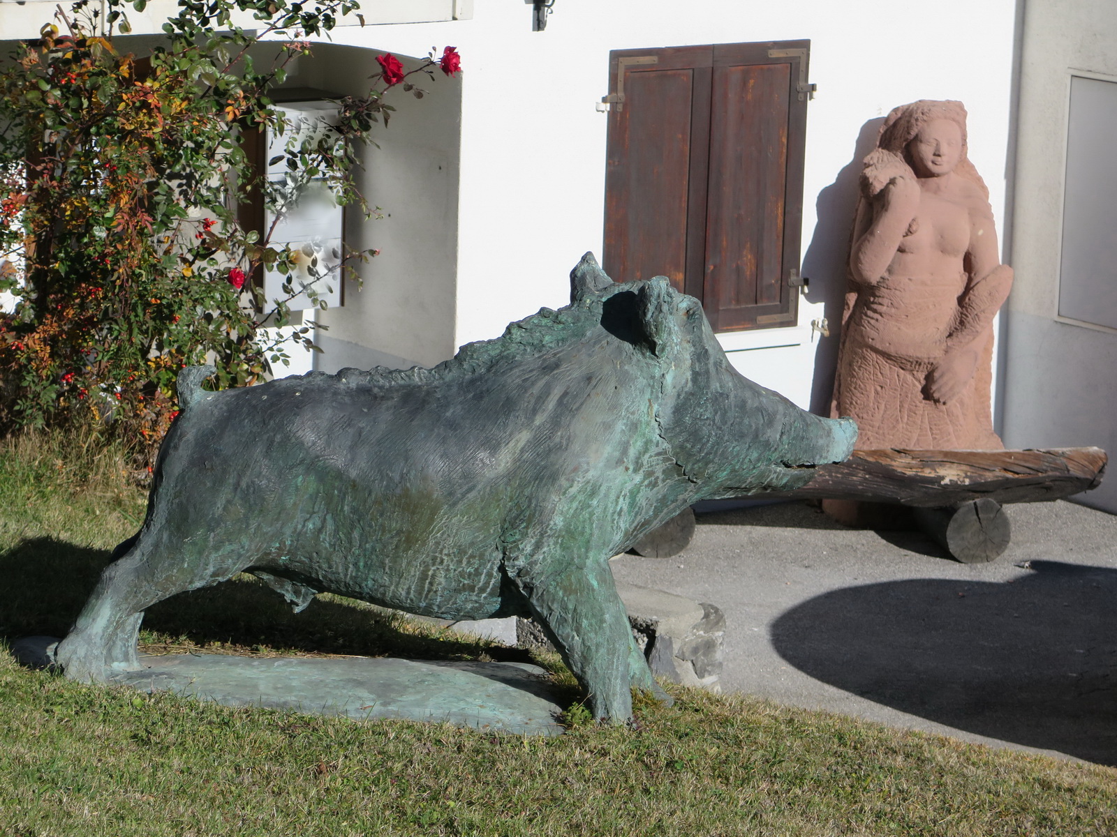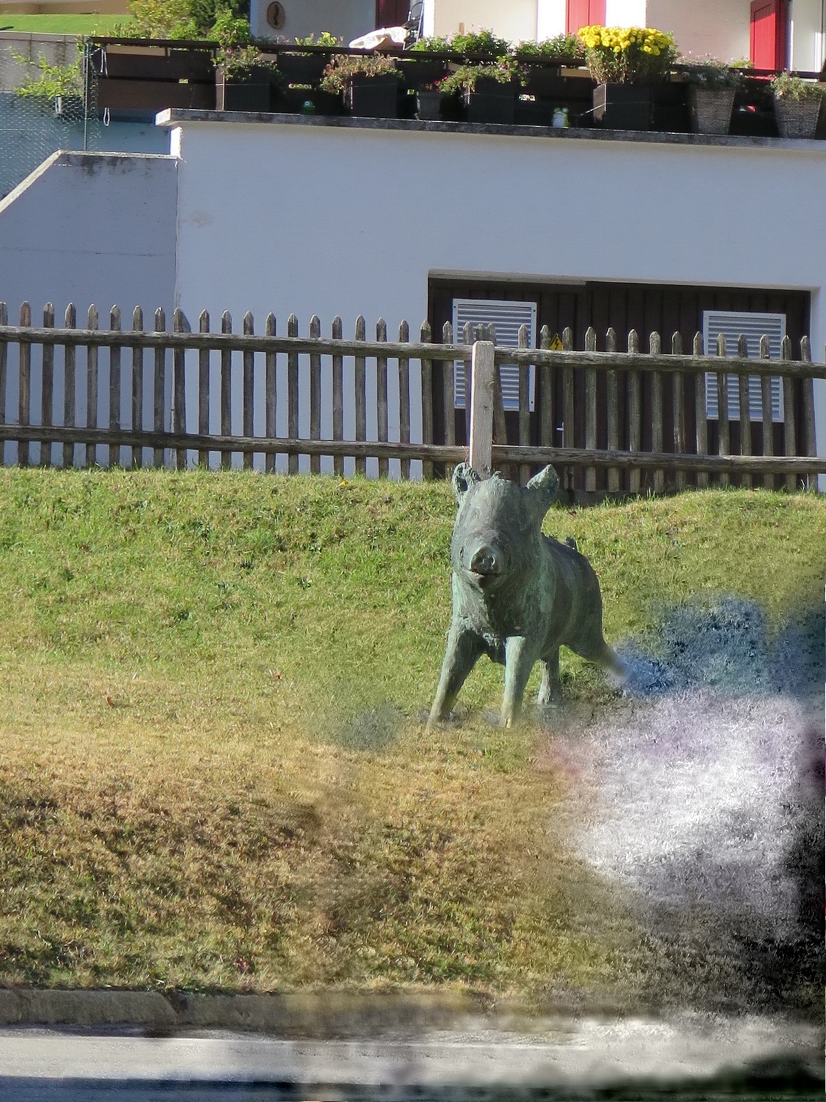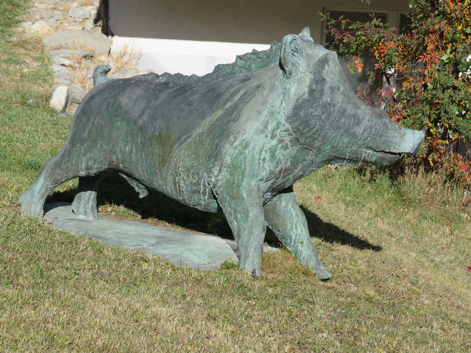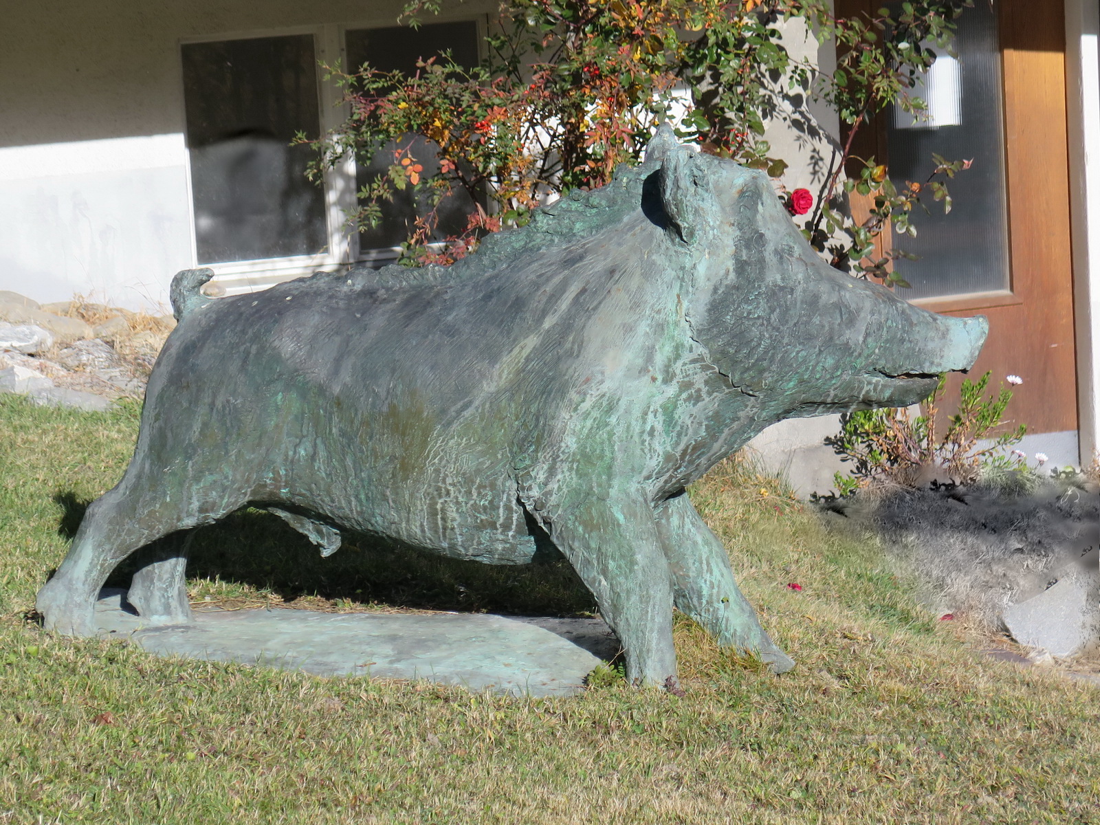 | Die Besitzer des Grundstückes und der Liegenschaft in der Ostschweiz, auf welcher die abgebildete Wildschwein-Skulptur aufgestellt ist, haben berichtet, dass eines schönen Tages ein Herr aus dem "oberen Nordwestschweizer Halbkanton" mit einem Lastwagen vorgefahren sei und sich angeschickt habe, die Skulptur aufzuladen und mitzunehmen resp. "abzuholen", wie der inzwischen verstorbene Herr sich auszudrücken pflegte. Vermutlich hatte der Lastwagenbenutzer in Erfahrung gebracht, dass in jenen Tagen die Besitzer der Skulptur abwesend waren. Was er vermutlich nicht wissen konnte ist der Umstand, dass ein naher Verwandter der abwesenden Besitzer die Szene aus der Nähe beobachtete und darauf einschritt und das Abhol-Vorhaben vereitelte. Auf diese Weise sich erkannt und beschämend verjagt sehend musste der verhinderte Täter unverrichteter Dinge wieder abziehen. Interessant ist die Geschichte trotzdem, denn die verwendete Taktik scheint kein Einzelfall gewesen zu sein. Welche Schritte dann auf dem Rechtswege erfolgt waren, wurde nicht mitgeteilt. |