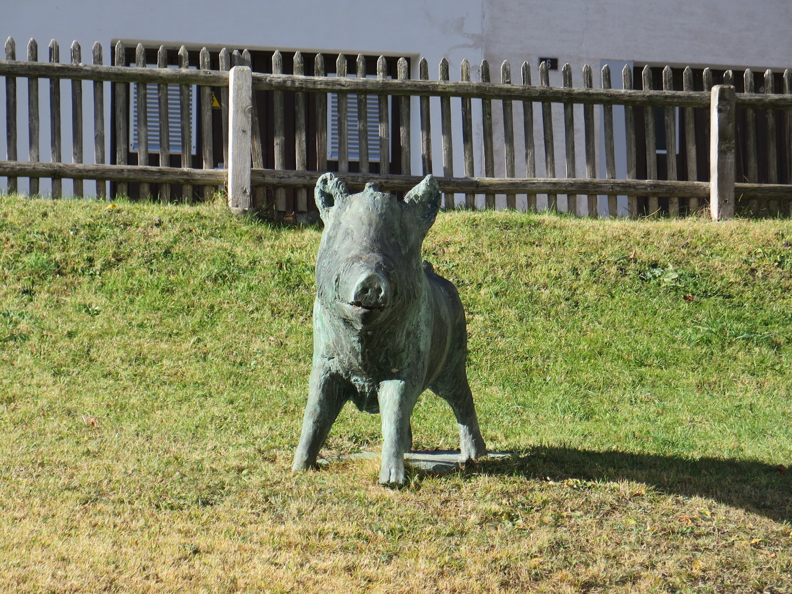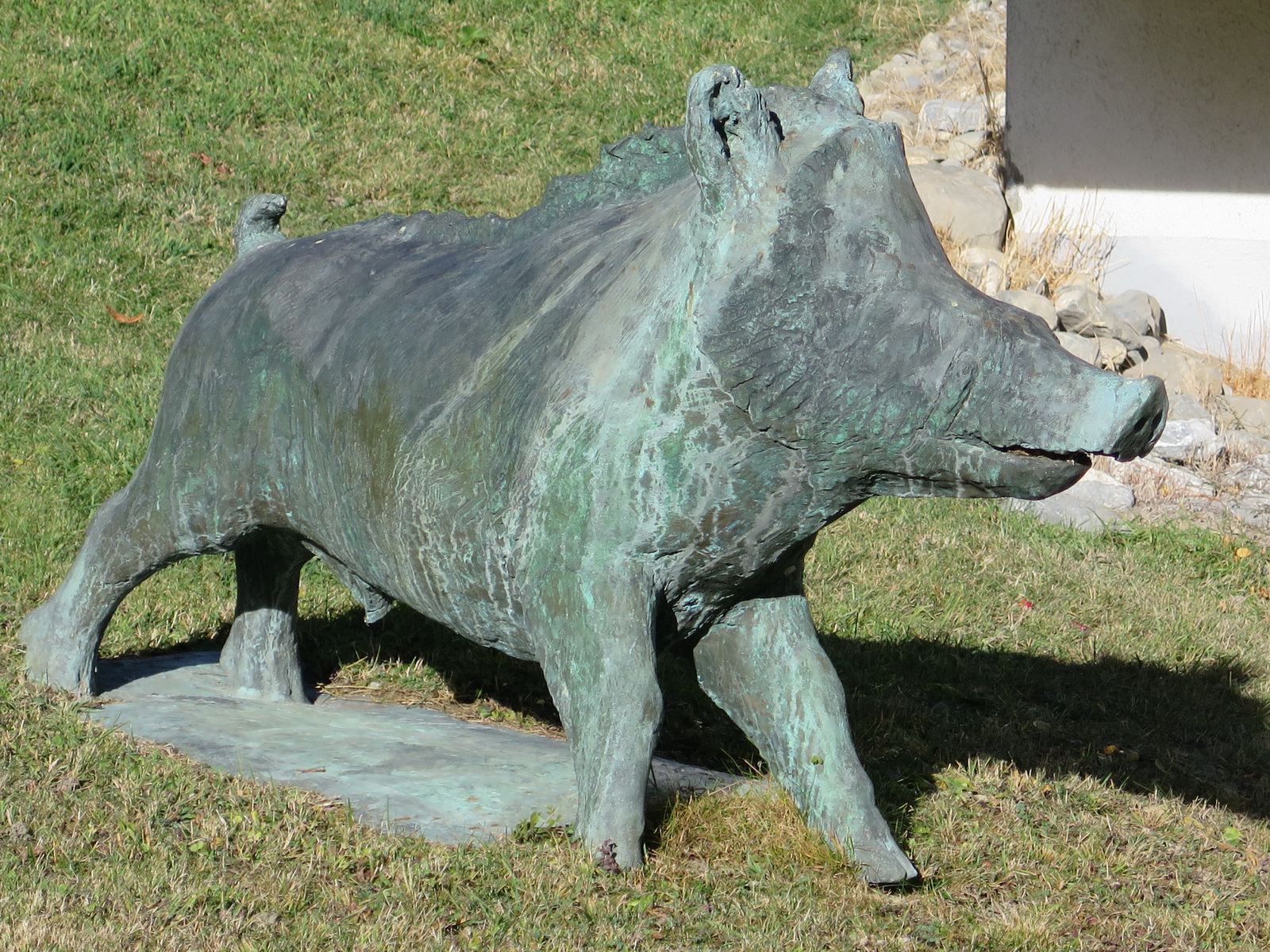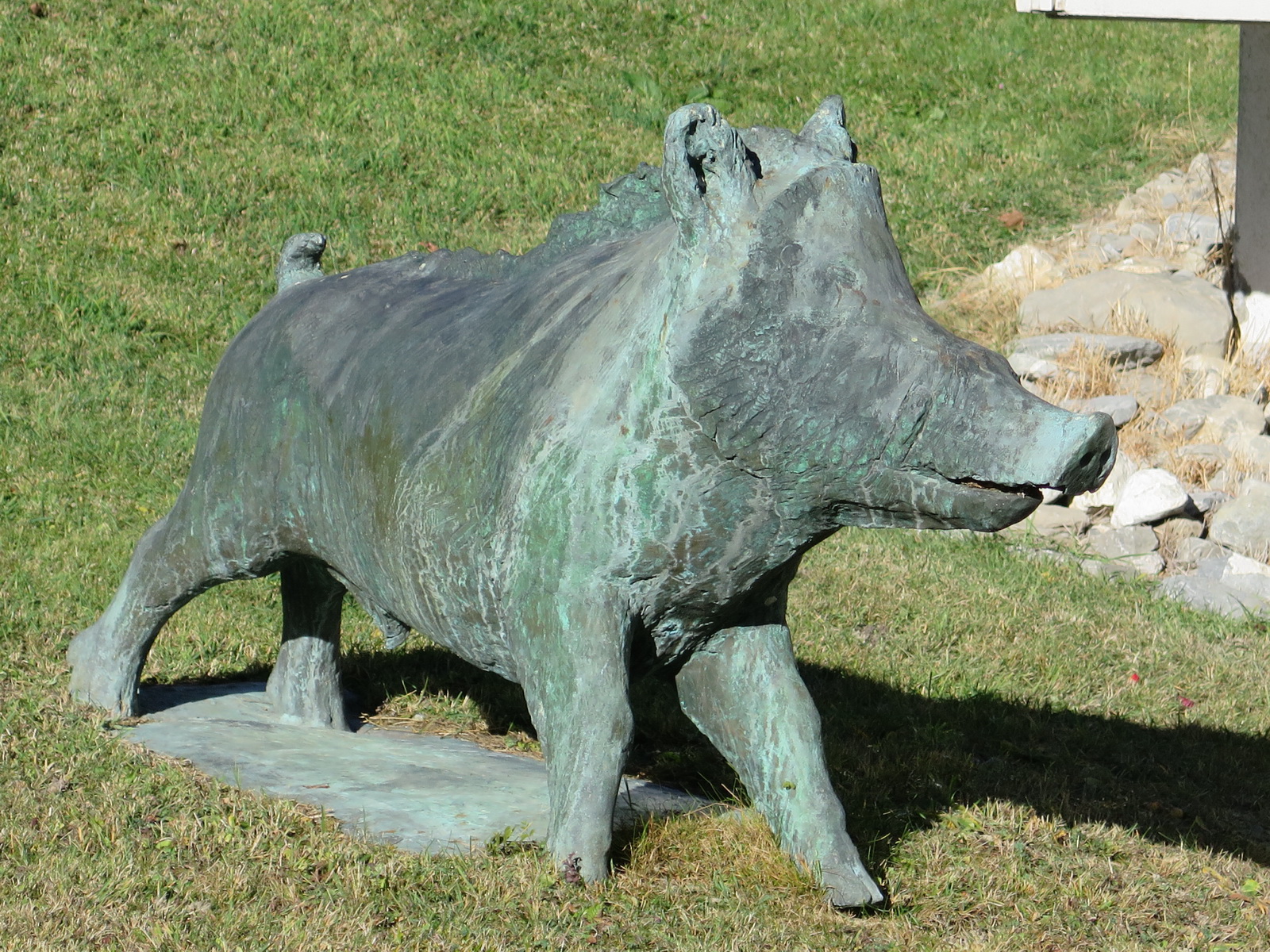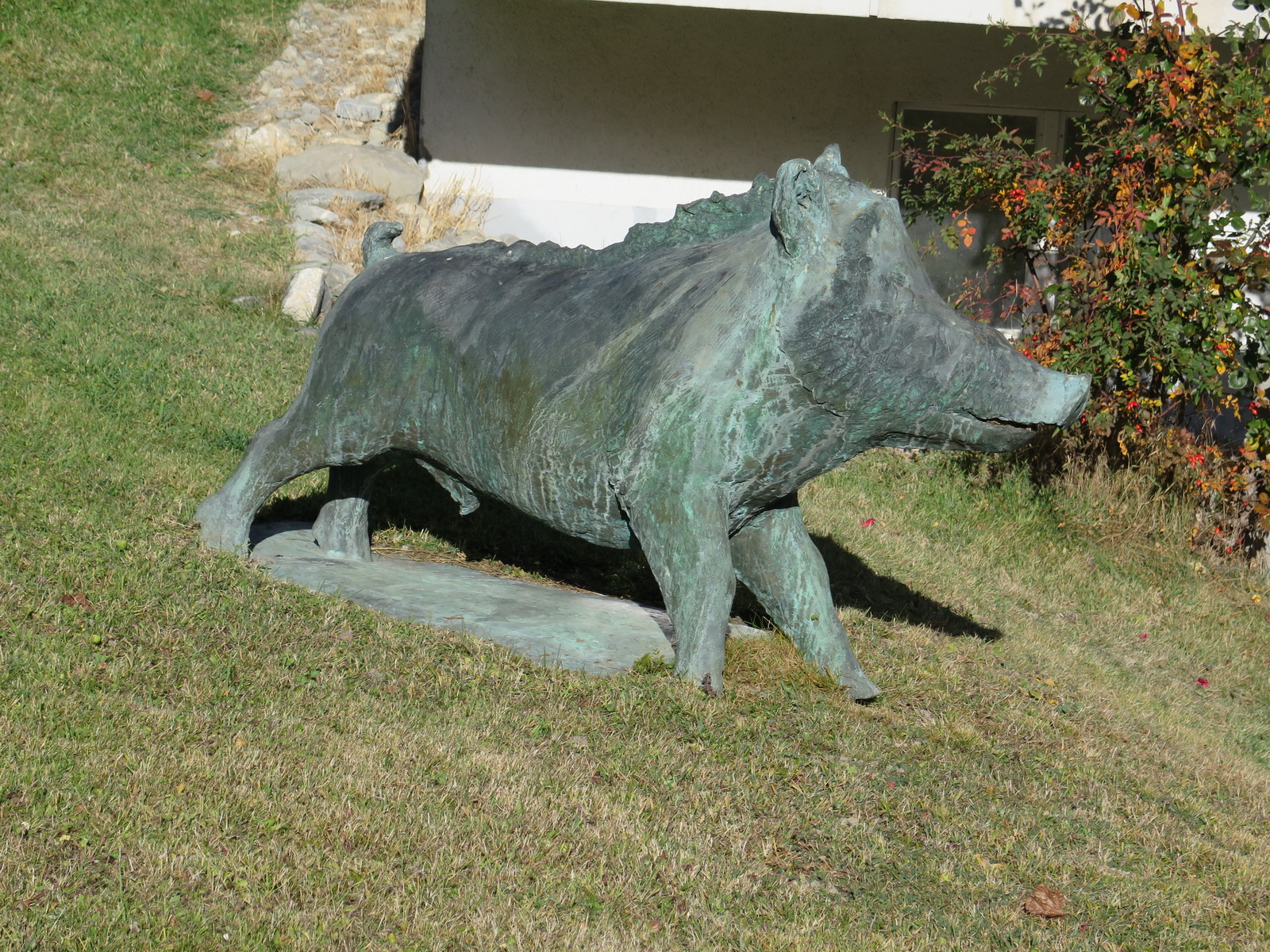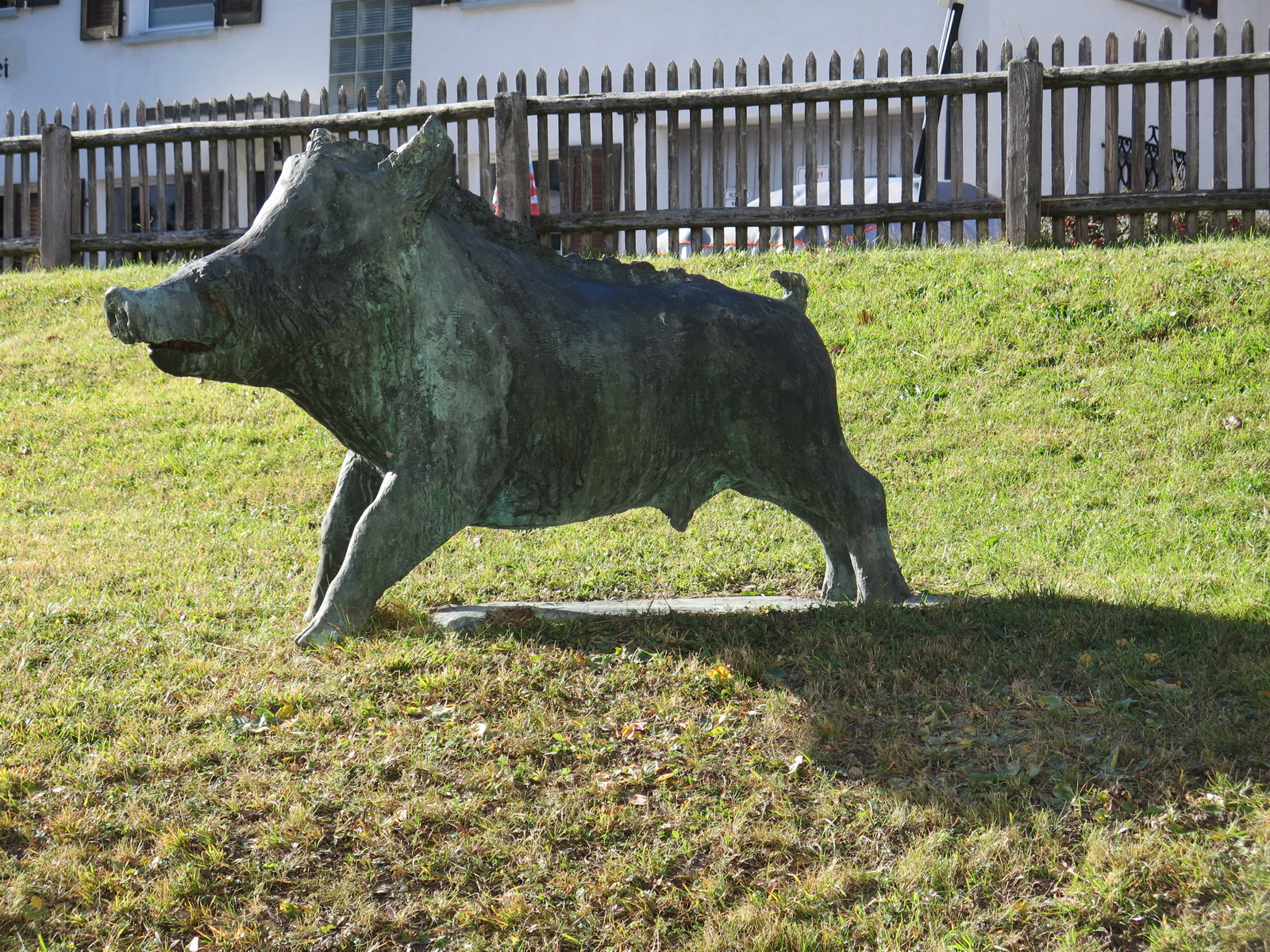 | Die Besitzer des Grundstückes und der Liegenschaft in der Ostschweiz, auf welcher die abgebildete Wildschwein-Skulptur aufgestellt ist, haben berichtet, dass eines schönen Tages ein Herr aus dem "oberen Nordwestschweizer Halbkanton" mit einem Lastwagen vorgefahren sei und sich angeschickt habe, die Skulptur aufzuladen und mitzunehmen resp. "abzuholen", wie der inzwischen verstorbene Herr sich auszudrücken pflegte. Vermutlich hatte der Lastwagenbenutzer in Erfahrung gebracht, dass in jenen Tagen die Besitzer der Skulptur abwesend waren. Was er vermutlich nicht wissen konnte ist der Umstand, dass ein naher Verwandter der abwesenden Besitzer die Szene aus der Nähe beobachtete und darauf einschritt und das Abhol-Vorhaben vereitelte. Auf diese Weise sich erkannt und beschämend verjagt sehend musste der verhinderte Täter unverrichteter Dinge wieder abziehen. Interessant ist die Geschichte trotzdem, denn die verwendete Taktik scheint kein Einzelfall gewesen zu sein. Welche Schritte dann auf dem Rechtswege erfolgt waren, wurde nicht mitgeteilt. |