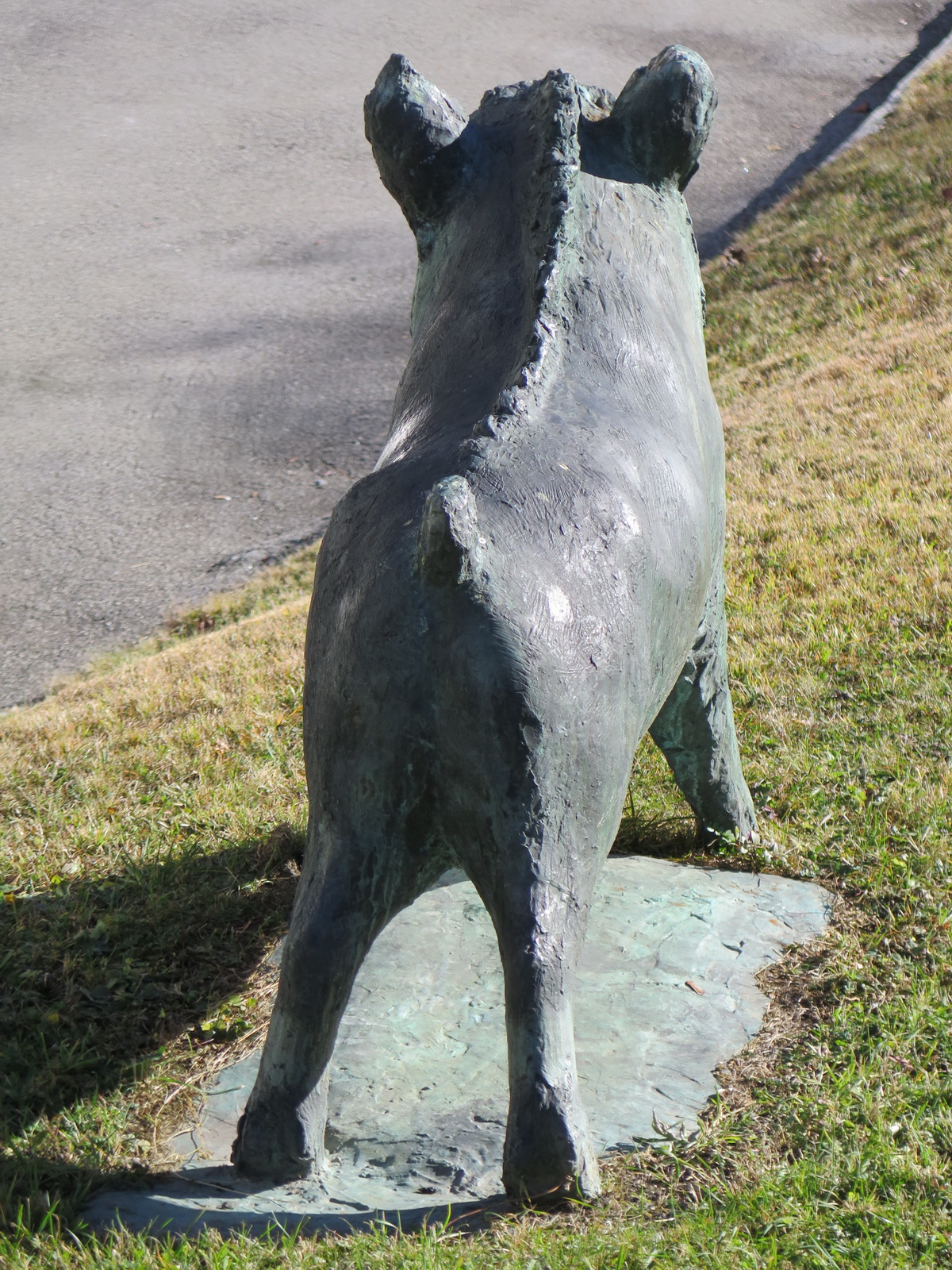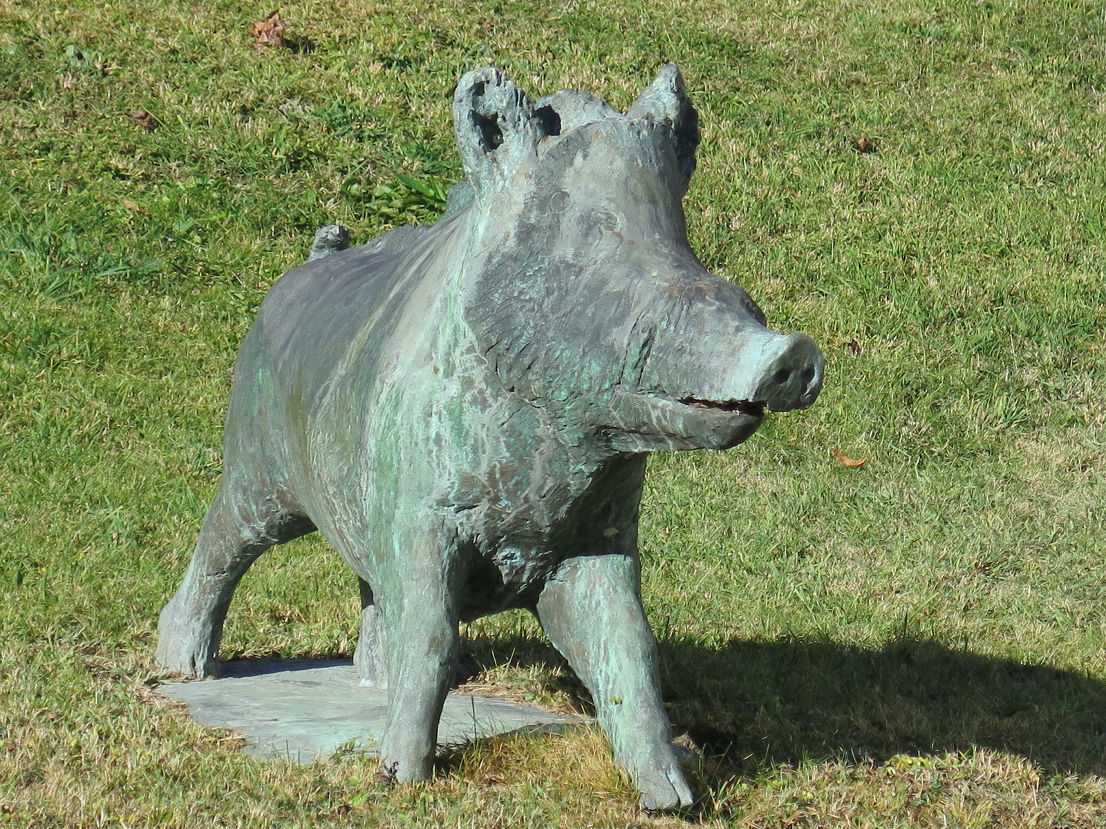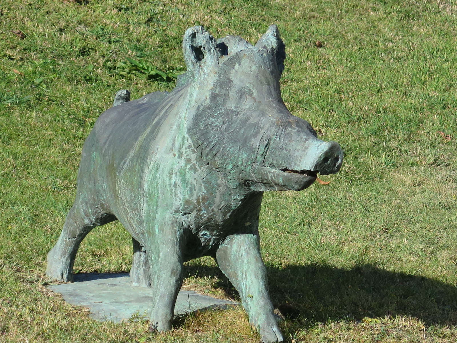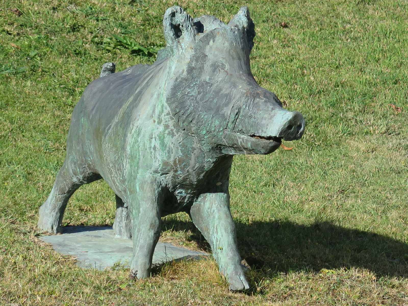 | Die Besitzer des Grundstückes und der Liegenschaft in der Ostschweiz, auf welcher die abgebildete Wildschwein-Skulptur aufgestellt ist, haben berichtet, dass eines schönen Tages ein Herr aus dem "oberen Nordwestschweizer Halbkanton" mit einem Lastwagen vorgefahren sei und sich angeschickt habe, die Skulptur aufzuladen und mitzunehmen resp. "abzuholen", wie der inzwischen verstorbene Herr sich auszudrücken pflegte. Vermutlich hatte der Lastwagenbenutzer in Erfahrung gebracht, dass in jenen Tagen die Besitzer der Skulptur abwesend waren. Was er vermutlich nicht wissen konnte ist der Umstand, dass ein naher Verwandter der abwesenden Besitzer die Szene aus der Nähe beobachtete und darauf einschritt und das Abhol-Vorhaben vereitelte. Auf diese Weise sich erkannt und beschämend verjagt sehend musste der verhinderte Täter unverrichteter Dinge wieder abziehen. Interessant ist die Geschichte trotzdem, denn die verwendete Taktik scheint kein Einzelfall gewesen zu sein. Welche Schritte dann auf dem Rechtswege erfolgt waren, wurde nicht mitgeteilt. |