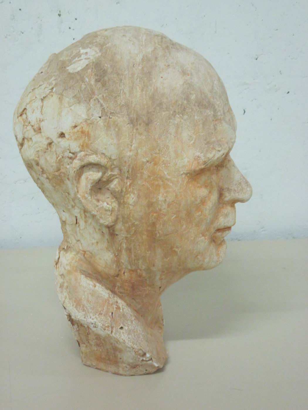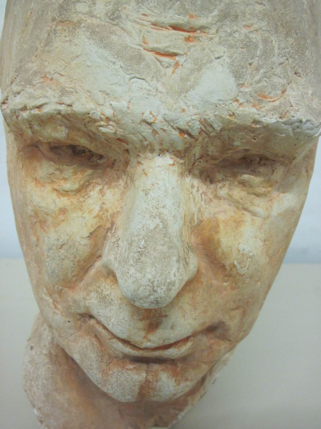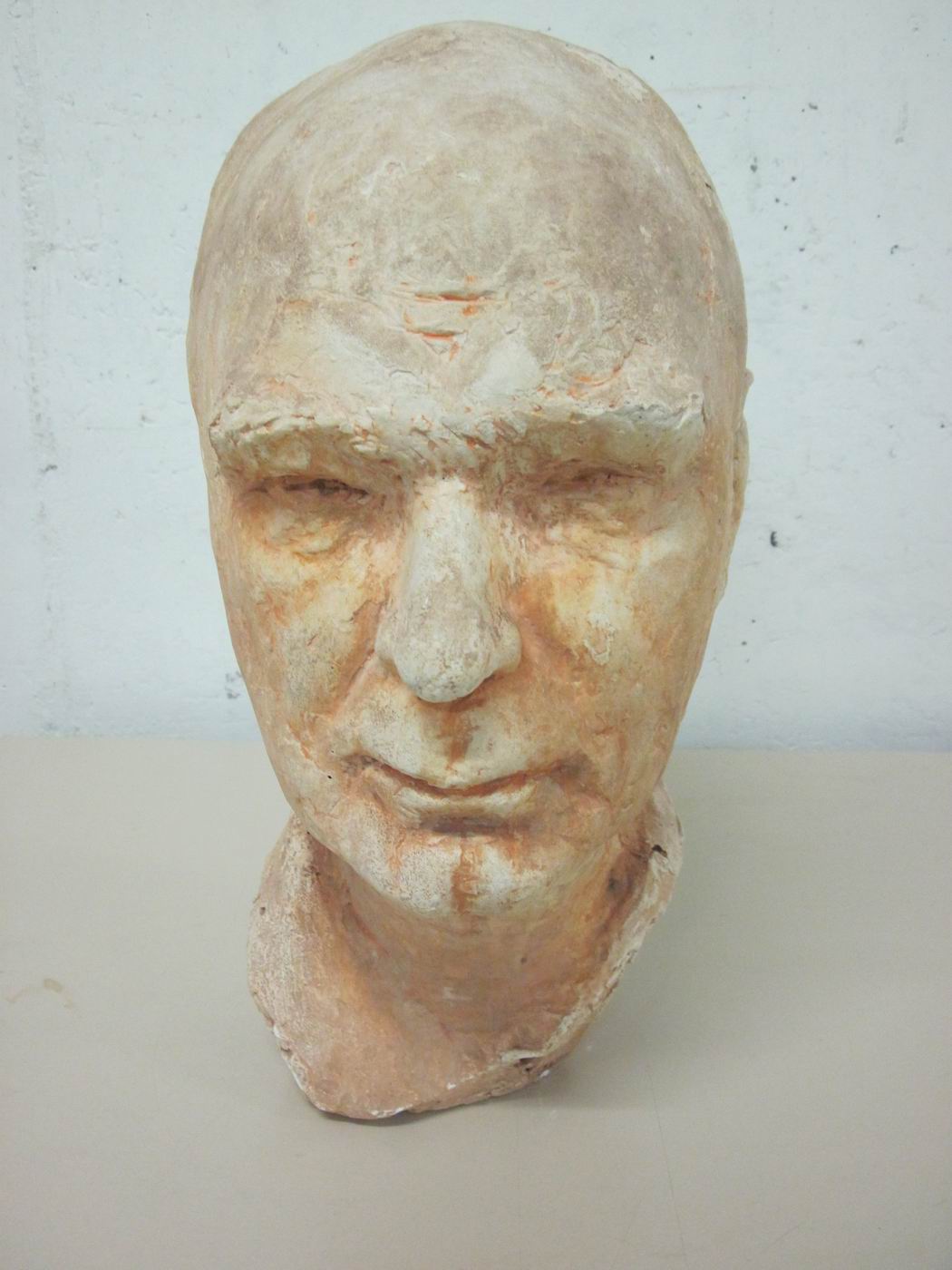Nach Aussage von Anwesenden, welche anlässlich der Herstellung der gezeigten Fotoaufnahmen mit Restaurationen am Ort der Aufnahmen beschäftigt waren, handelt es sich hier um den Kopf eines Unbekannten, welcher angeblich beim Modellieren bei Probst in Peney in der Nähe von Genf nicht still sitzen konnte und dann diesen Kopf auch nicht entgegennehmen, nicht haben und nicht behalten wollte, worauf ihn angeblich eine öffentliche Institution geschenkt bekam, welche ihn jetzt zu ihrer Sammlung zählt. Dies sei vermutlich um 1963 geschehen (anlässlich der Auswahl von Großplastiken für größere öffentliche Gebäude in Dreiland). Unglaublich, wie Probst es geschafft hat, dem Material eine Psyche einzuhauchen, so dass es scheint, im Gips sein noch Leben drin! Es handelt sich bei der Figur um eine Großausführung in etwa drei bis vierfacher natürlicher Größe. (Probst soll nach der Aussage eines Anwesenden angeblich bemerkt haben: "Damit man ihn nicht übersieht.") Probst hat viele Großfiguren geschaffen. Ist eine große Figur einfacher zu machen - oder schwieriger - als eine kleine Figur? |