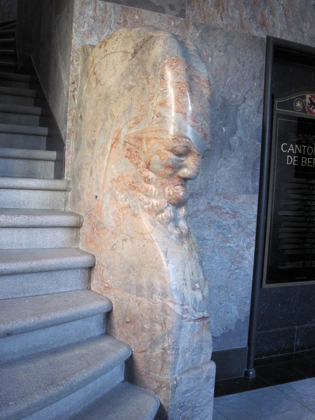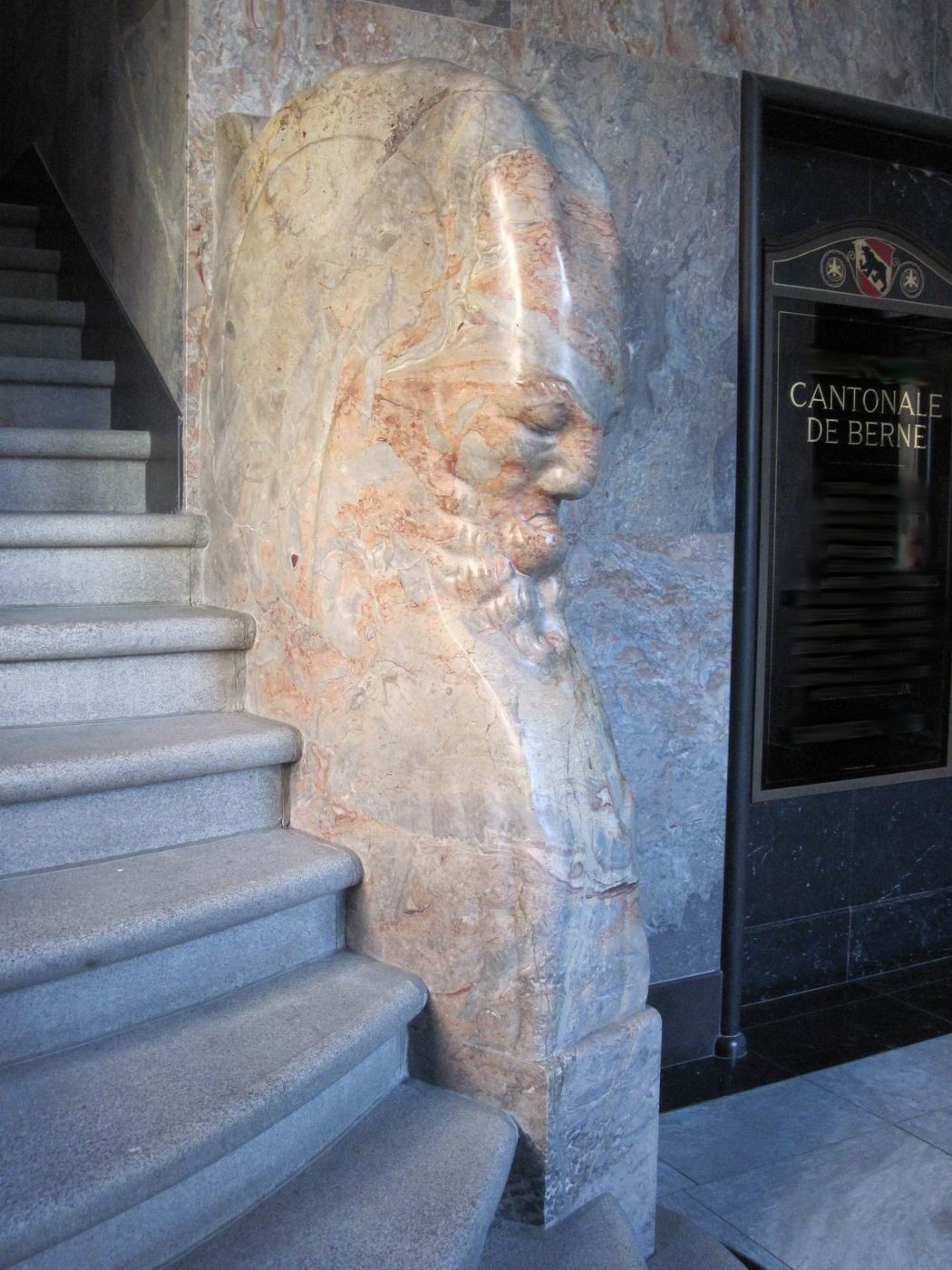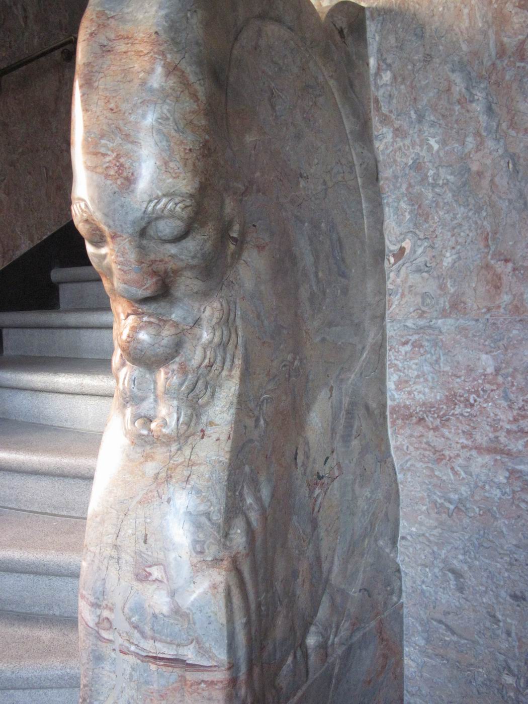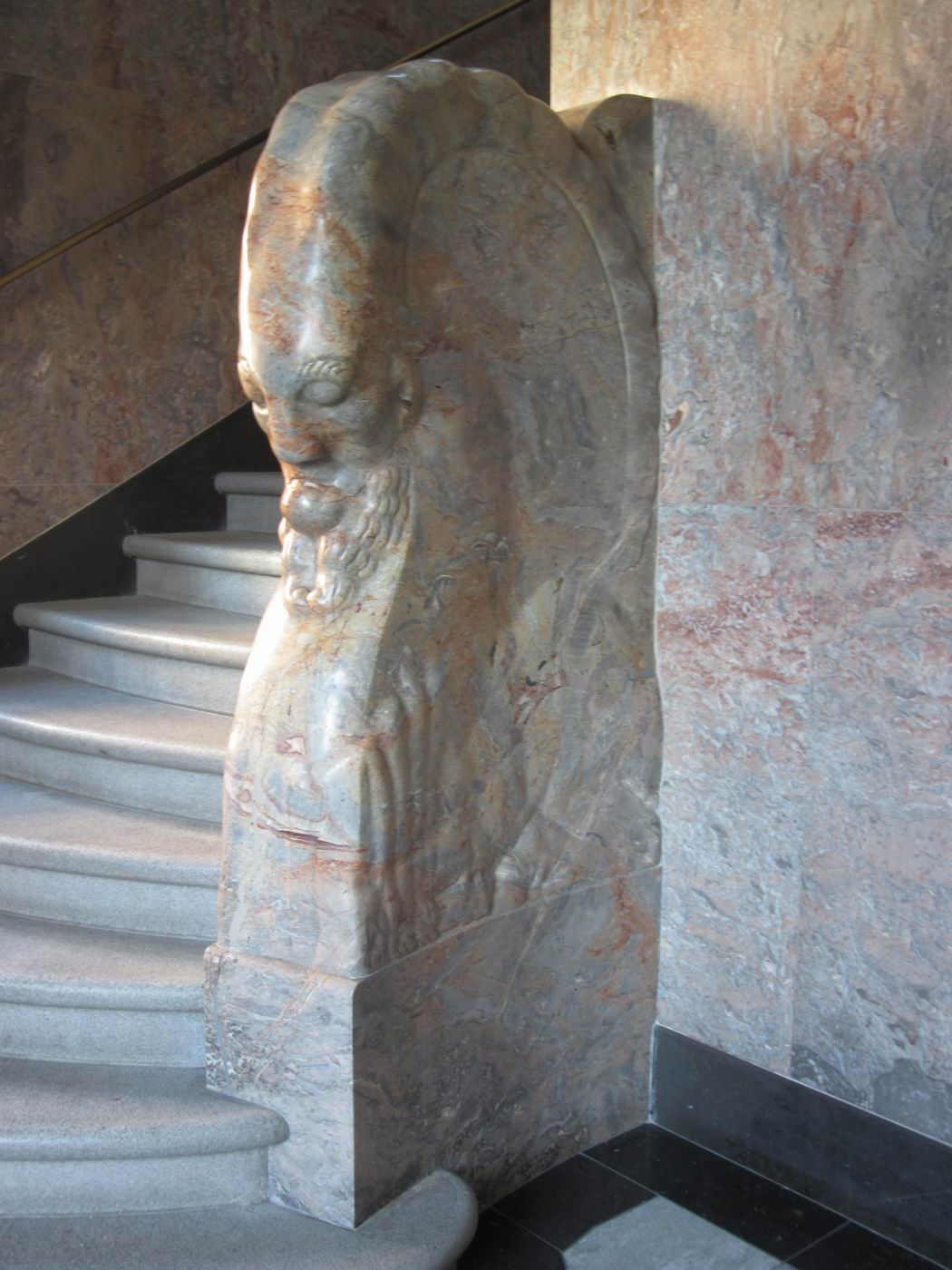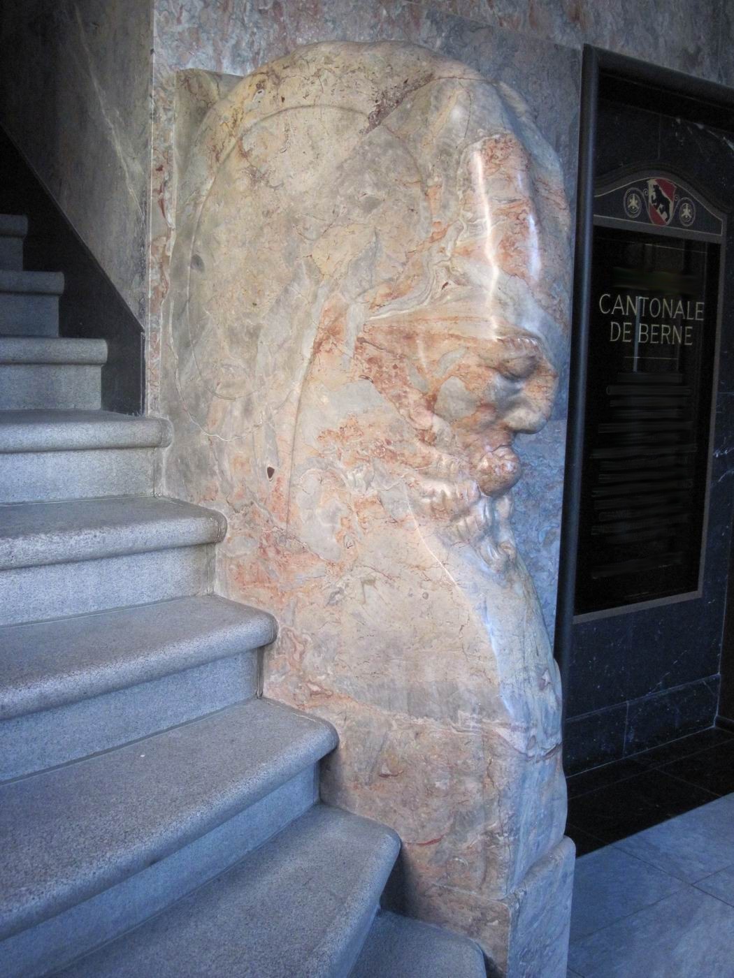 Der verschwiegene Steinbock als Bewacher der gebirgigen Höhen der Treppe: Ein Frühwerk aus Marmor, vielleicht Rosenlaui (Berner Oberland, rötliche Färbung) - in einer Repräsentationshalle an der Treppe. Hier zeigt sich dem erstaunten Betrachter, dass Probst nach so kurzen Jahren nach der Mobilmachung zum ersten. Weltkrieg und neben seinem Dienst in der Armee schon das Niveau zum ganz großen Meister erreicht hatte. Ein unglaublich beeindruckendes wie auch sehr schönes Werk. Die Fotografie kann davon nur eine Ahnung vermitteln. |