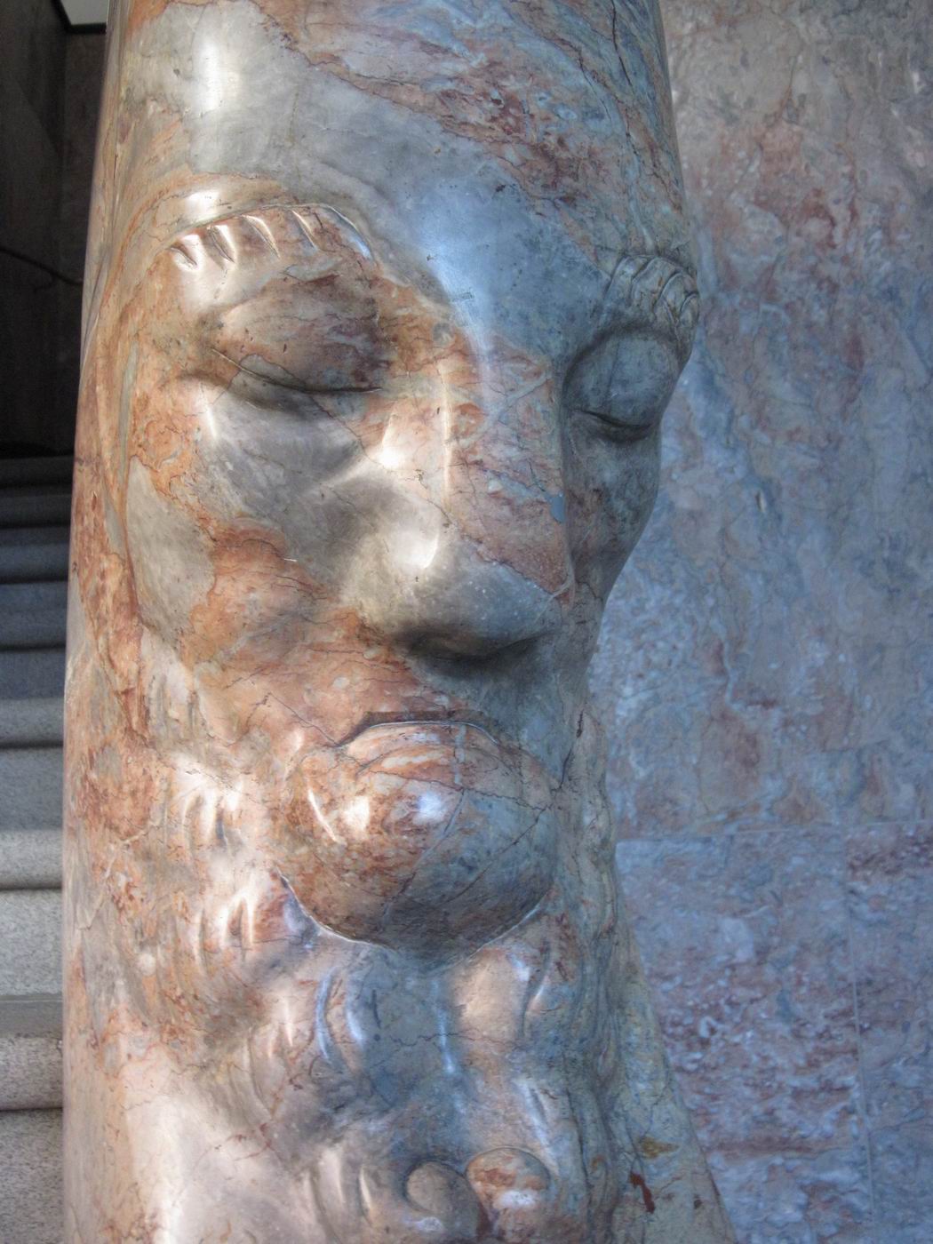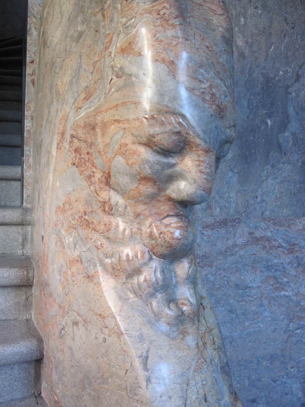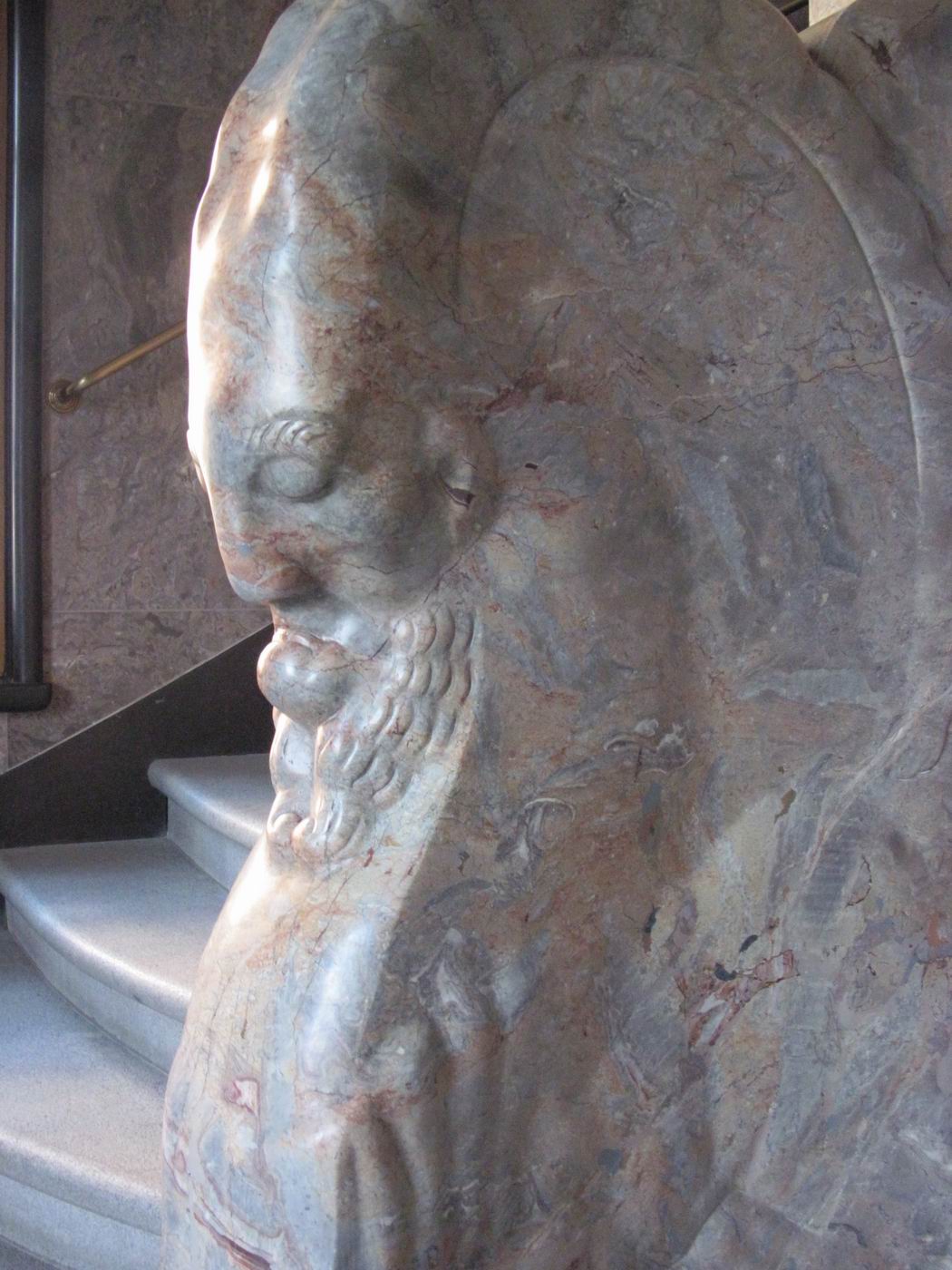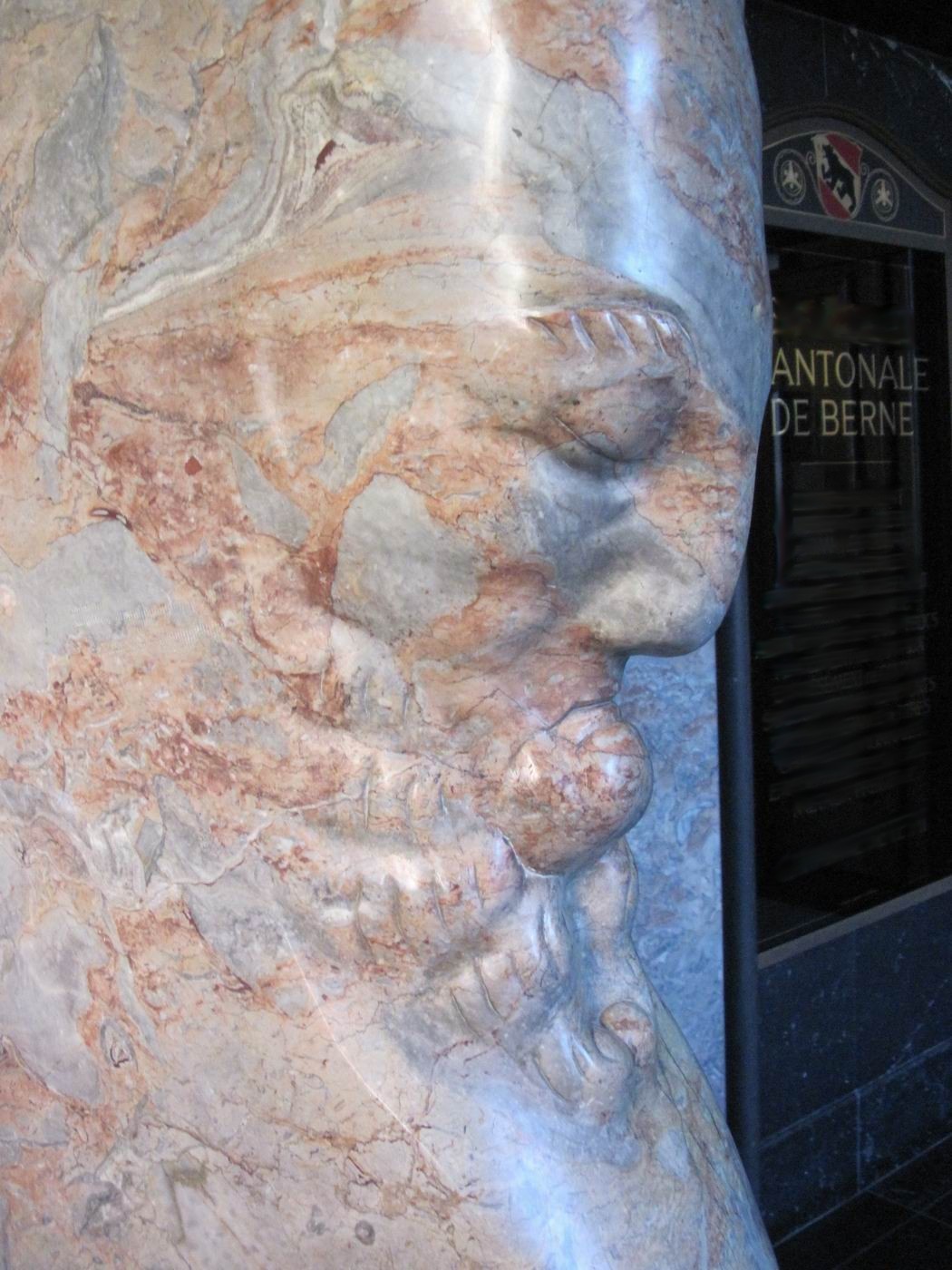 Der verschwiegene Steinbock als Bewacher der gebirgigen Höhen der Treppe: Ein Frühwerk aus Marmor, vielleicht Rosenlaui (Berner Oberland, rötliche Färbung) - in einer Repräsentationshalle an der Treppe. Hier zeigt sich dem erstaunten Betrachter, dass Probst nach so kurzen Jahren nach der Mobilmachung zum ersten. Weltkrieg und neben seinem Dienst in der Armee schon das Niveau zum ganz großen Meister erreicht hatte. Ein unglaublich beeindruckendes wie auch sehr schönes Werk. Die Fotografie kann davon nur eine Ahnung vermitteln. |