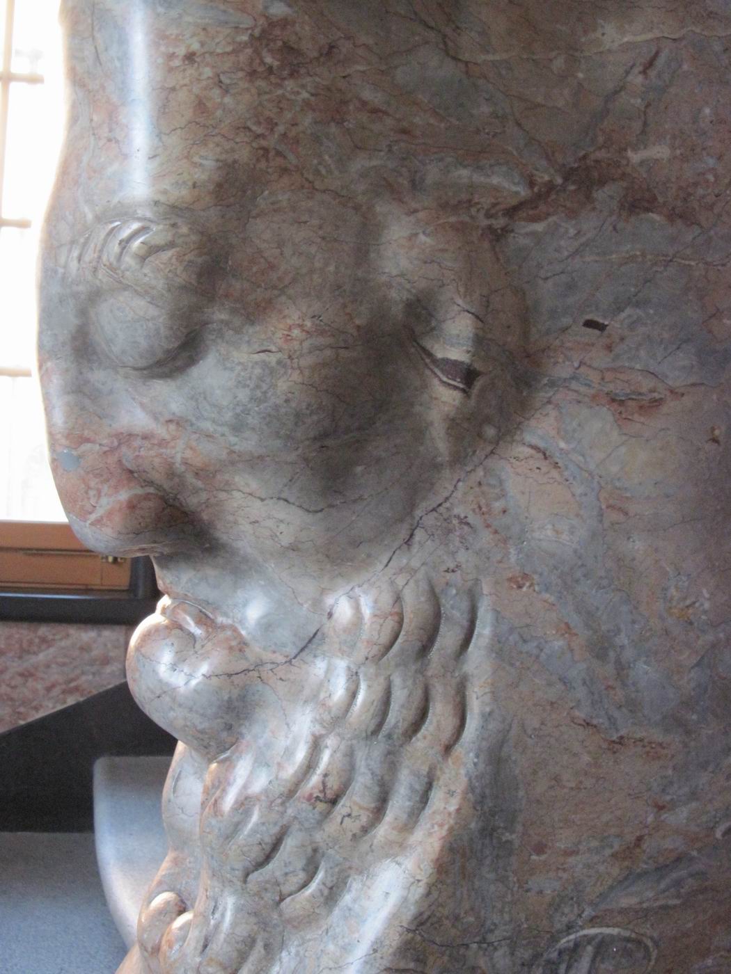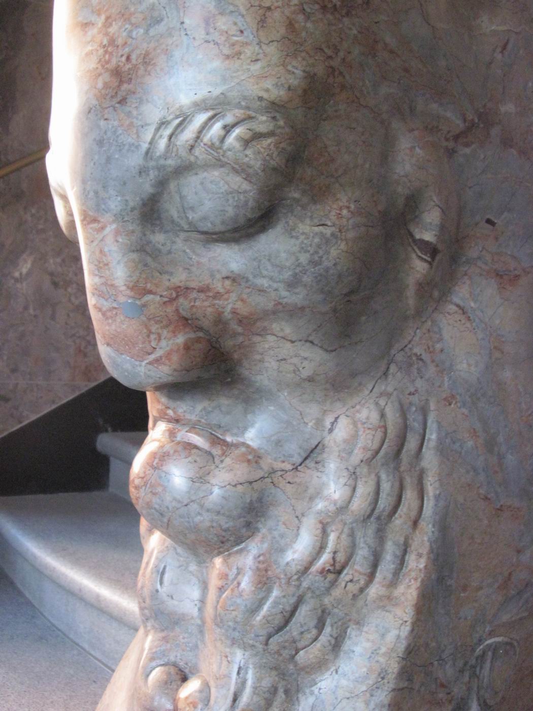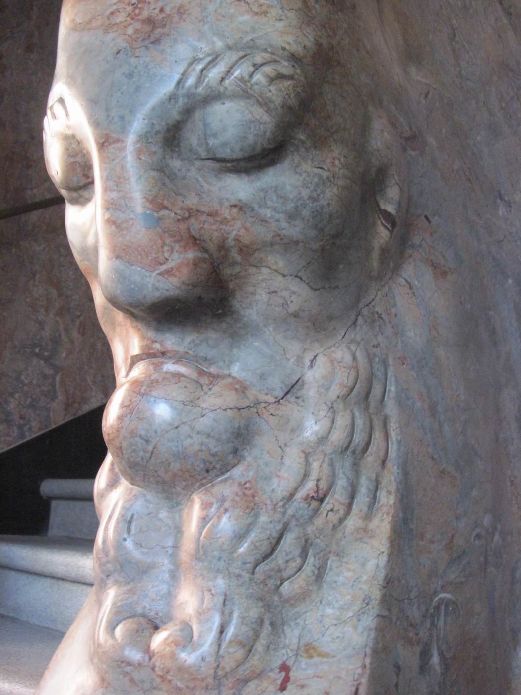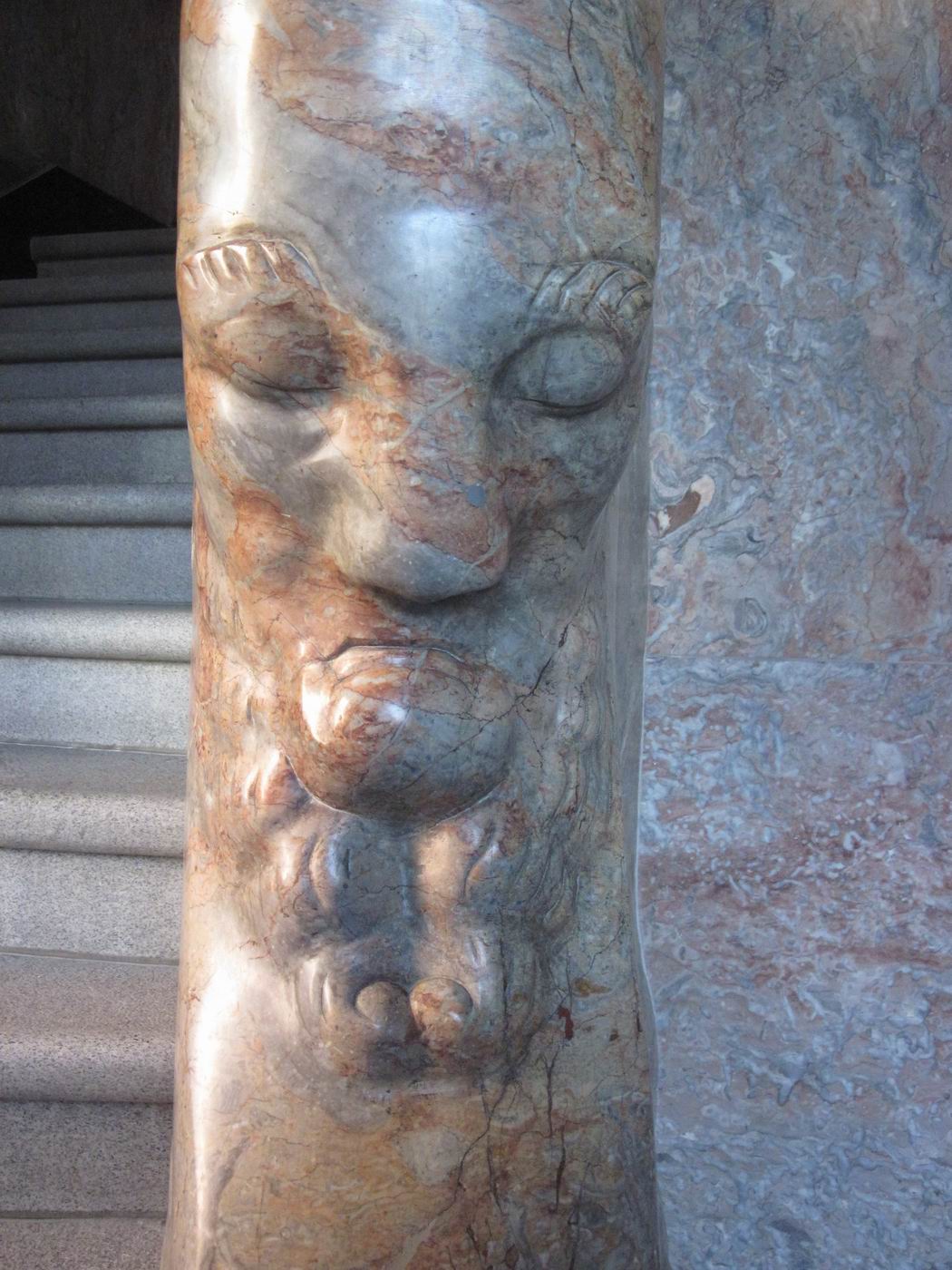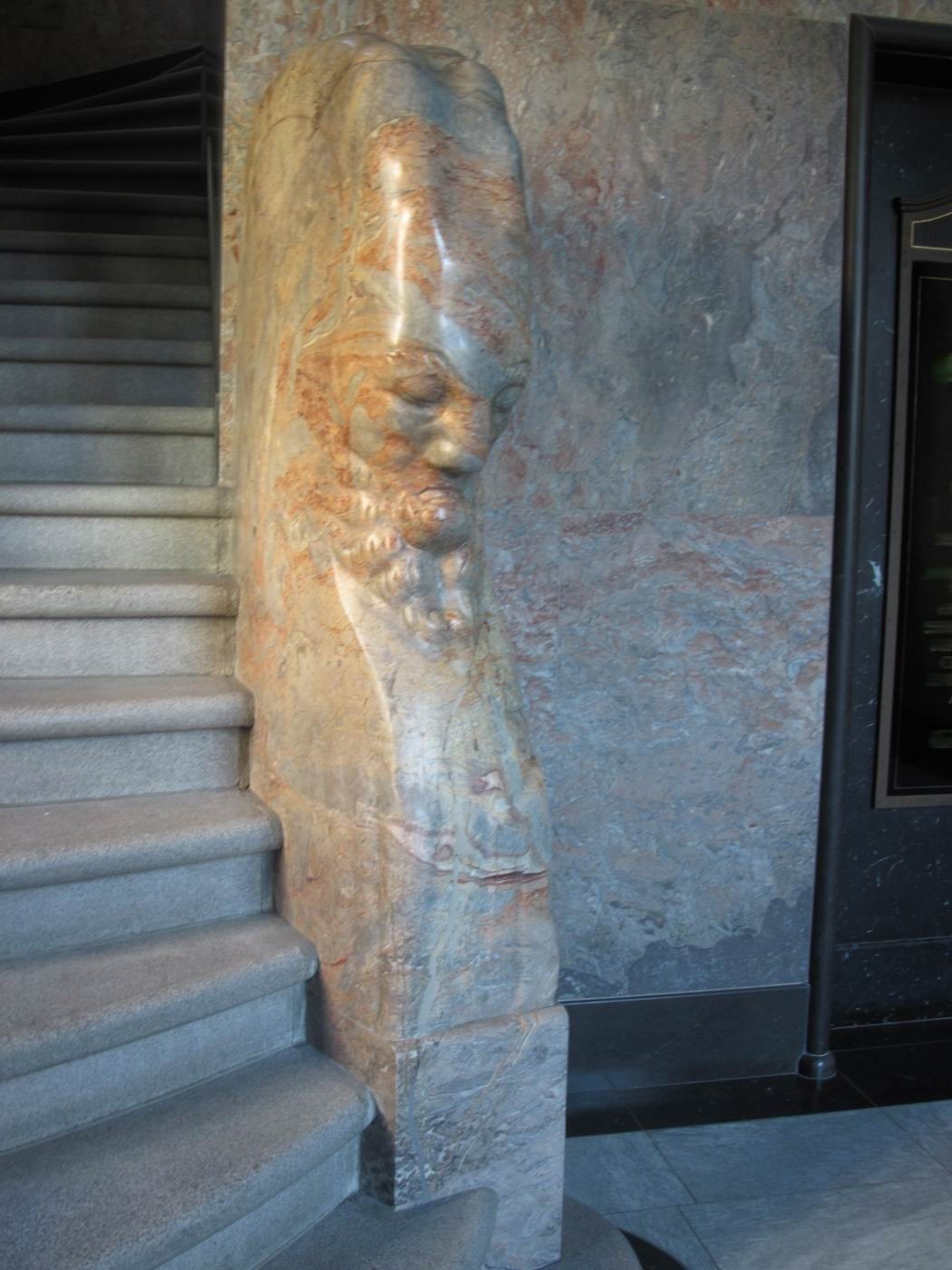 Der verschwiegene Steinbock als Bewacher der gebirgigen Höhen der Treppe: Ein Frühwerk aus Marmor, vielleicht Rosenlaui (Berner Oberland, rötliche Färbung) - in einer Repräsentationshalle an der Treppe. Hier zeigt sich dem erstaunten Betrachter, dass Probst nach so kurzen Jahren nach der Mobilmachung zum ersten. Weltkrieg und neben seinem Dienst in der Armee schon das Niveau zum ganz großen Meister erreicht hatte. Ein unglaublich beeindruckendes wie auch sehr schönes Werk. Die Fotografie kann davon nur eine Ahnung vermitteln. |