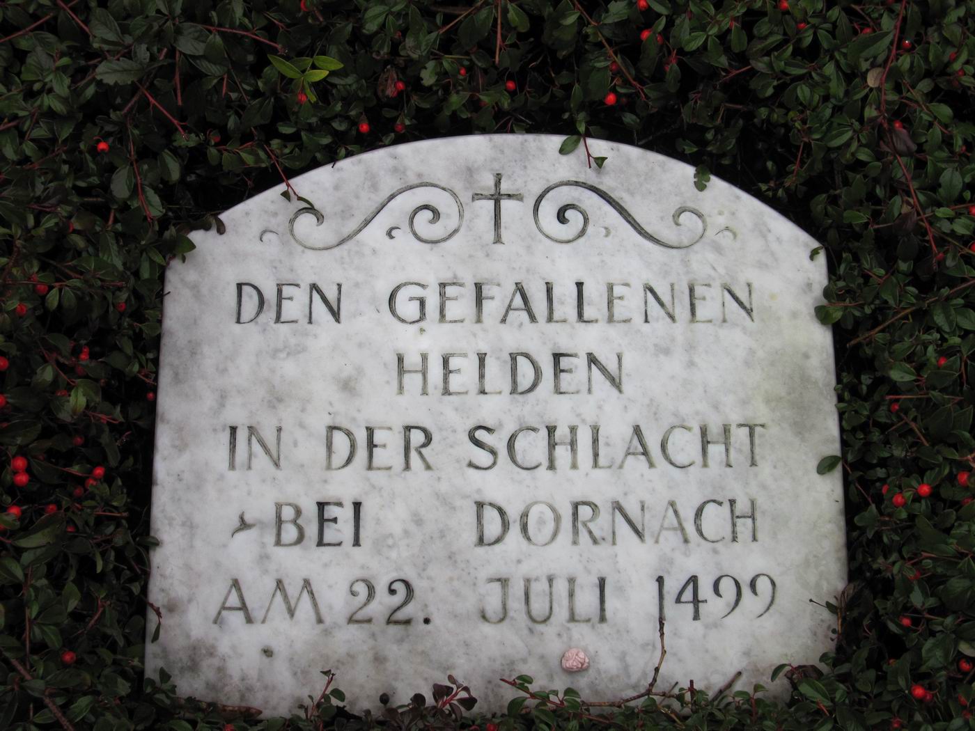 Das Monument ist nicht sehr groß. Es hätte auf einem Grabe Platz. Aufgestellt hat man es innerhalb der Umfriedungsmauer im Osten der alten Mauritius-Kirche Dornach (heute Museum) zum "Gedenken der gefallenen Helden in der Schlacht bei Dornach am 22. Juli 1499". Es darf sehr vermutet werden, dass in der darunter liegenden Erde einige der Opfer dieses "Schwaben-Krieges" begraben liegen. |