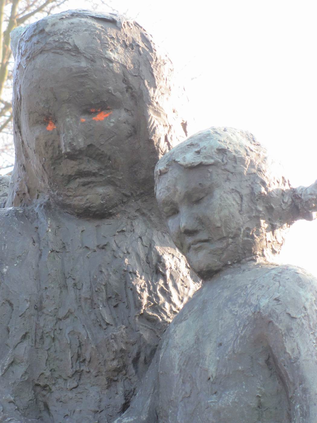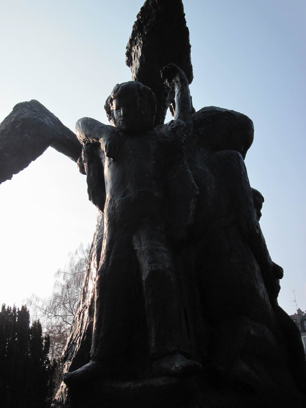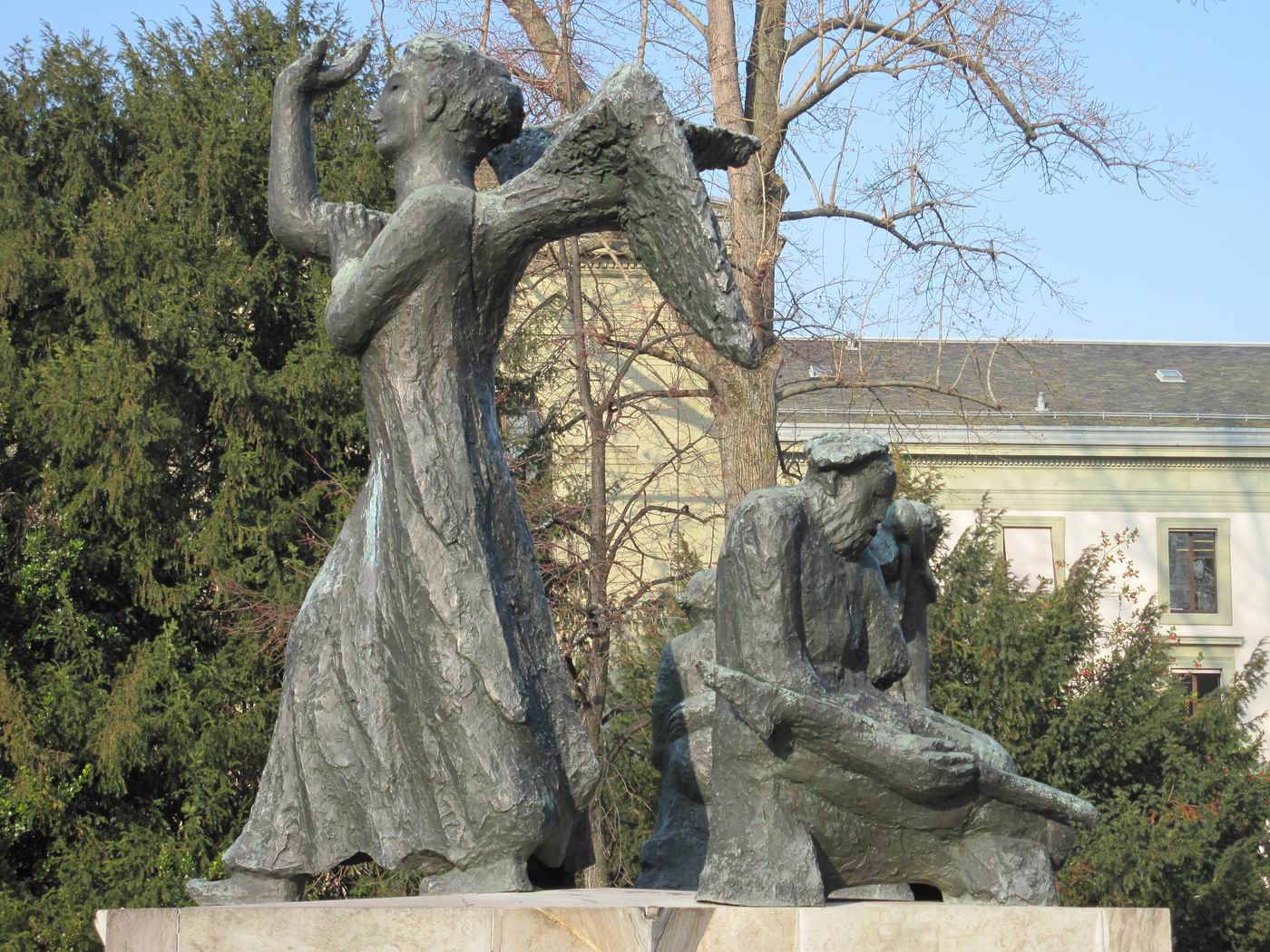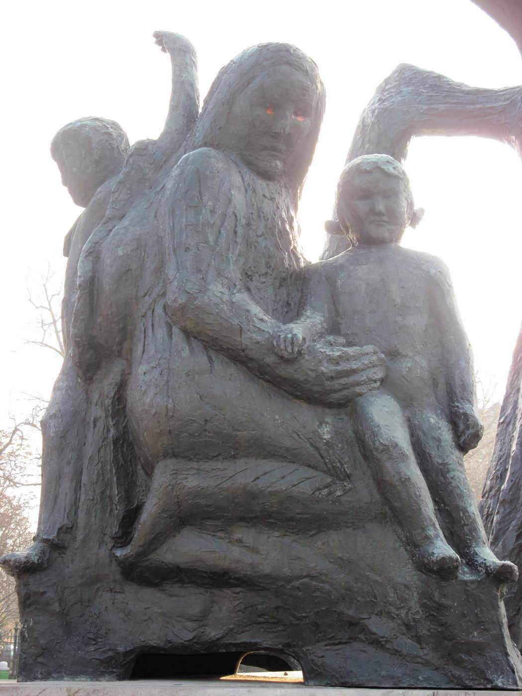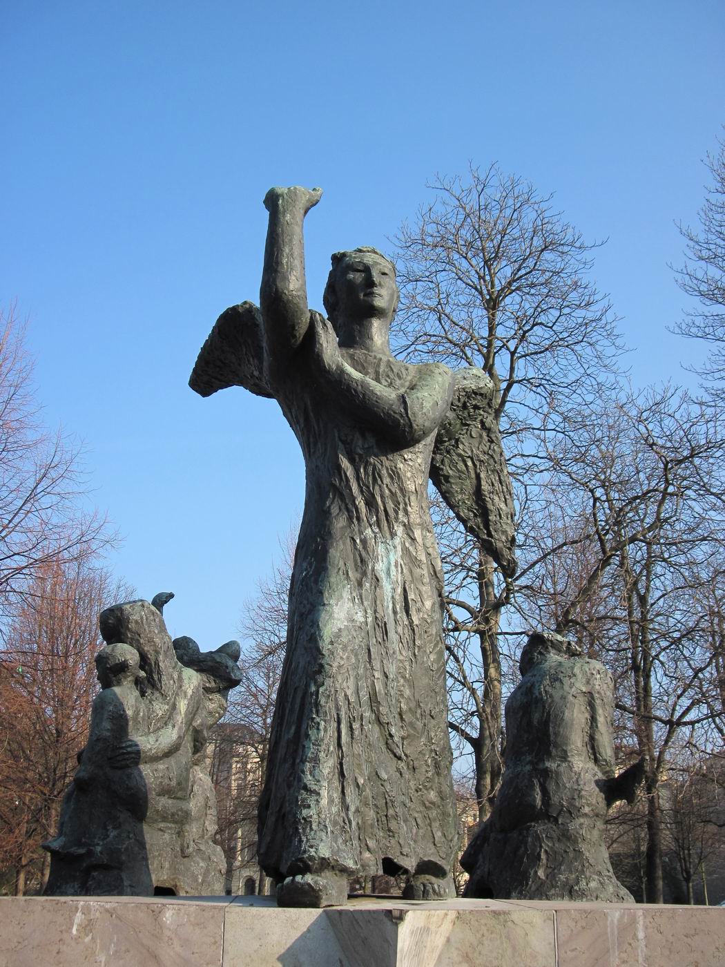 Dreigegliedert in Schutzengel (auch als Erzengel Gabriel beschrieben), Mutter mit Kindern (auch Hungernde) und sterbender Krieger