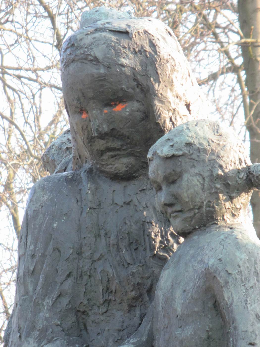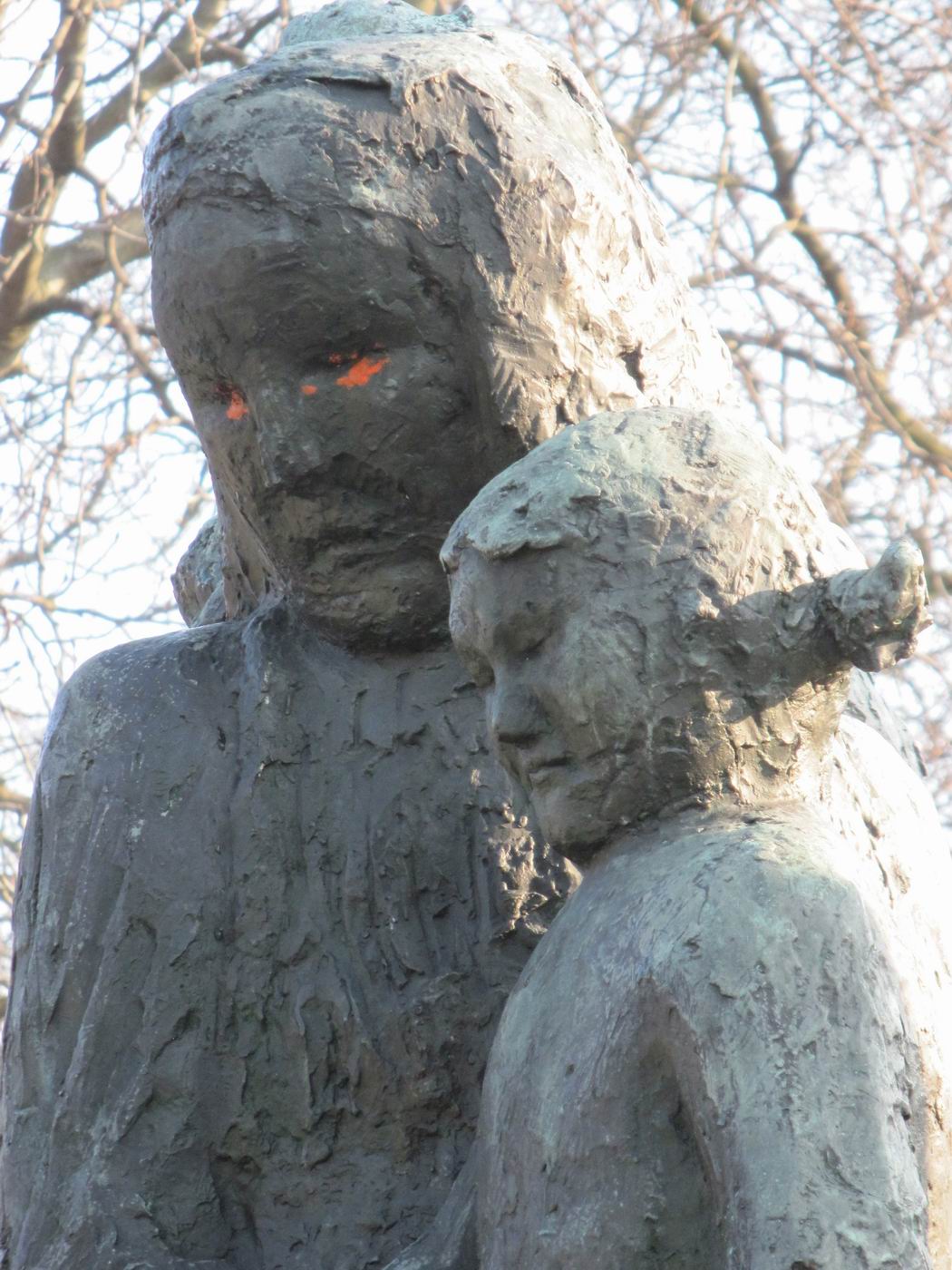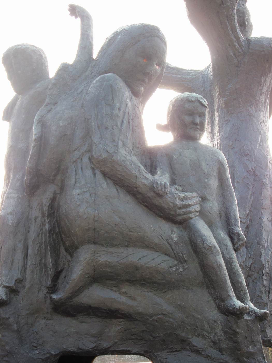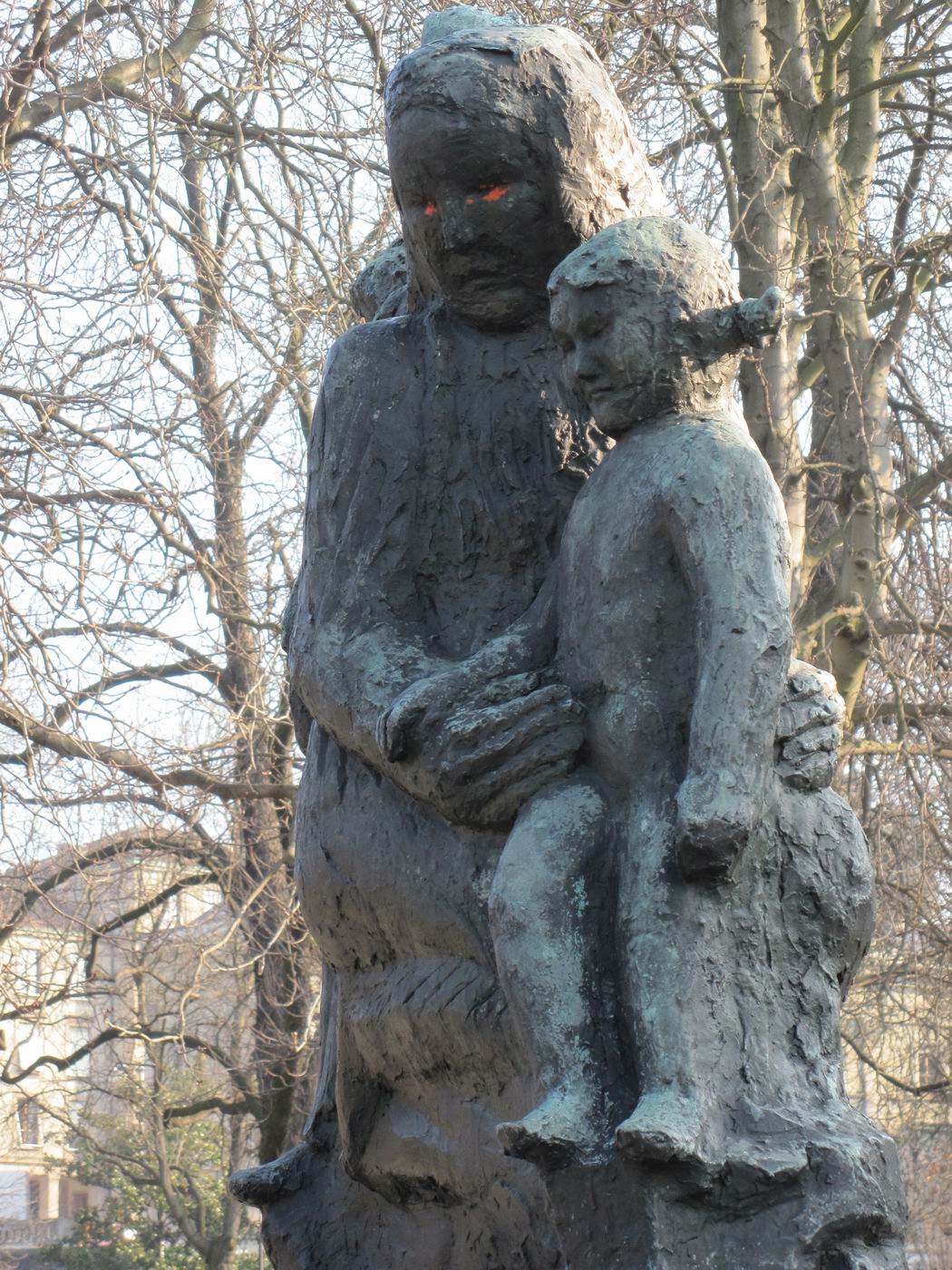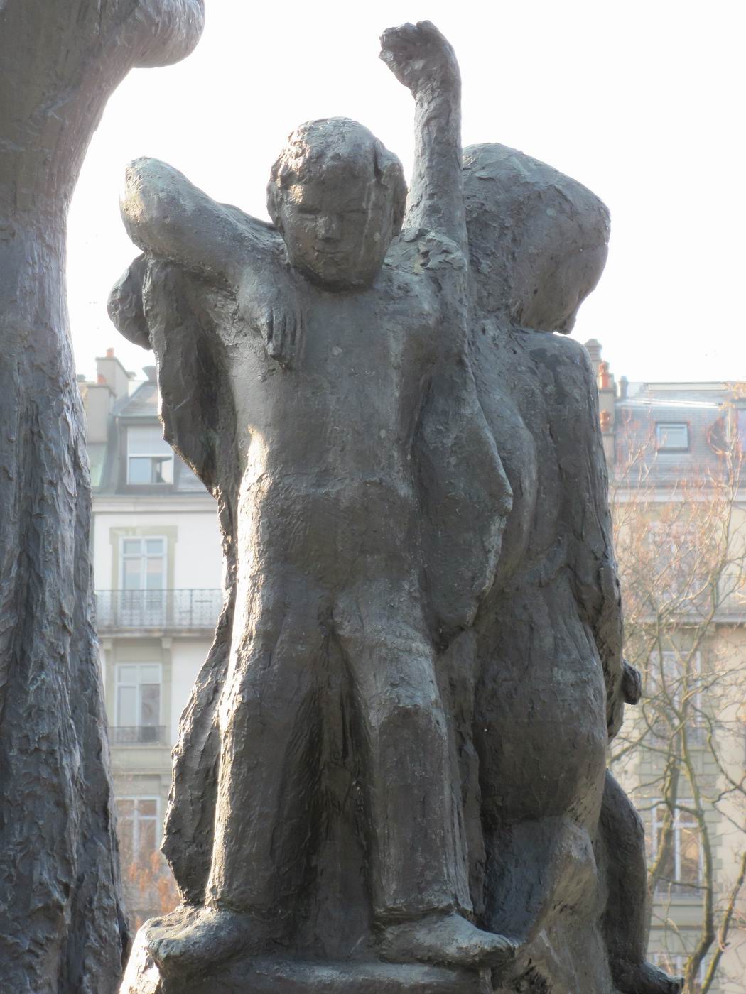 Dreigegliedert in Schutzengel (auch als Erzengel Gabriel beschrieben), Mutter mit Kindern (auch Hungernde) und sterbender Krieger
