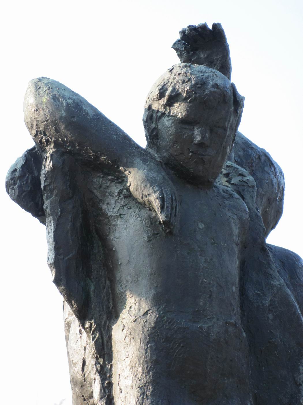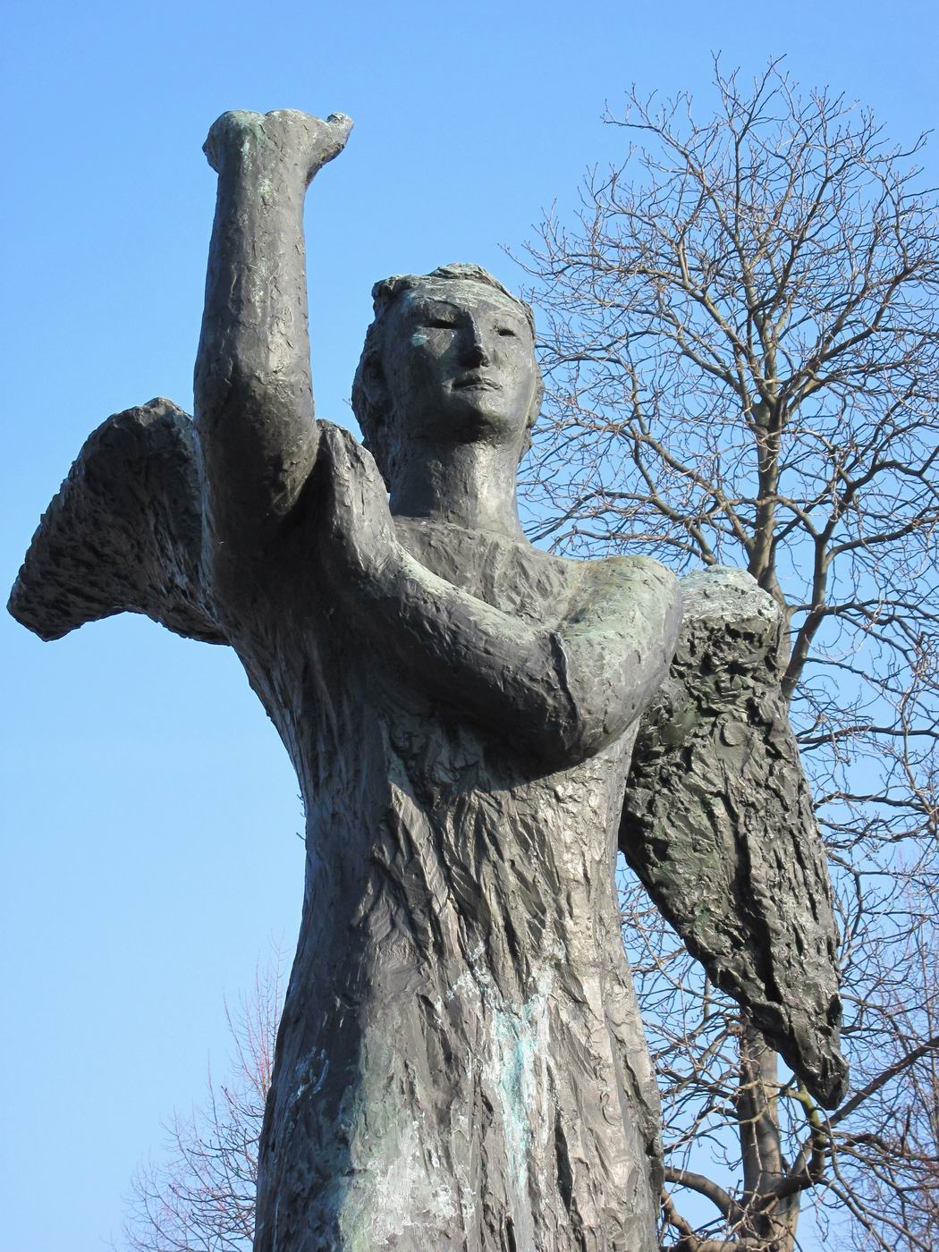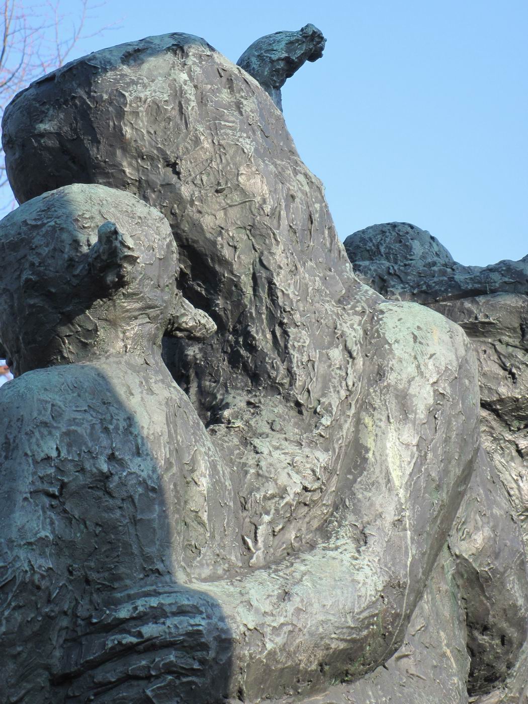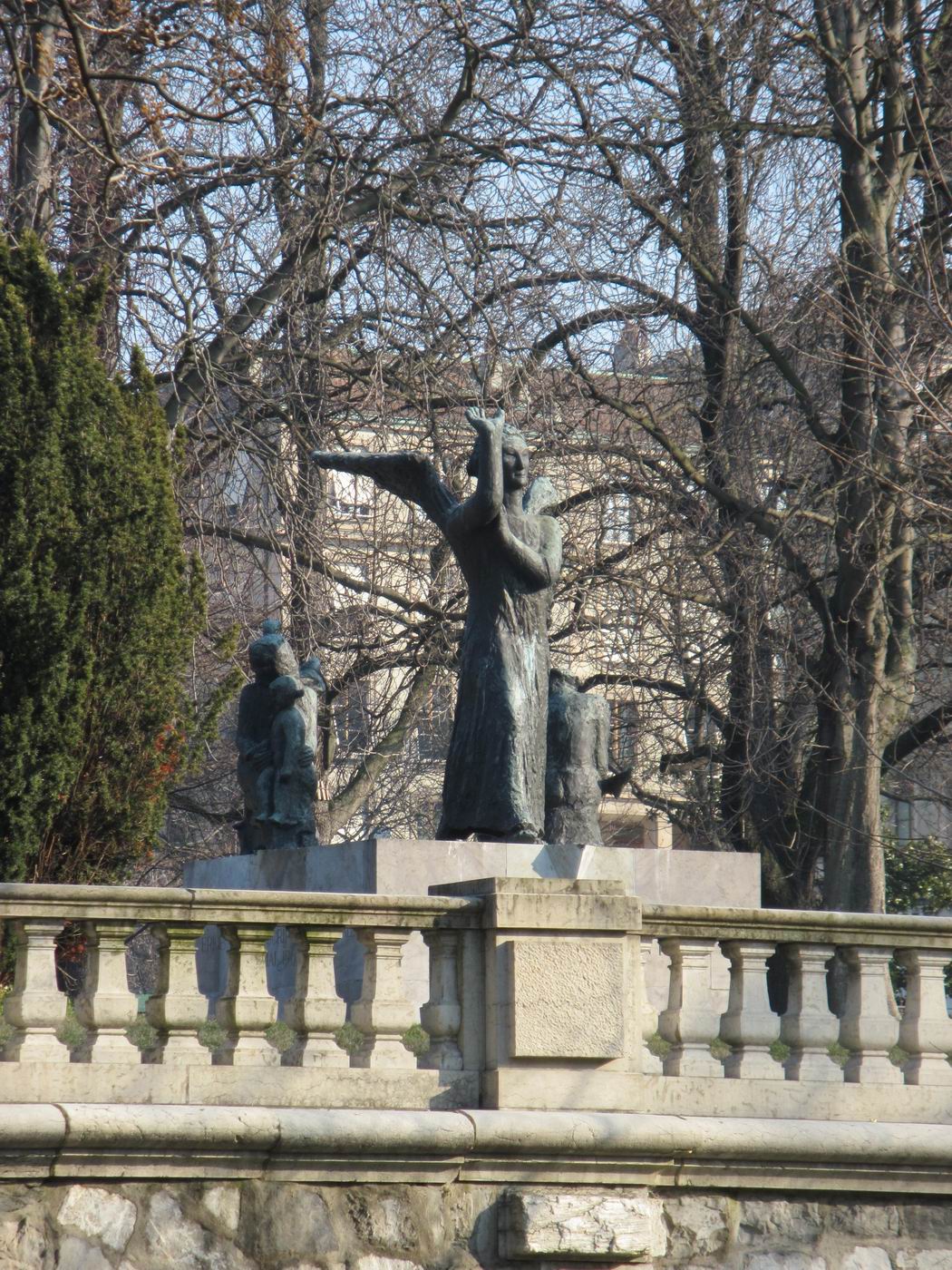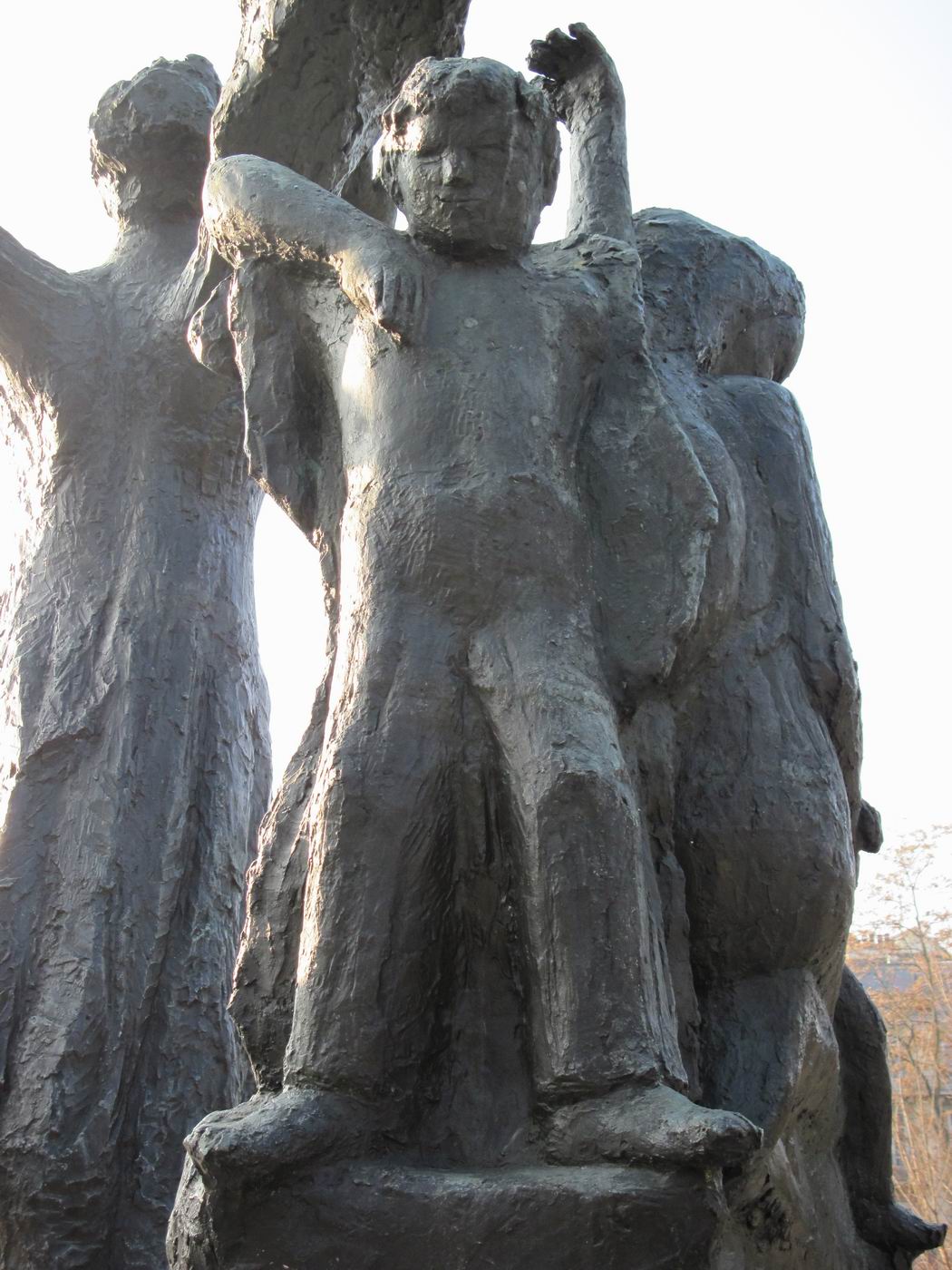 Dreigegliedert in Schutzengel (auch als Erzengel Gabriel beschrieben), Mutter mit Kindern (auch Hungernde) und sterbender Krieger