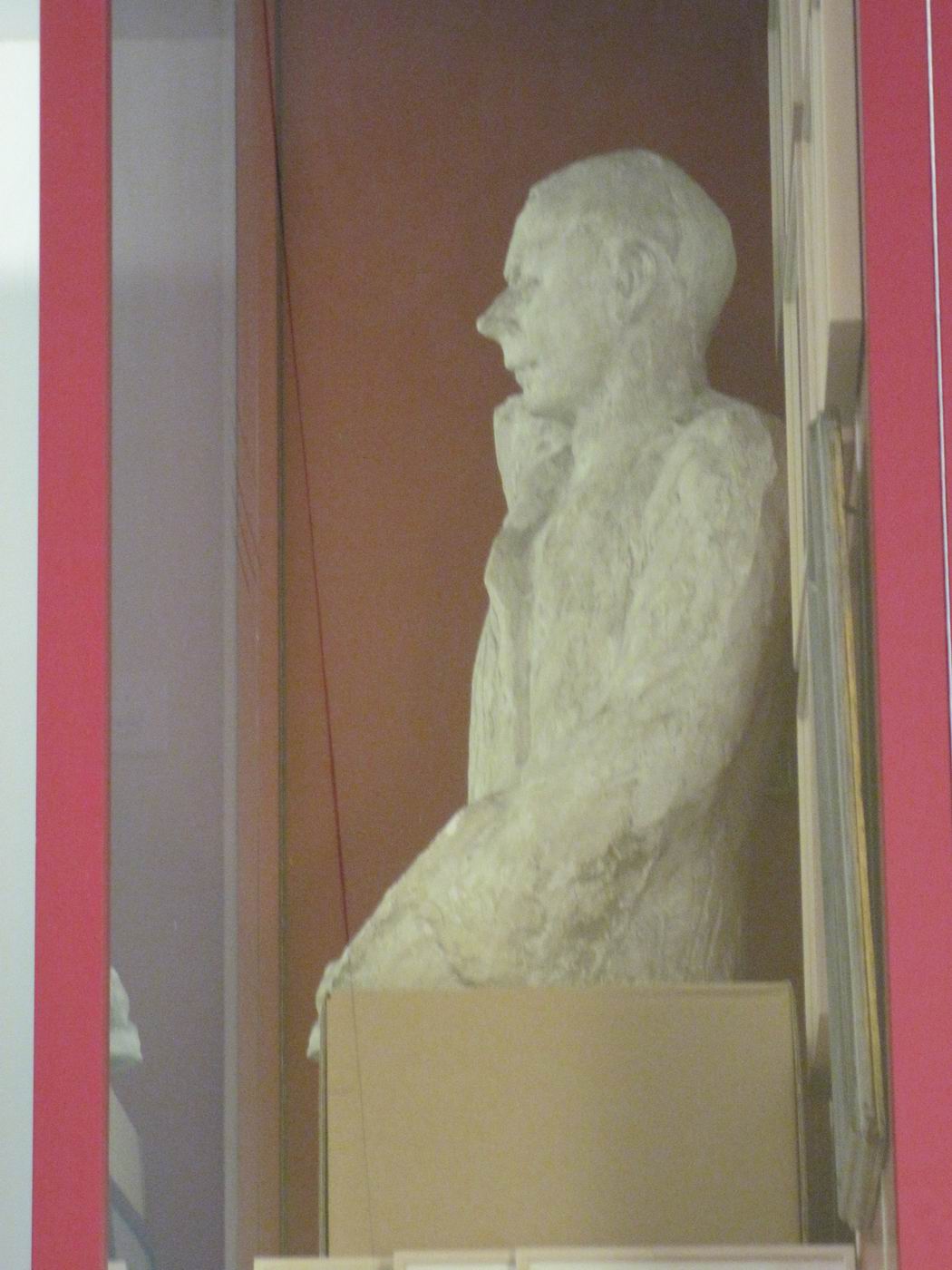Von der Figur existiert auch eine Terracotta-Version. Die geplante Stein-Version konnte nicht fertig gestellt werden. Ein erster Versuch endete mit einem Benjamin, d.h. der Stein war innen faul. Ein wesentliches Stück hatte sich abgespalten. Siehe Link. Später ist Plattner dann verstorben... (Otto Plattner : * 29. Juni 1886 in Liestal; † 20. Oktober 1951 in Stein am Rhein.) Bei der so genannten "Totenmaske" könnte es sich auch um einen Gesichtsabguss des lebenden Otto Plattner handeln, welche als Arbeitsvorlage gedient haben könnte. Plattner lebte damals vermutlich erst in der Gegend von Liestal, später aber in Stein am Rhein. Probst lebte in der Gegend von Genf: Das scheint schwierig gewesen zu sein für eine Kommunikation zu Formfragen... Otto Plattner hat Probsts Schicksal wesentlich beeinflusst. Auf Plattners Rat hin ist Probst nach Paris gegangen um Architektur zu studieren - und kam als Bildhauer zurück... Bei der unten gezeigten Ausstellungsart handelt es sich angeblich um eine Behelfsversion. Der Betrachter möge das verzeihen. Mit der Schachtel ist es besser als wenn man die Figur gar nicht sehen könnte, weil man sie wegen des fehlenden Sockels hätte für das öffentliche Auge wegschließen müssen... |