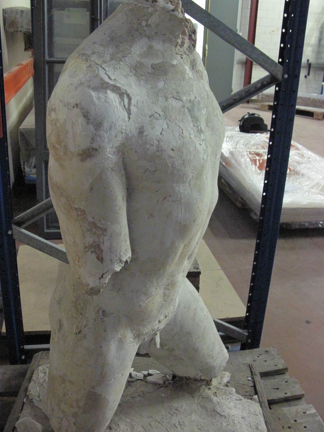 Das Modell gehört zur Sammlung aus Probsts Atelier in Genf, welche nach Probsts Tod vom Architekten Max Schneider nach Reigoldswil geholt worden ist. Da momentan kein älteres Fotomaterial zu diesem Torso aufgefunden werden konnte, bleibt nur die Mutmaßung, dass es sich um den Torso des Schweizer Typs handelt. Die Plastik existiert auch in Bronze. Diese Variante ist angeblich im Besitz der Eidgenossenschaft. Das Werk ist auch in unrestauriertem Zustand sehr beeindruckend! |