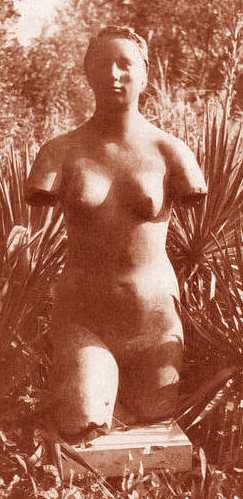 Pomona 1: Bilder 1 bis 3, Bronze. Pomona 2: Bilder 4 bis 9, Terra Cotta (ca. 1.2 m groß). Der Kopf ist vergleichbar mit dem Kopf im ägyptischen Stil (Portrait von M.T.S.) von 1925. Daher ist die Datierung der Pomona 2 um oder etwas nach 1926 wohl die wahrscheinlichste. Zwischen Pomona 1 und 2 existieren Unterschiede in der Haartracht und den Proportionen (Formabweichungen). Pomona 1 steht oder stand angeblich in der Region ZH. Pomona 2 stand in der Regio Dreiland, wo sie laut Vertrag als Leihgabe an eine öffentliche Institution zwecks Dauerausstellung weitergereicht worden war (momentaner Standort heute unbekannt, beding durch die besonderen Umstände). Es existiert noch eine etwas abstrakter gehaltene Pomona 3 aus Terra Cotta (Standort: Region Ostschweiz, dem Autor bekannt auf der Grundlage von Fotomaterial, das bei Gelegenheit und genügend vorhandener notwendiger Zeit einmal veröffentlicht werden wird), welche angeblich ein Mehrfaches der Größe von Pomona 2 aufweist. Bildnachweis siehe unten. |