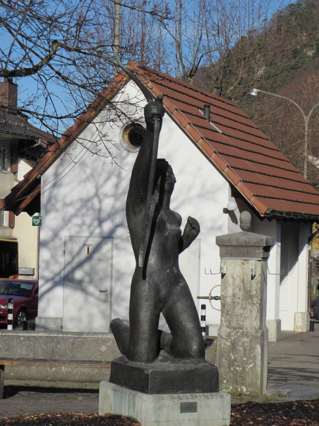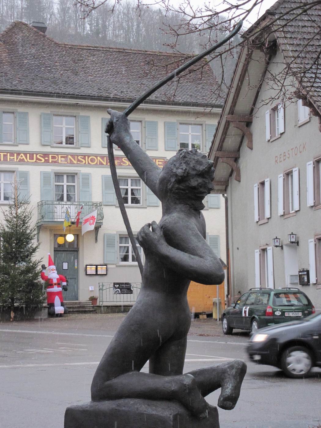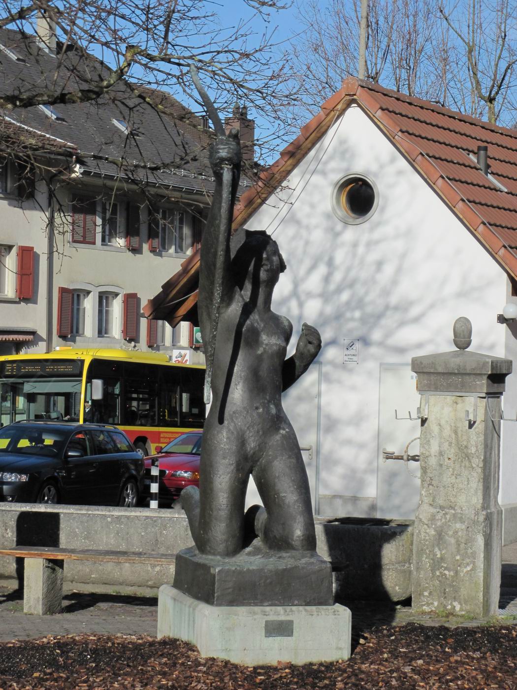 Sie kam nach Aussagen von Leuten aus der Bevölkerung nach 1984 nach Reigoldswil. Jemand hatte die Vermutung geäußert, dass sie vorher im Garten der Universität gestanden hatte - oder auch in Liestal bei der Basellandschaftlichen Hypothekenbank. 1976 stand jedoch die Original-Gipsplastik auf dem Areal jener Basellandschaftlichen Hypothekenbank (Chronik BL). Es könnte sich hier auch um einen späteren Abguss handeln. Diese Plastik ist nicht im Guss, sondern auf einer Zusatztafel signiert bzw. beschriftet. Weiter ist zweifelsfrei Abguss fotografisch bezeugt, welcher (vermutlich um 1980) vor der Regio-Bank in Liestal stand.