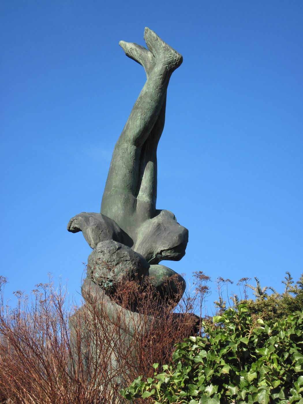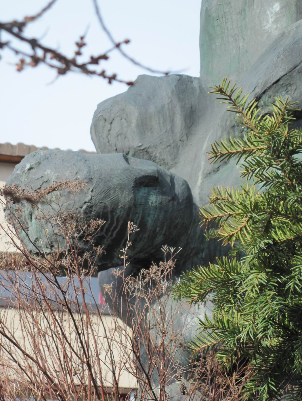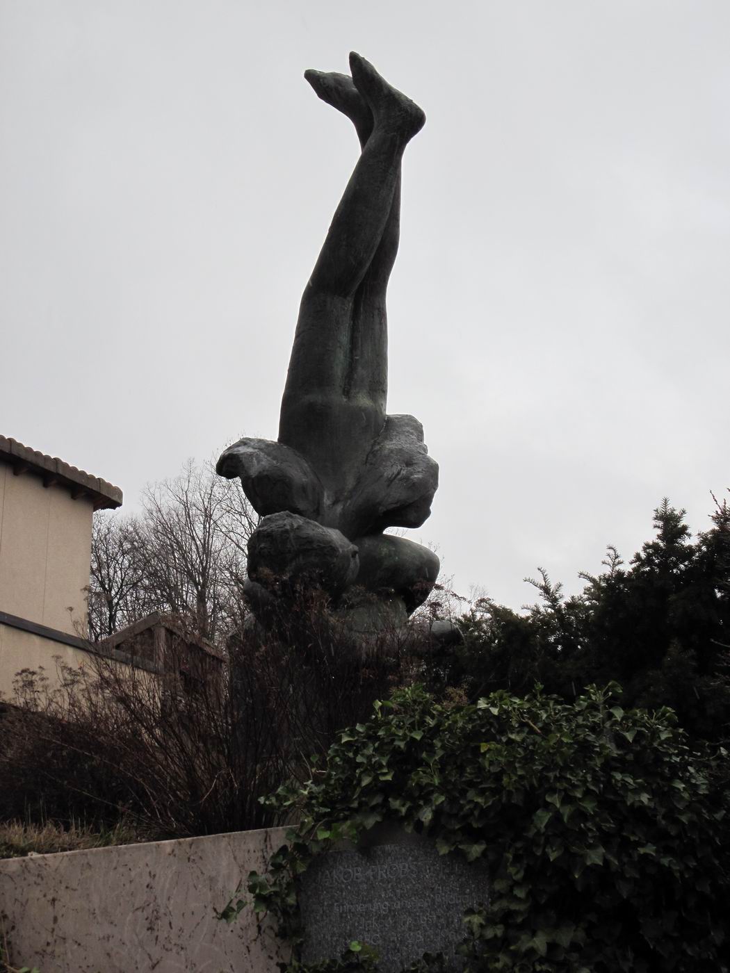 Die Ironie des letzten Bildes: "Ikarus Sturz in den Blumentopf" Da stürzt also Ikarus - und wohin? - Ins Gebüsch im großen Blumentopf? - Zentral wichtig für ein Kunstwerk dieser Art wäre es doch, wenn man seine Hauptsache sehen könnte. Hier zur Hauptsache gehört der Gesichtsausdruck des Stürzenden unten beim Aufprall. Und genau diesen kann man nicht sehen, einmal wegen dem Gebüsch. Dann wenn das Gebüsch geschnitten ist weiter wegen der Lage: Man müsste eine Klettertour wagen um das Gesicht zu Gesicht zu gekommen. - Viel zu gefährlich für die Kunstfreunde der älteren Generation. Also müsste eine Rampe gebaut werden, die einfach zu besteigen sein sollte, auch mit dem Rollstuhl... Jakob Probst selbst hatte angeblich die Platzierung der Skulptur auf einer Säule gewünscht. Schade, dass man diesen für die Skulptur gerechten Wunsch trotz seiner geringen Kostenfolgen nicht realisieren wollte oder konnte. Das Hindernis, der Einwand, welcher auf Gefahren gründet, ist eben ein besonderer Einwand, der eine bessere Lösung fordert. So steckt Ikarus, von der Strasse her weithin sichtbar, im Gebüsch. Gibt es nun keine würdigere, bessere Lösung? (Angeblich habe man von der Seite der Behörden keine Säule gewollt, weil eine solche die "Autofahrer auf der Durchgangsstrasse hinter dem nächsten Haus hätte ablenken können...") |