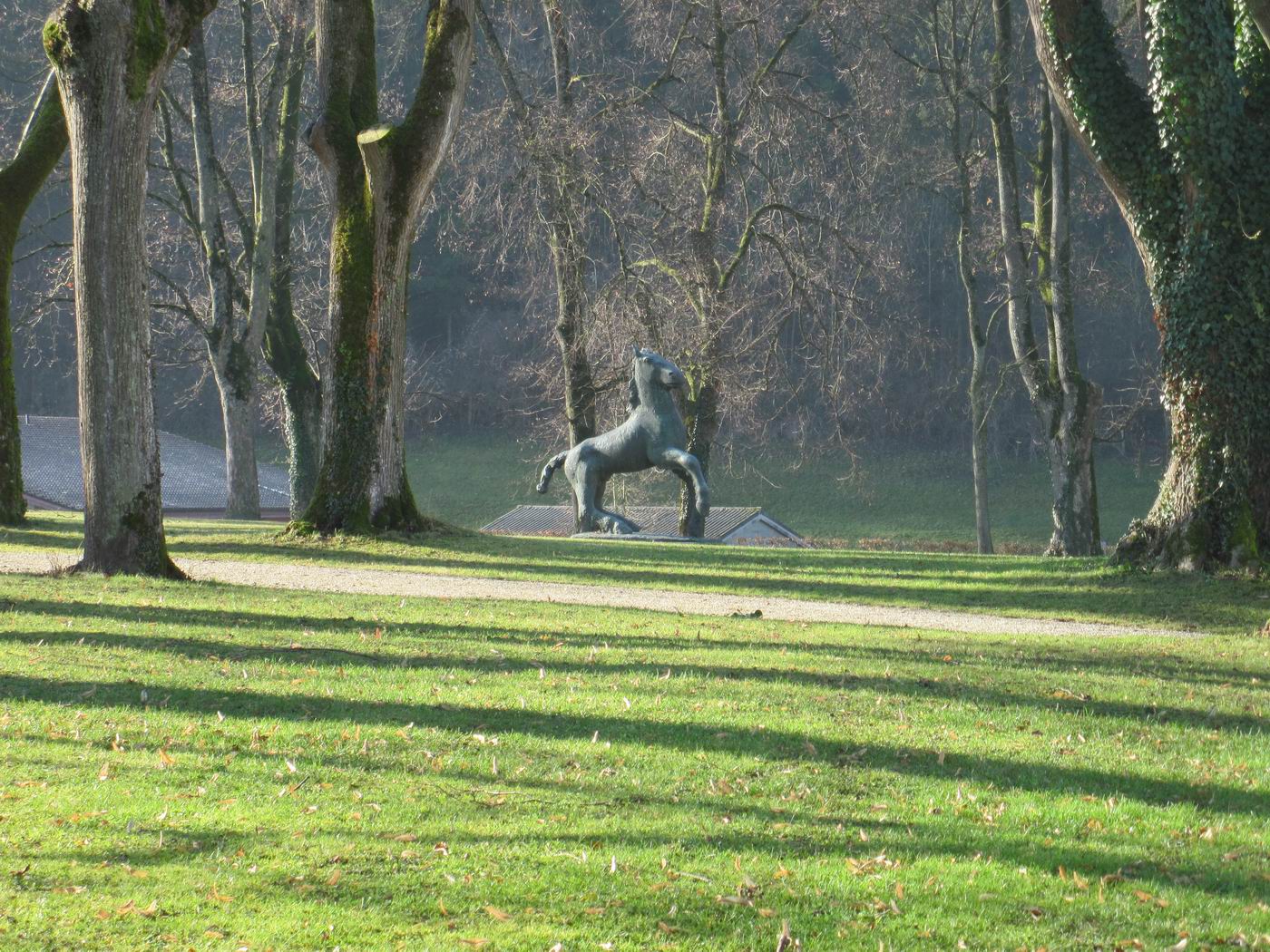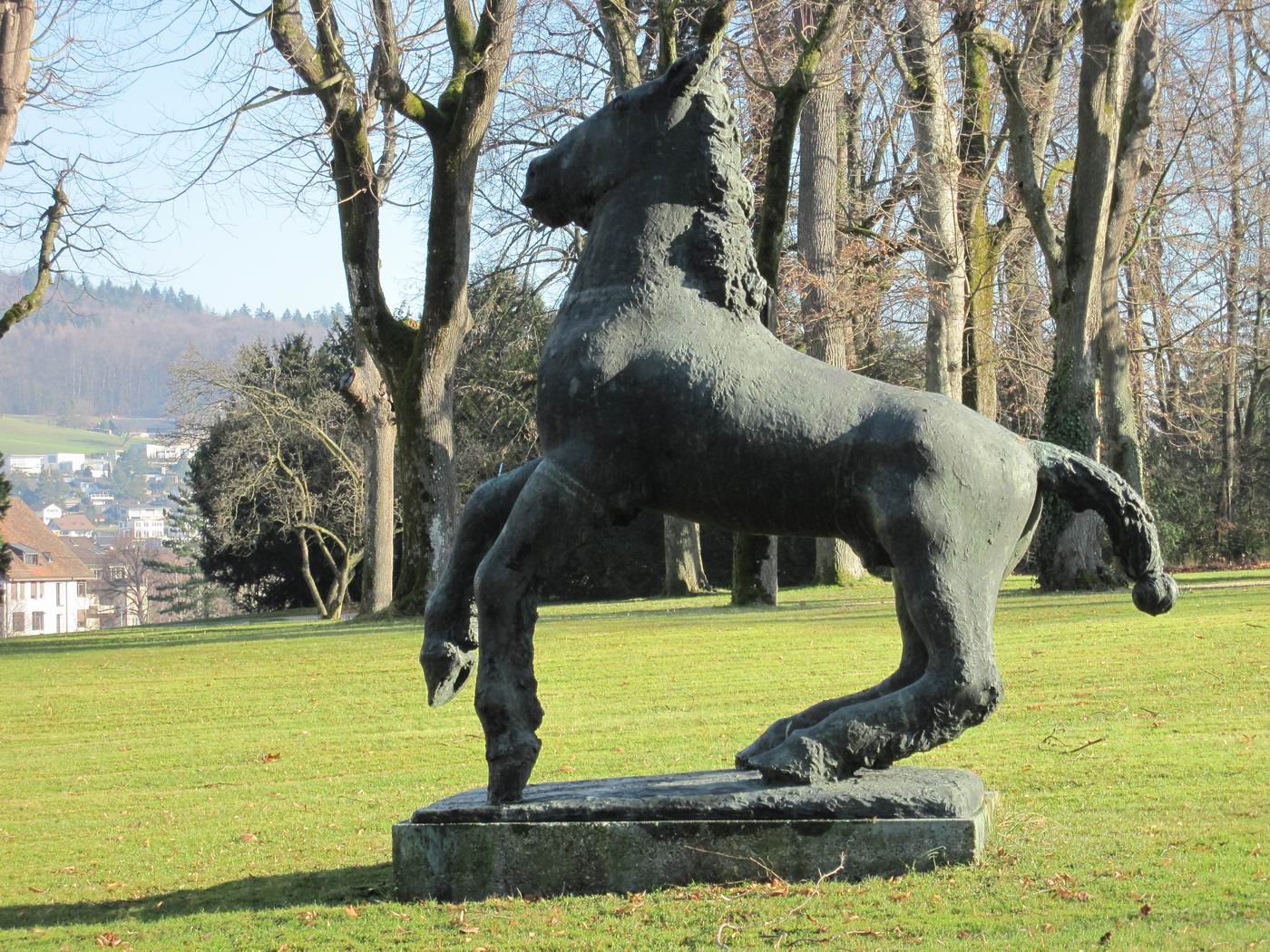 1965: Der Kanton Baselland beschließt am 13.9.1965 eine Ehrenausstellung im Schloss Ebenrain (Sissach) zu Ehren des am 17.8. 1965 nun 85 Jahre alt gewordenen Bildhauers Jakob Probst durchzuführen. Zum Anlass dieser Ehrung sprach der Kanton einen Kredit von damals sFr. 60'000.- für den Ankauf des Puledro (überlebensgroßer jungen Hengst, Bronze, gegossen in Mendrisio) zur längst fälligen Ausschmückung des Kantonsspitals. Das Geld wurde gesprochen für den künstlerischen Wert, den Guss des Werkes, den Transport nach Liestal, die Aufstellung (Anm.: damals) in der genannten Anlage. Damals konnte man sich für diese Summe auf dem Lande ein Einfamilienhaus kaufen. |