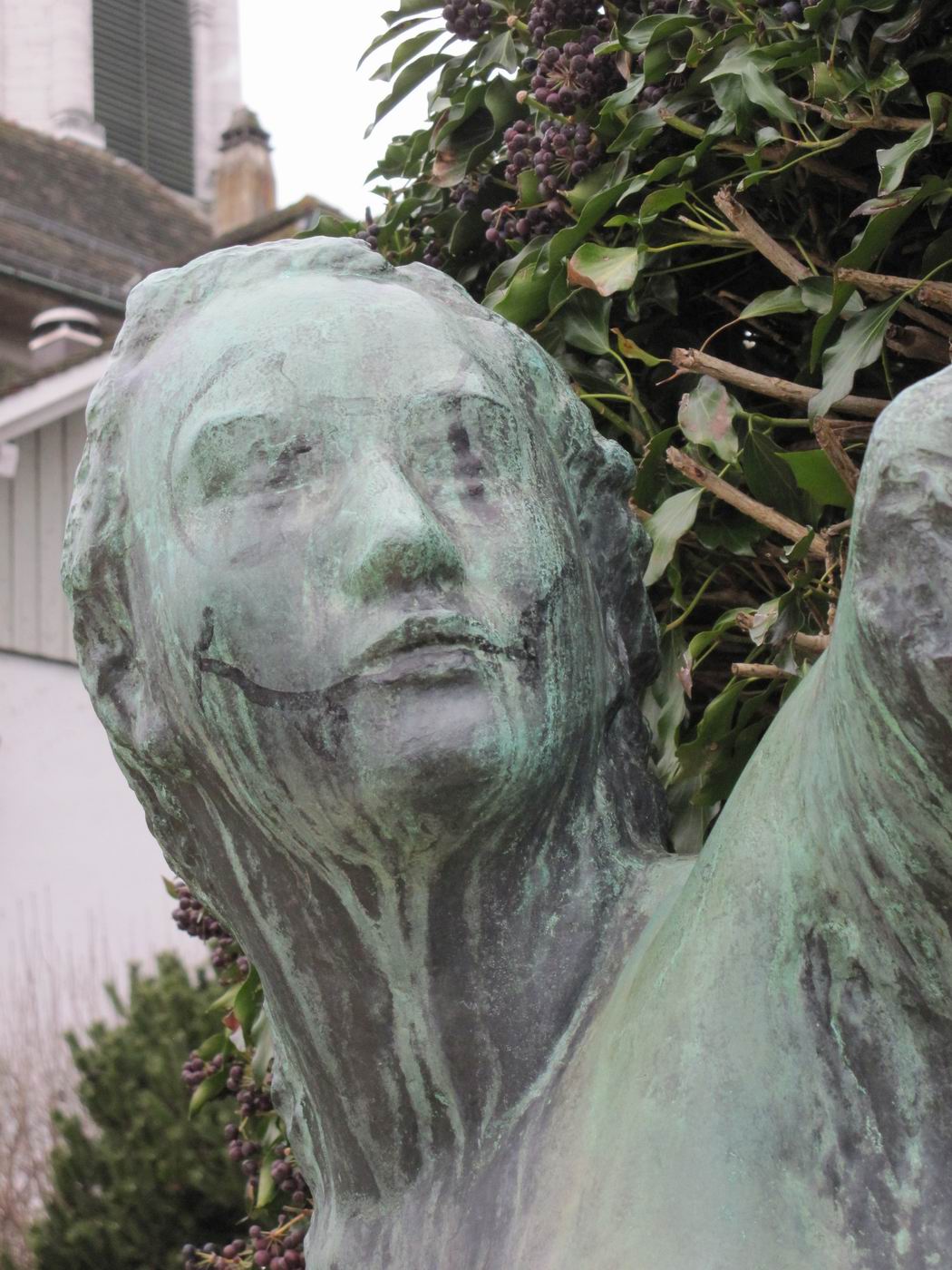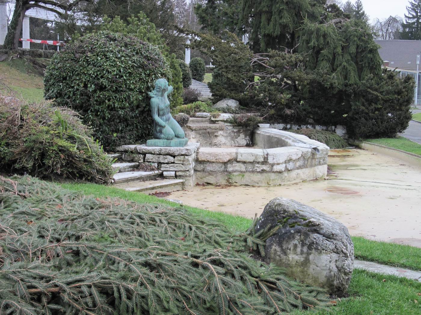 Aus dem einen der Bein wächst noch der Fuß: Sie befindet sich in Verwandlung. Die Hände werden dann kommen. War sie vorher Fisch? Die so unbewegliche, auf das Ende des Geschehens wartende Dame muss einem kindlichen Geiste begegnet sein, der sie in während diesem Geschehen auf seine ihm mögliche Weise versucht hat zu verschönern. Ein Kobold, versteht sich. Schade, denn die untrennbar mit ihrem Ort verknüpften Bilder können nun nicht mehr geändert werden. Der Kobold wollte es so. Kann man solche Wesen nicht erziehen - oder wenigstens an die Leine nehmen - ? |